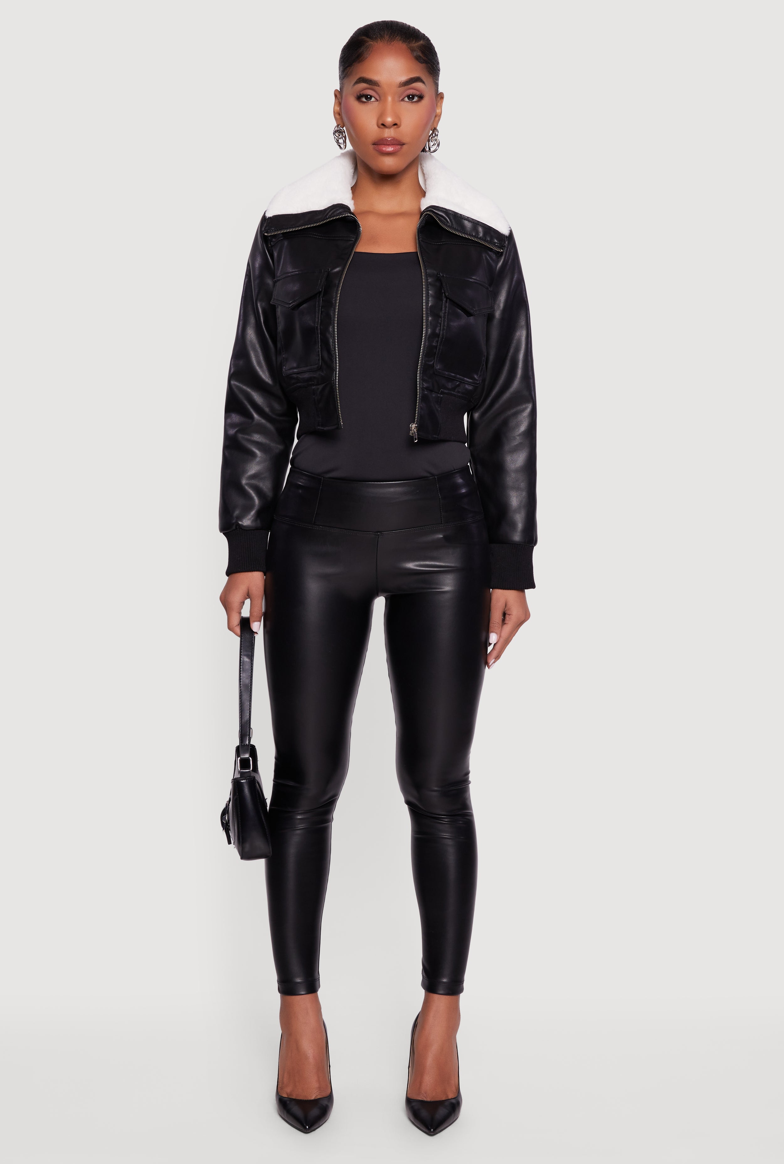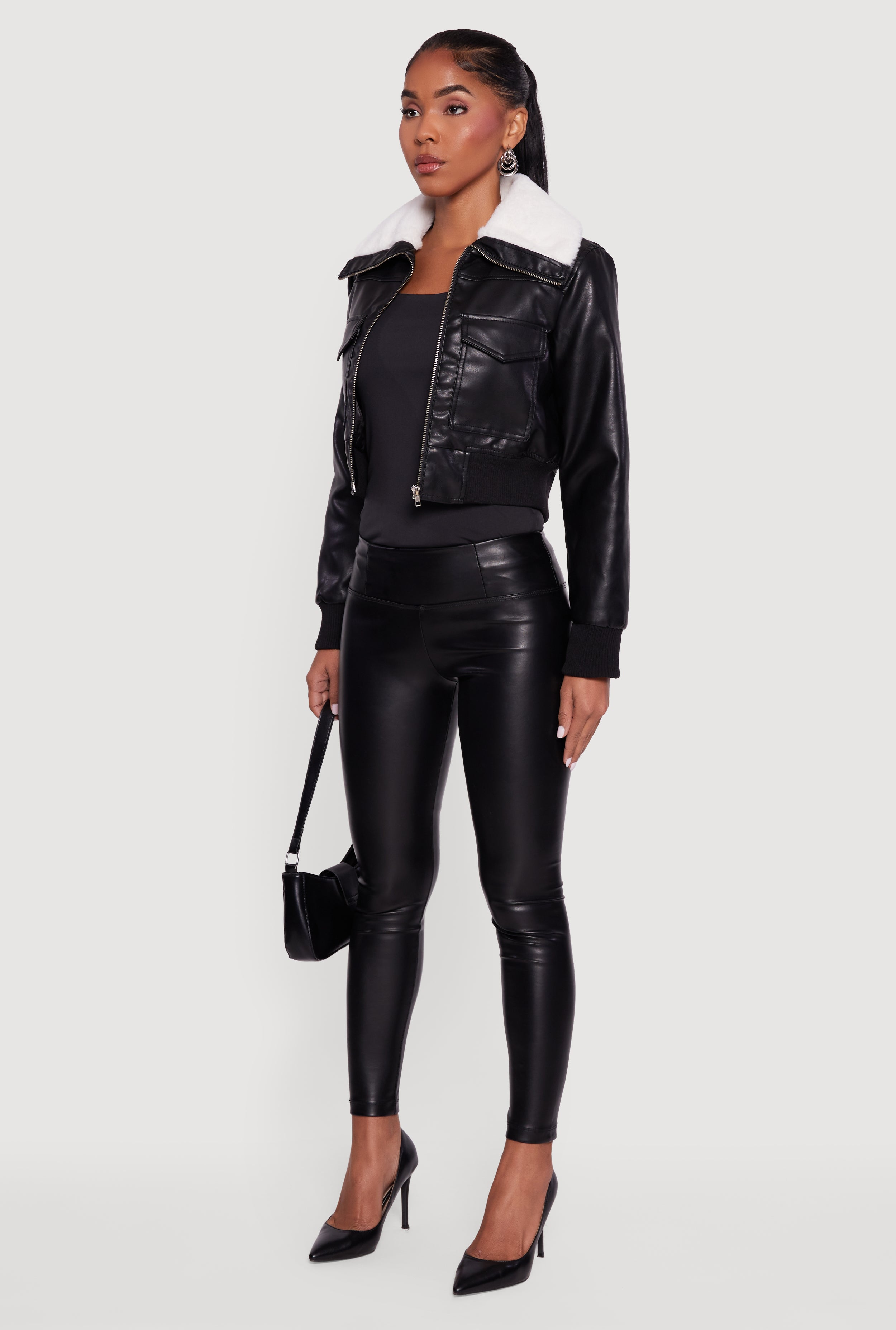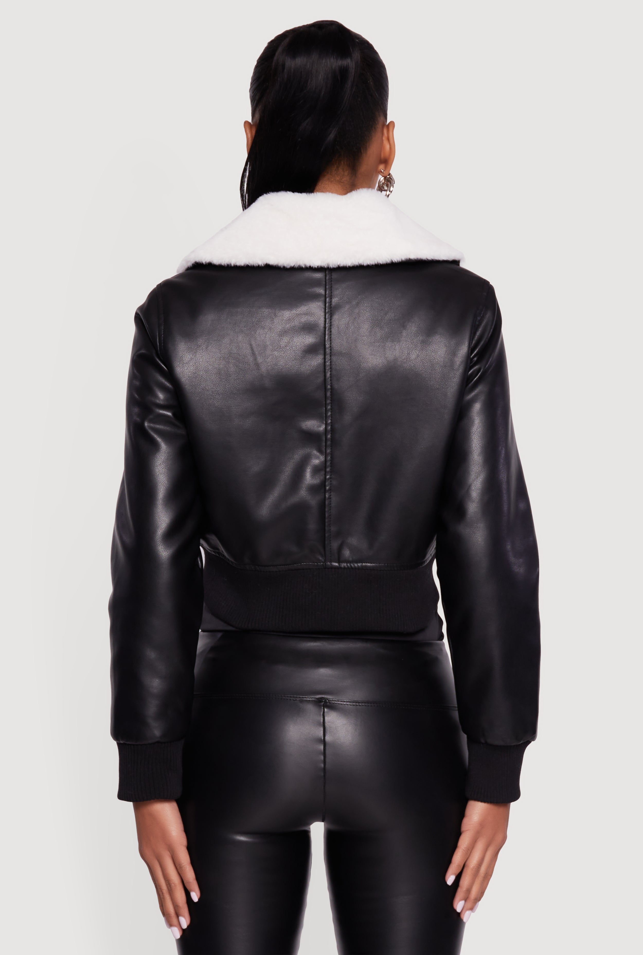 Stay effortlessly cool and cozy with the Sherpa Collar Cropped Faux Leather Jacket. This casual bomber jacket features a trendy cropped fit and a soft sherpa-lined shawl collar that adds a touch of warmth and style. The ribbed knit cuffs keep the chill out while the sleek faux leather exterior brings edge to any outfit. Perfect for layering on those crisp days, it zips up easily for a snug, flattering fit that pairs perfectly with your favorite jeans or skirts.