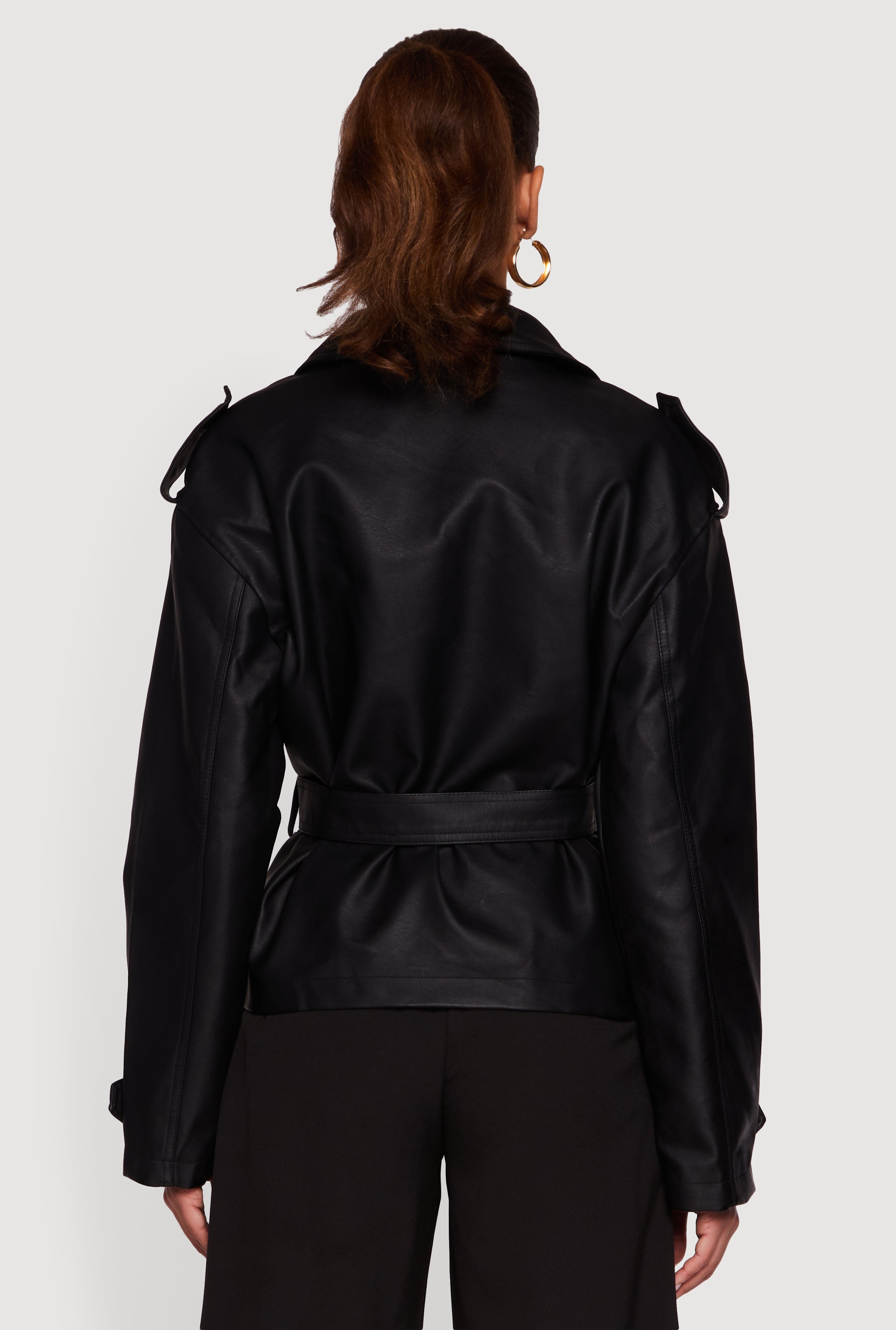 Step up your style game with this Faux Leather Double Breasted Short Trench Coat. Designed for the trend-savvy and budget-conscious, this coat blends edgy faux leather with a classic trench silhouette for a streetwear-ready look. The button front and tie waist belt let you customize your fit while keeping things effortlessly cool. Perfect for casual days when you want to make a statement without trying too hard.