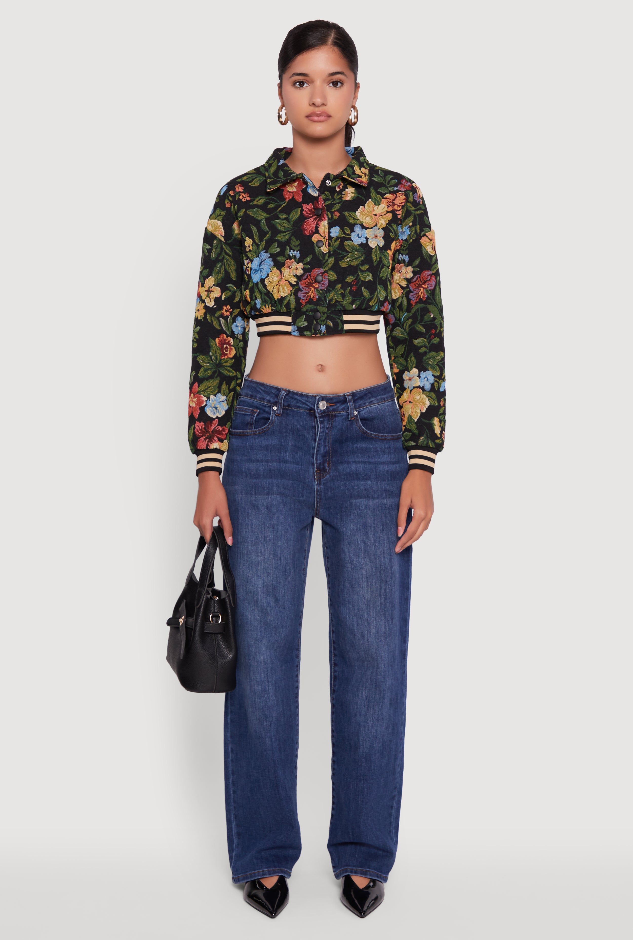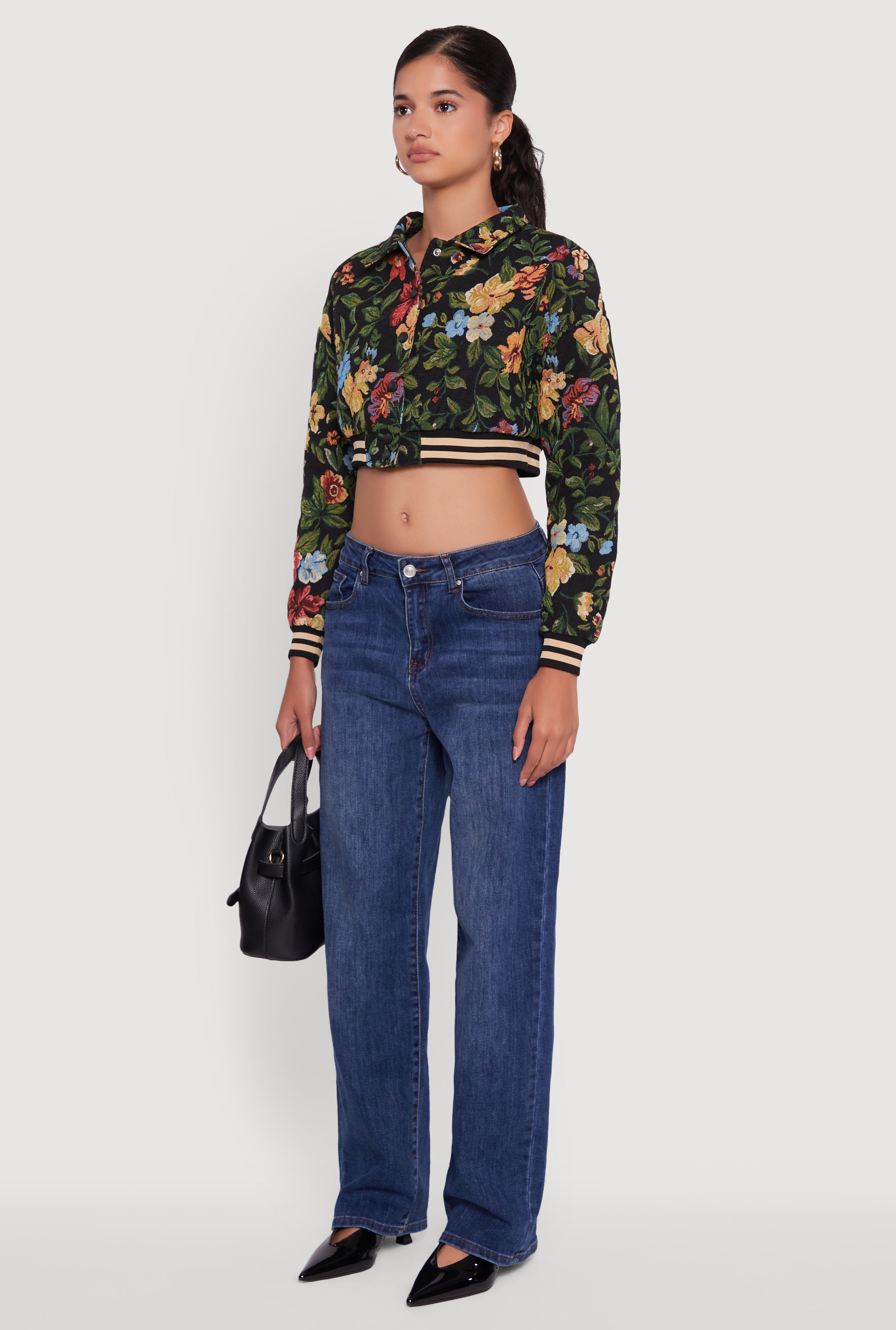 Step up your style game with the Floral Jacquard Cropped Bomber Jacket by Daisy. This playful jacket blends casual vibes with a trendy edge, featuring eye-catching embroidered floral jacquard and varsity stripe details that make every outfit pop. The snap button front and collared neckline add a cool, easygoing touch, while the bubble sleeves bring a fun, flirty twist. Perfect for layering on those breezy days when you want to look effortlessly chic without breaking the bank.