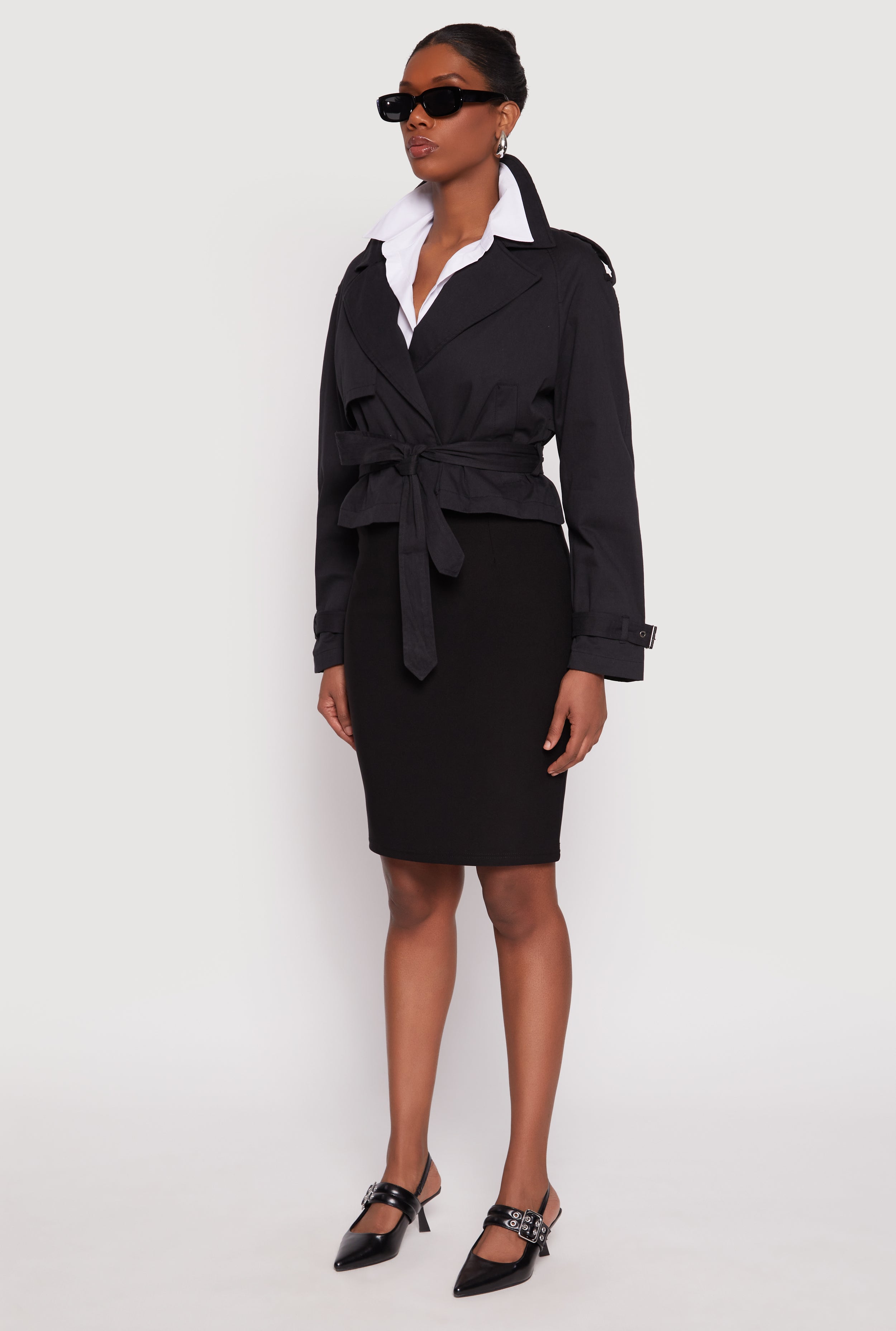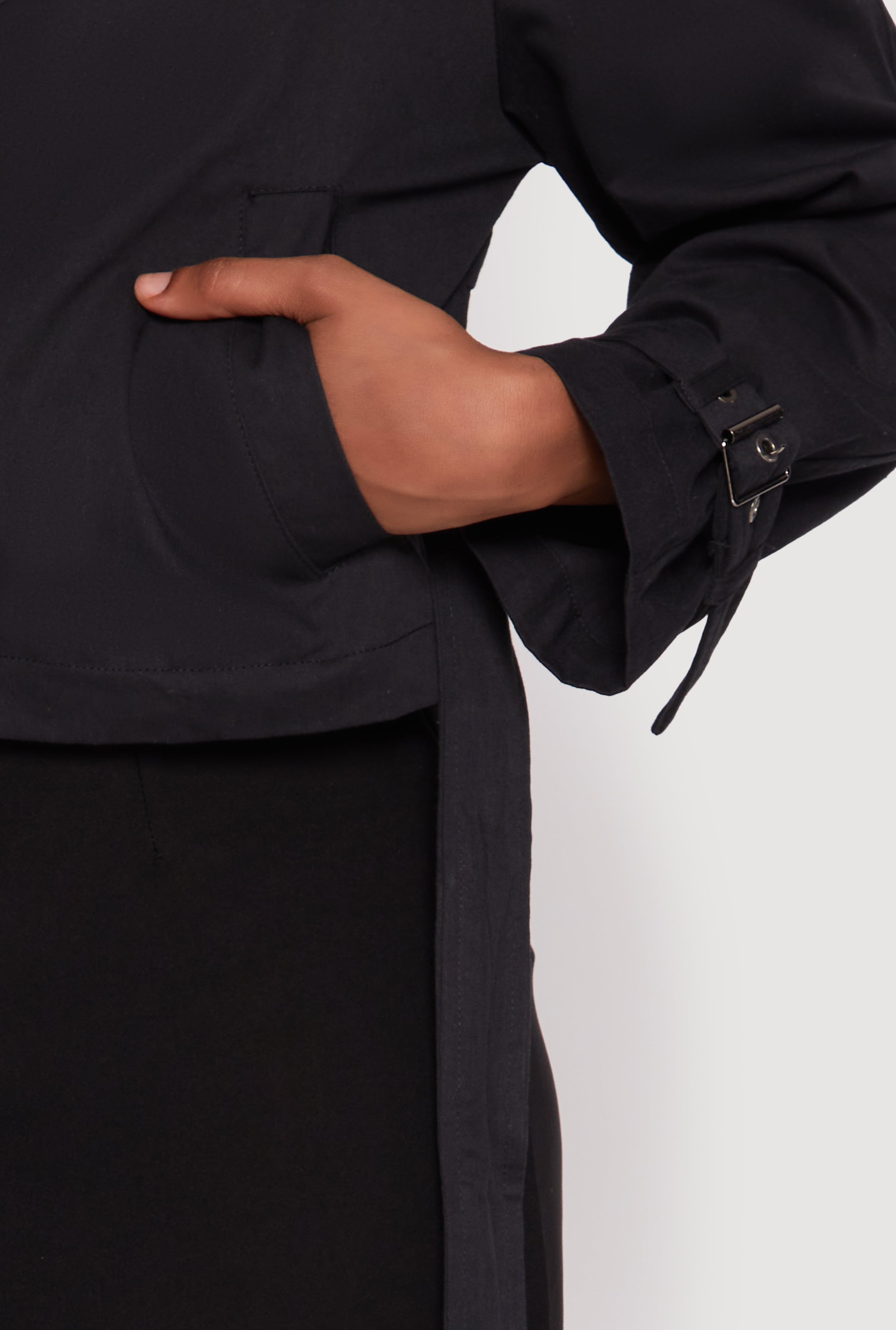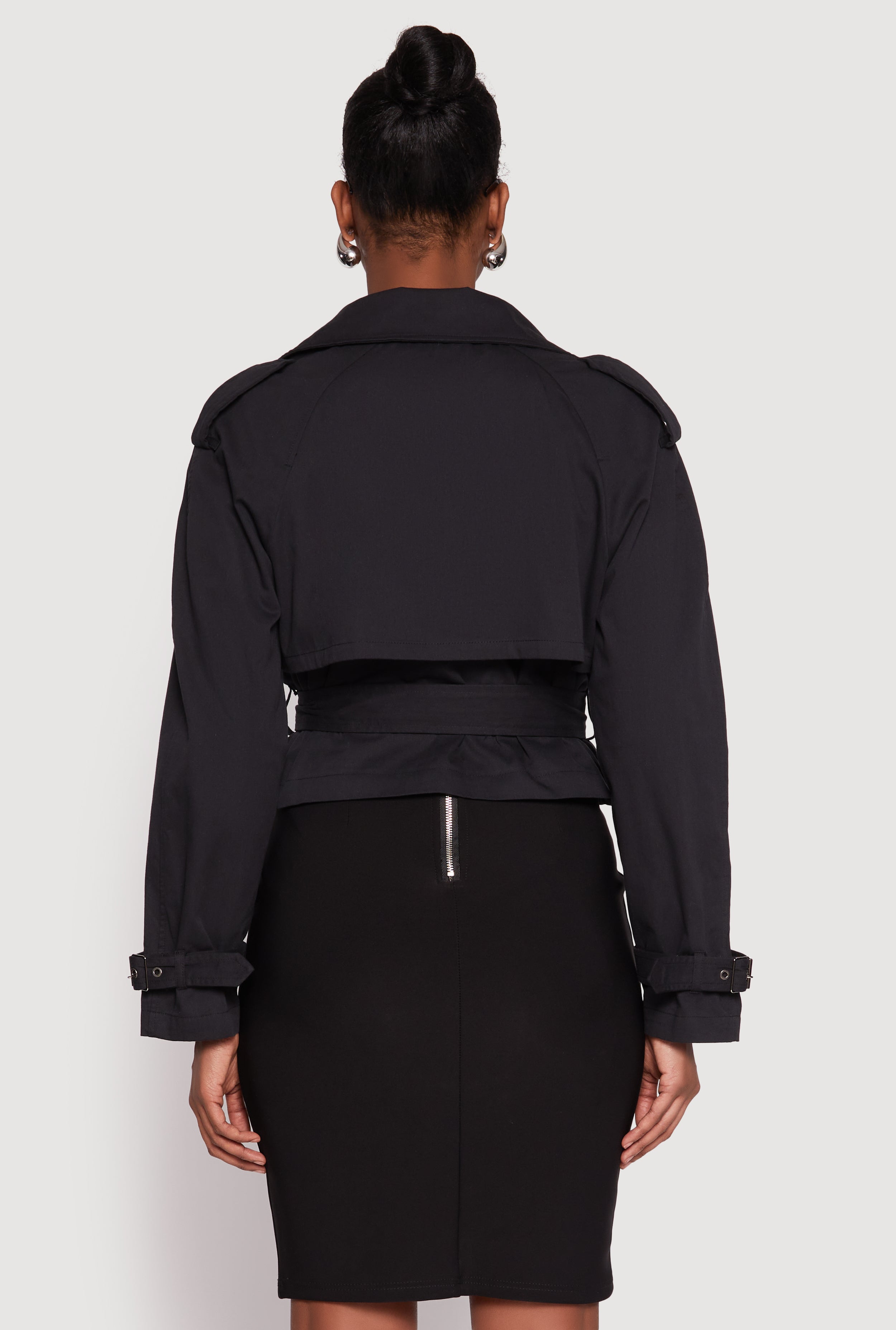 - Stylish cropped hem adds a contemporary vibe to a classic trench design