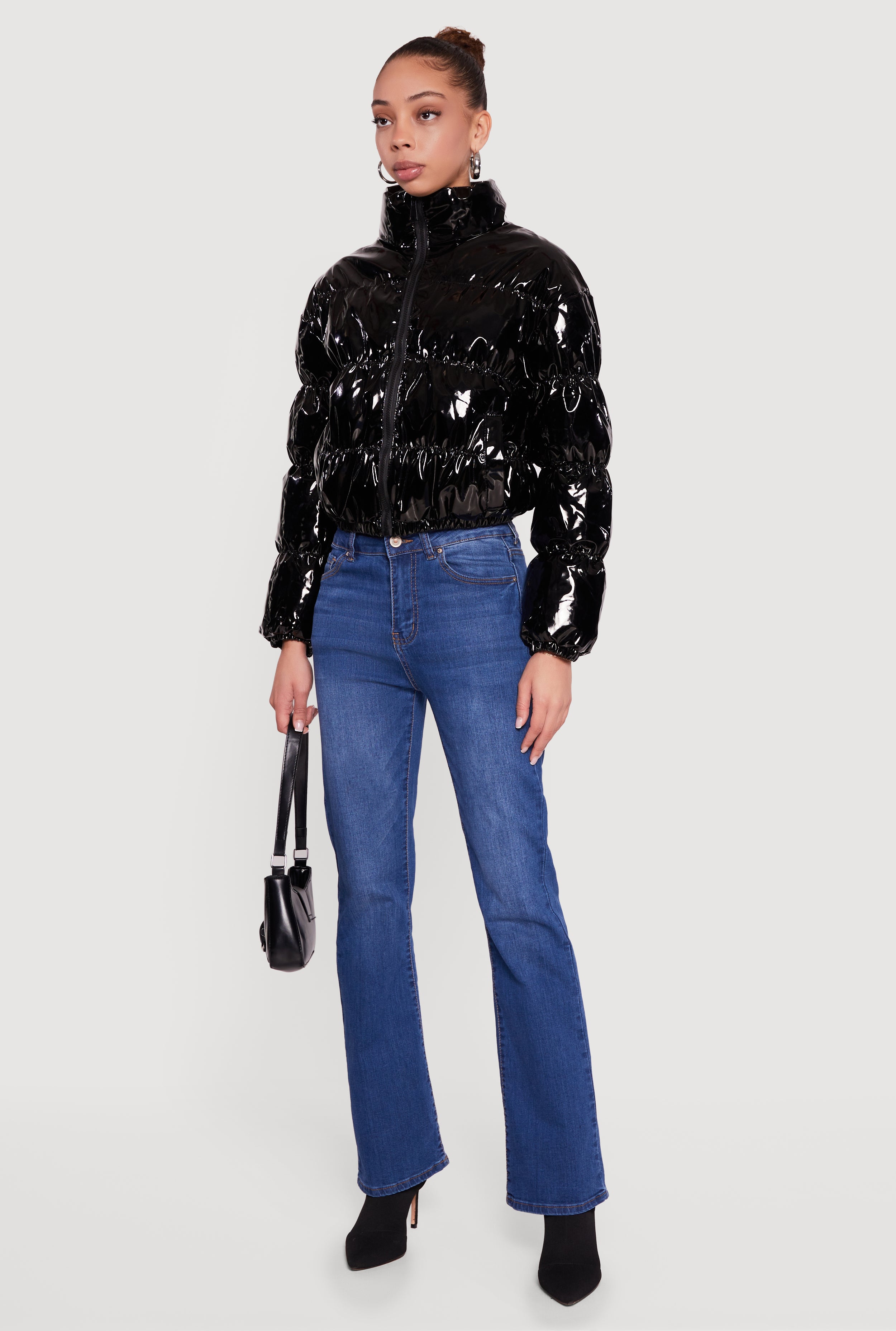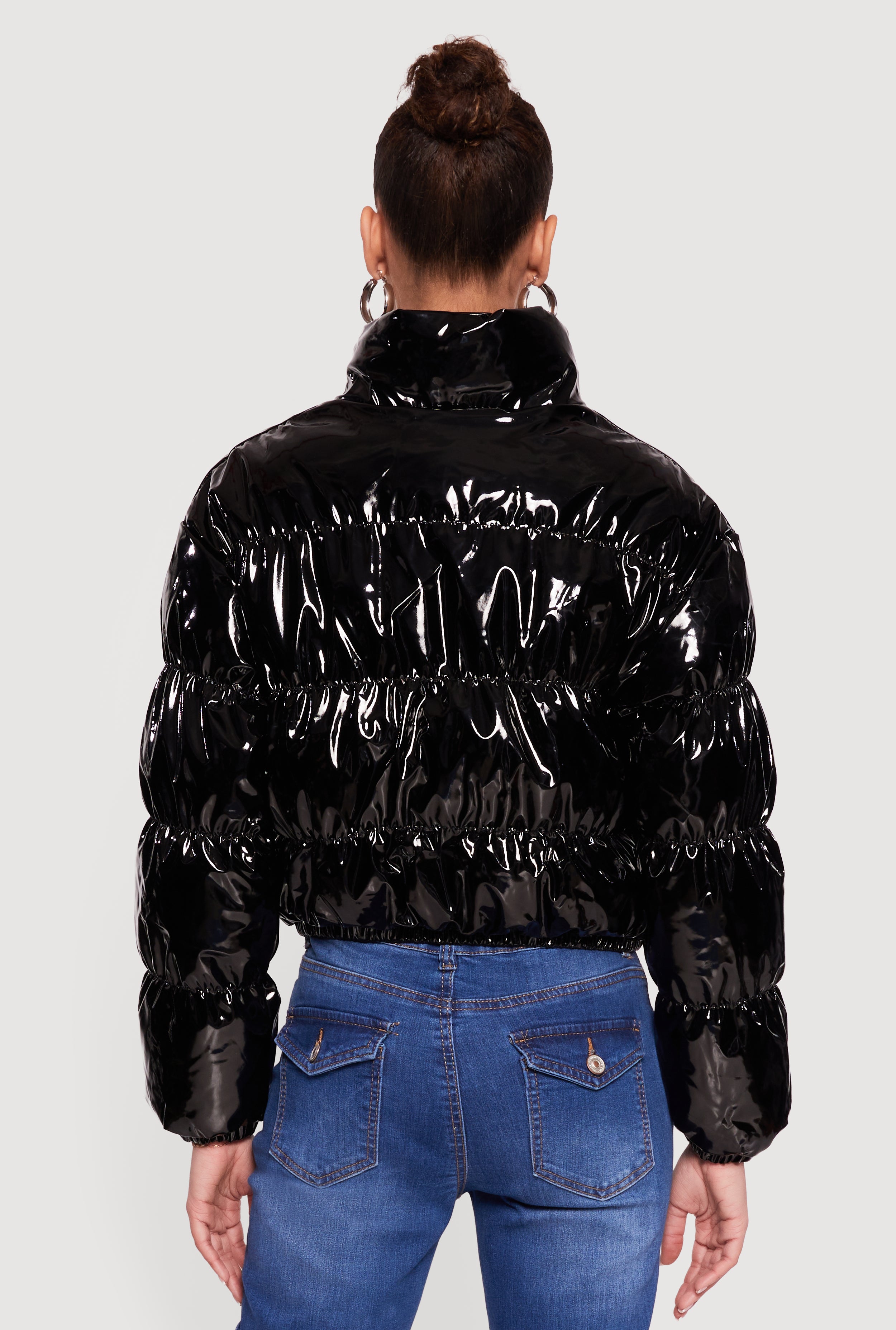 This quilted puffer jacket features a mock neck and long sleeves, designed with a zip front closure for easy wear. Its 18 inch length offers a balanced silhouette perfect for layering. Lightweight yet warm, it’s an ideal outerwear piece for chilly days. Designed with a glossy patent leather–inspired finish that adds bold, statement-making shine.