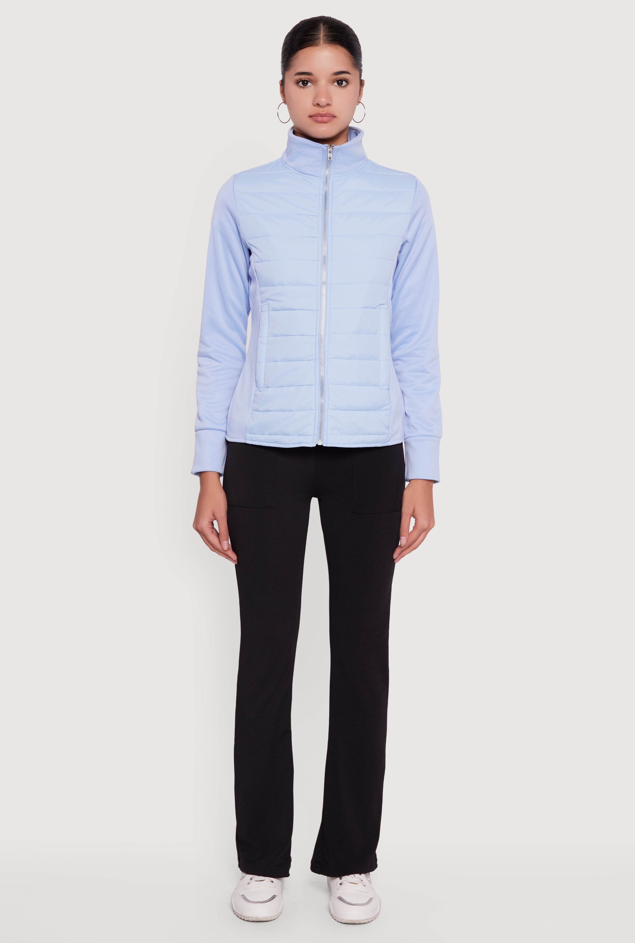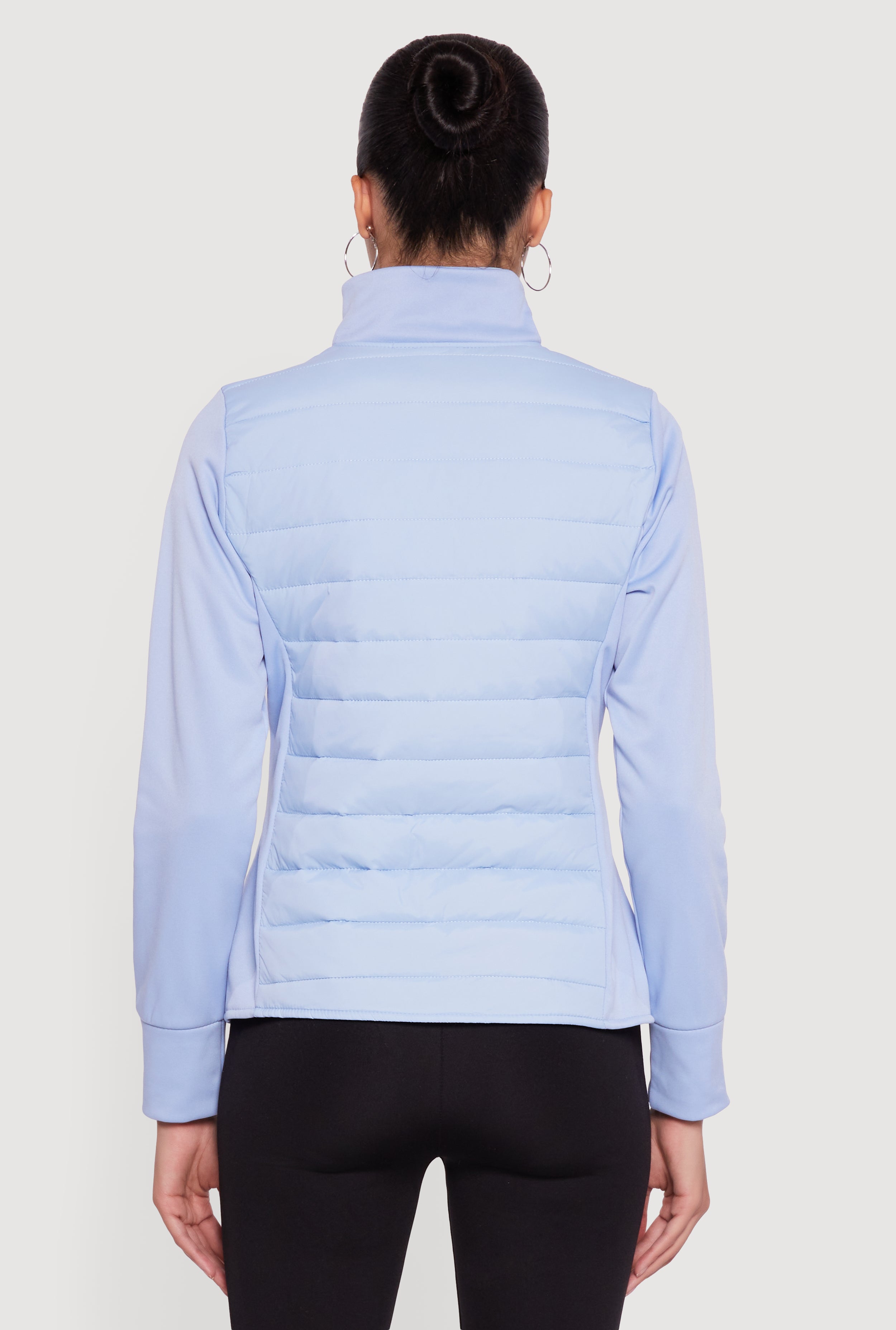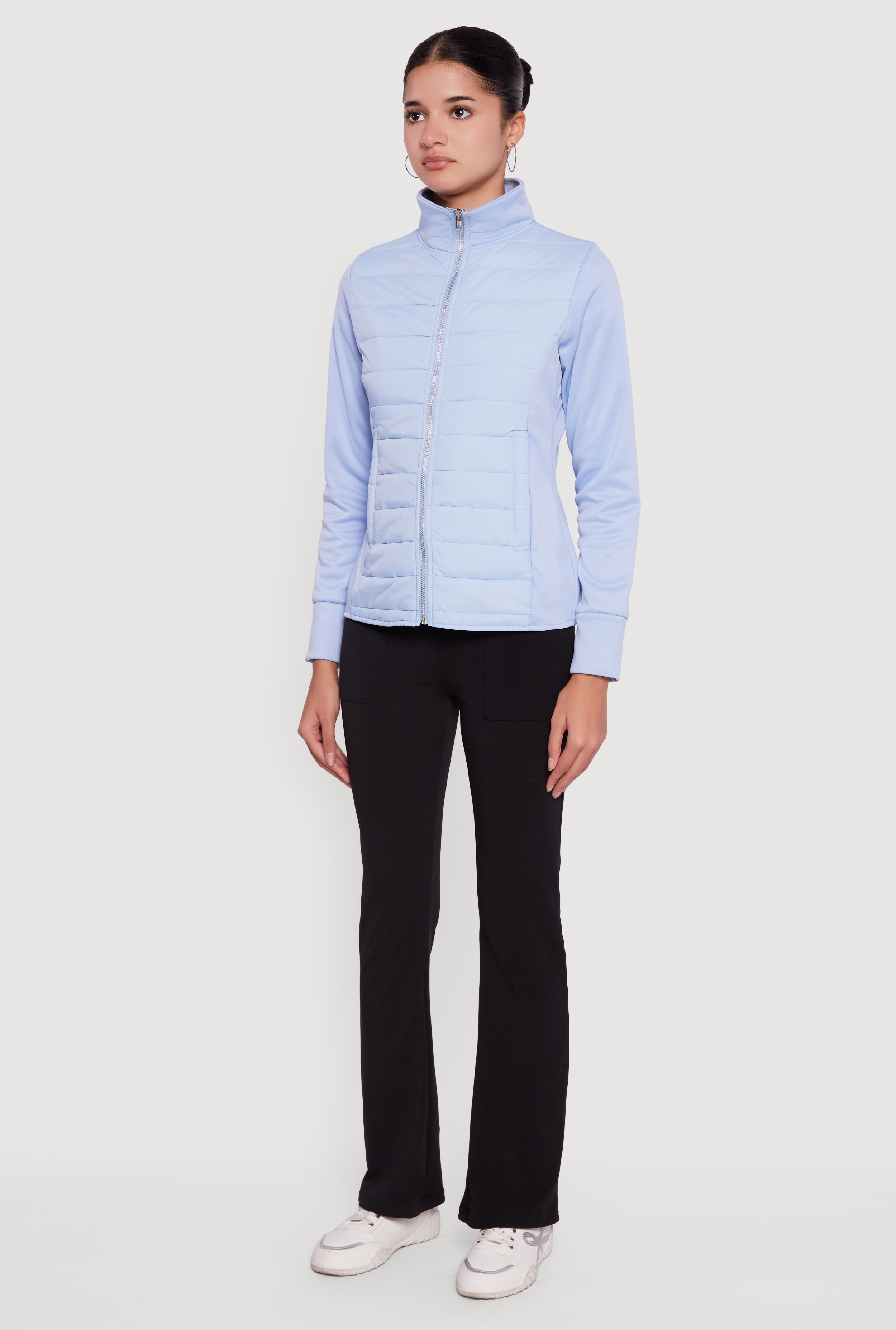 Stay cozy and stylish with this Fleece Lined Long Sleeve Hybrid Quilted Puffer Jacket. Designed for casual days, this piece features a sleek mock neck and a zip-front closure that keeps the chill out while adding a modern edge. The lightweight nylon exterior pairs perfectly with soft fleece lining for warmth without bulk. Zip pockets offer secure storage for your essentials, making it as practical as it is cute. Whether you're running errands or meeting up with friends, this jacket is your go-to for effortless cool and comfort.