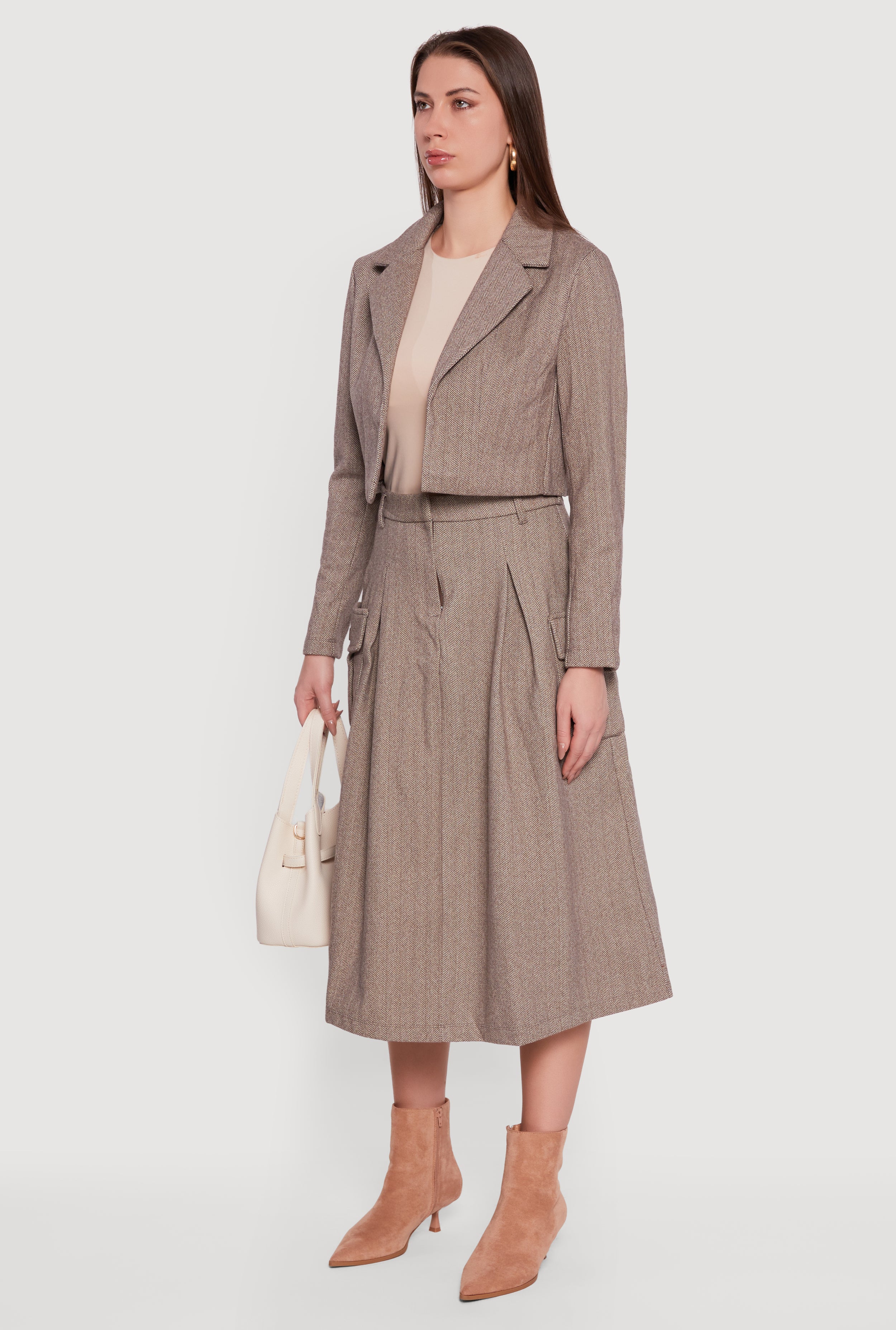 Cropped Open Front Herringbone Blazer