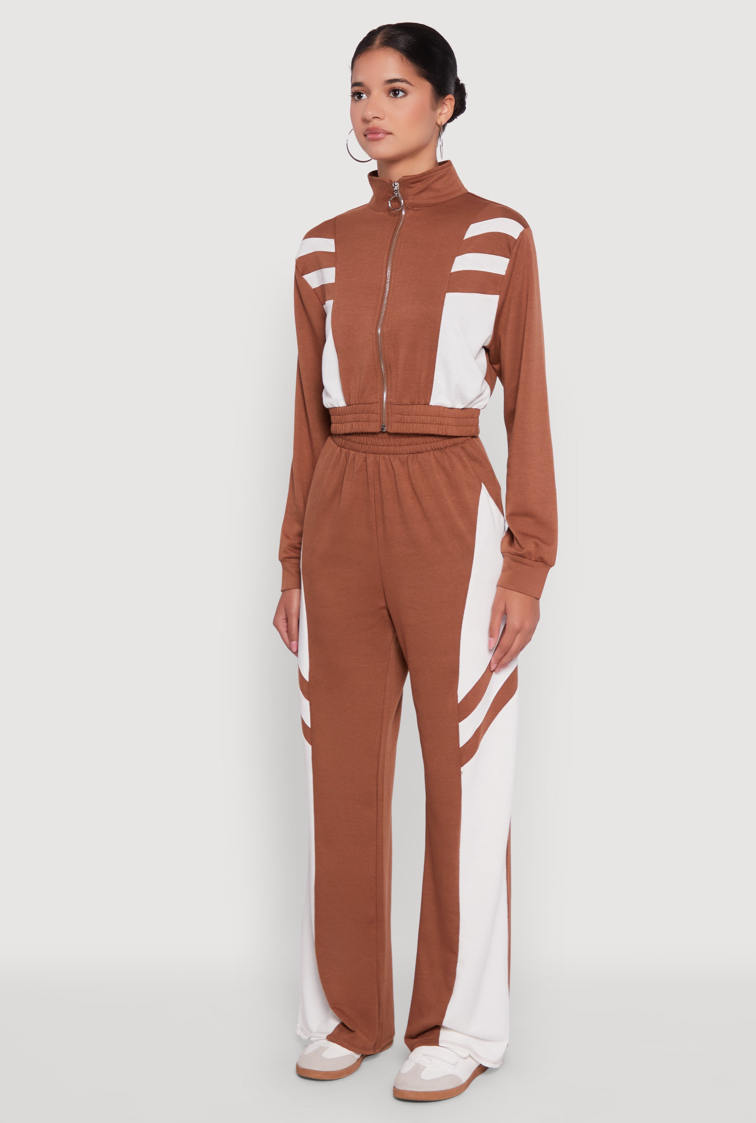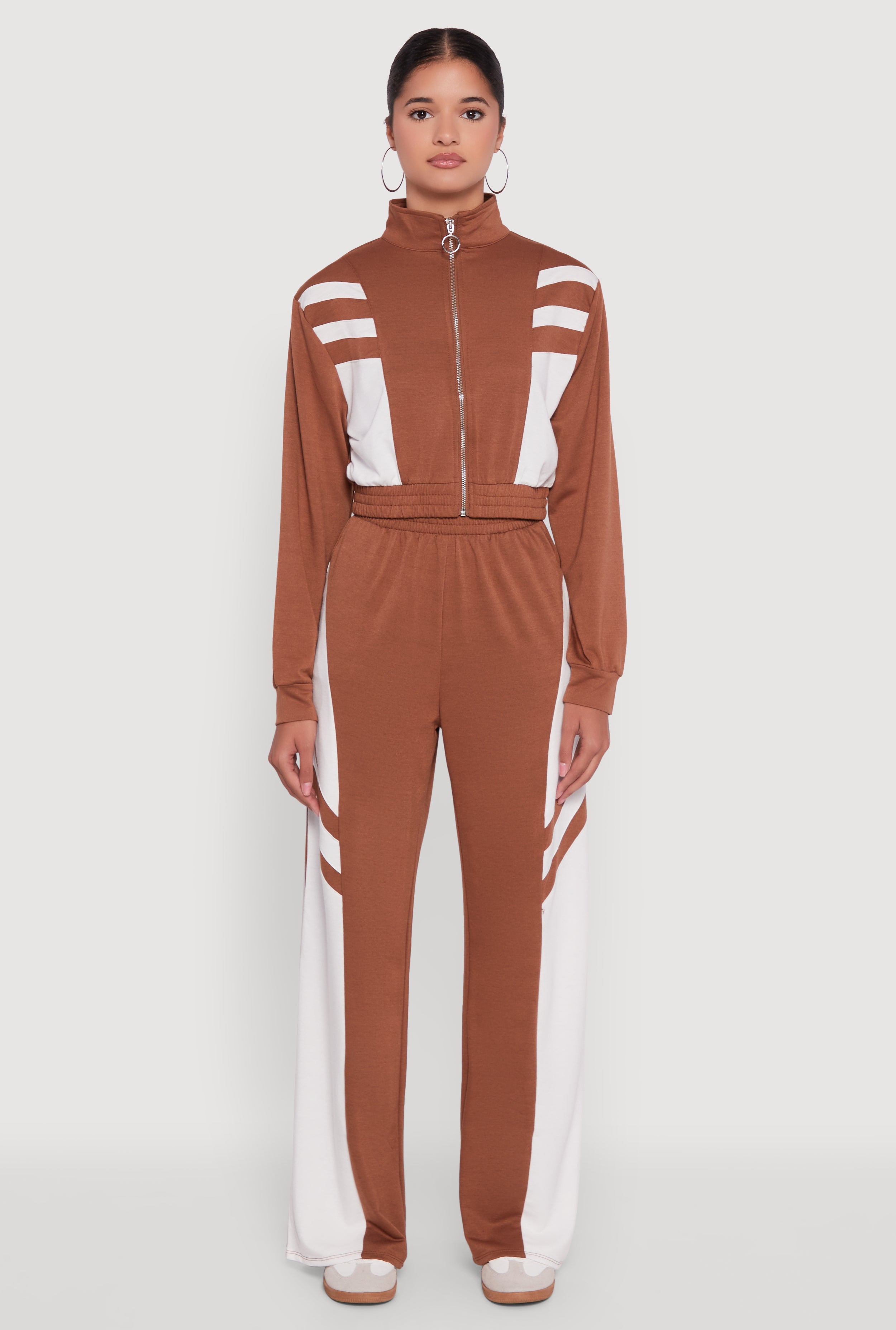 Elevate your everyday look with the Color Block Cropped Zip Front Track Jacket. This effortlessly cool jacket combines sporty vibes with street-ready style, perfect for those who want to stay comfy and on trend. The eye-catching color block design and sleek O-ring zipper add a playful twist to your casual wardrobe. Whether you're running errands or chilling with friends, this French Terry jacket has got your back with a flattering cropped fit and a cozy mock neck that keeps things fresh and fun.