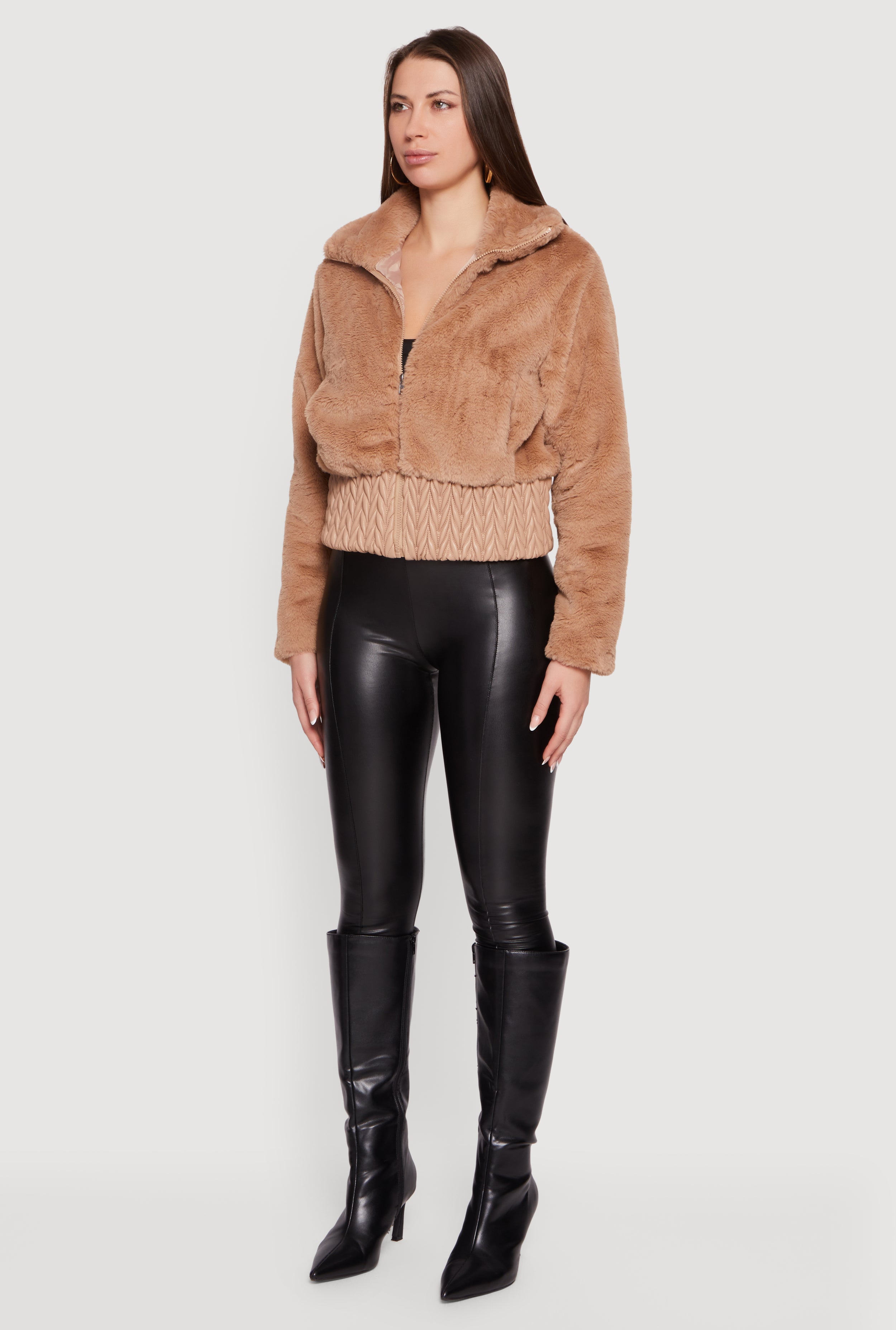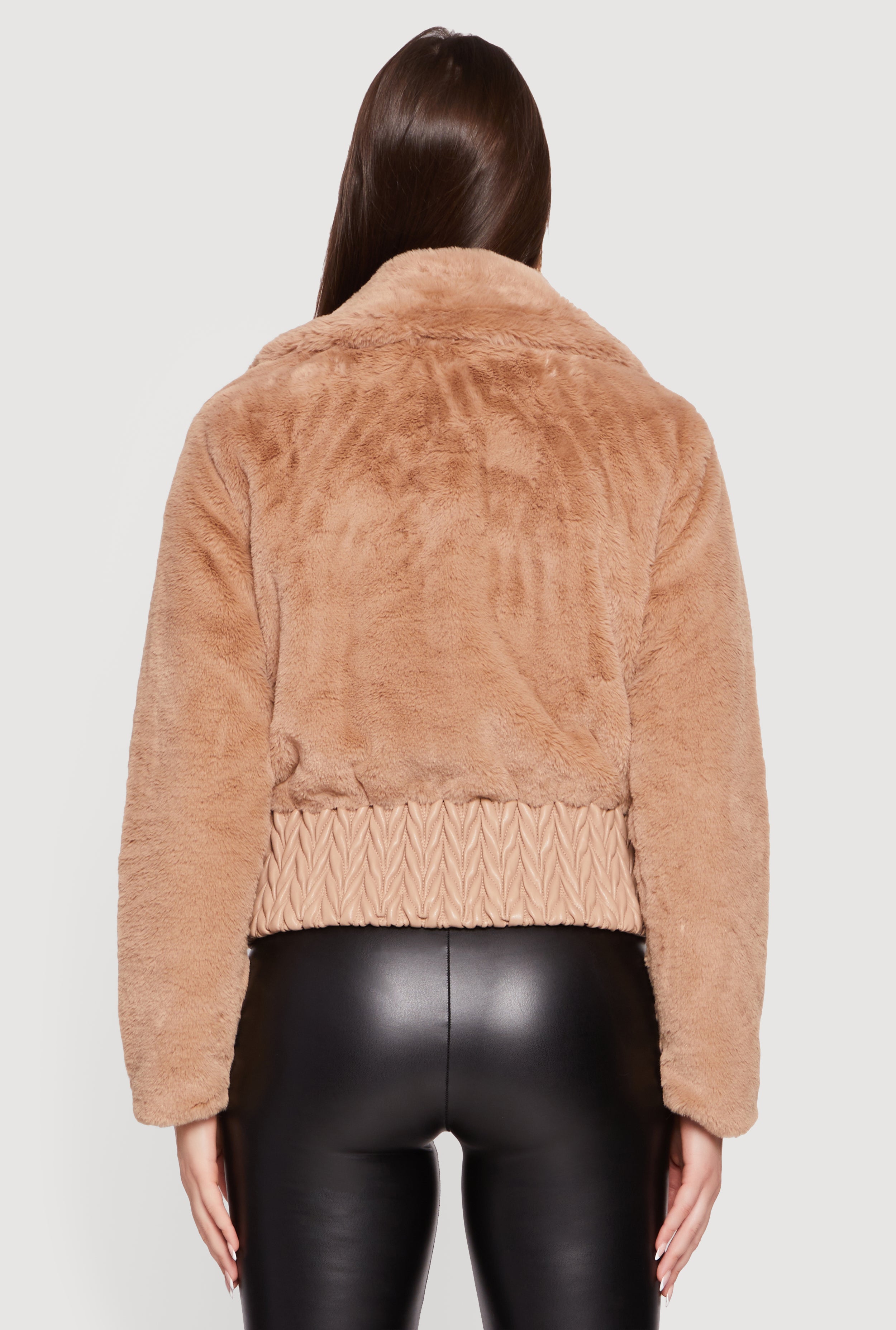 Faux Leather Chevron Trim Zip Front Faux Fur Jacket