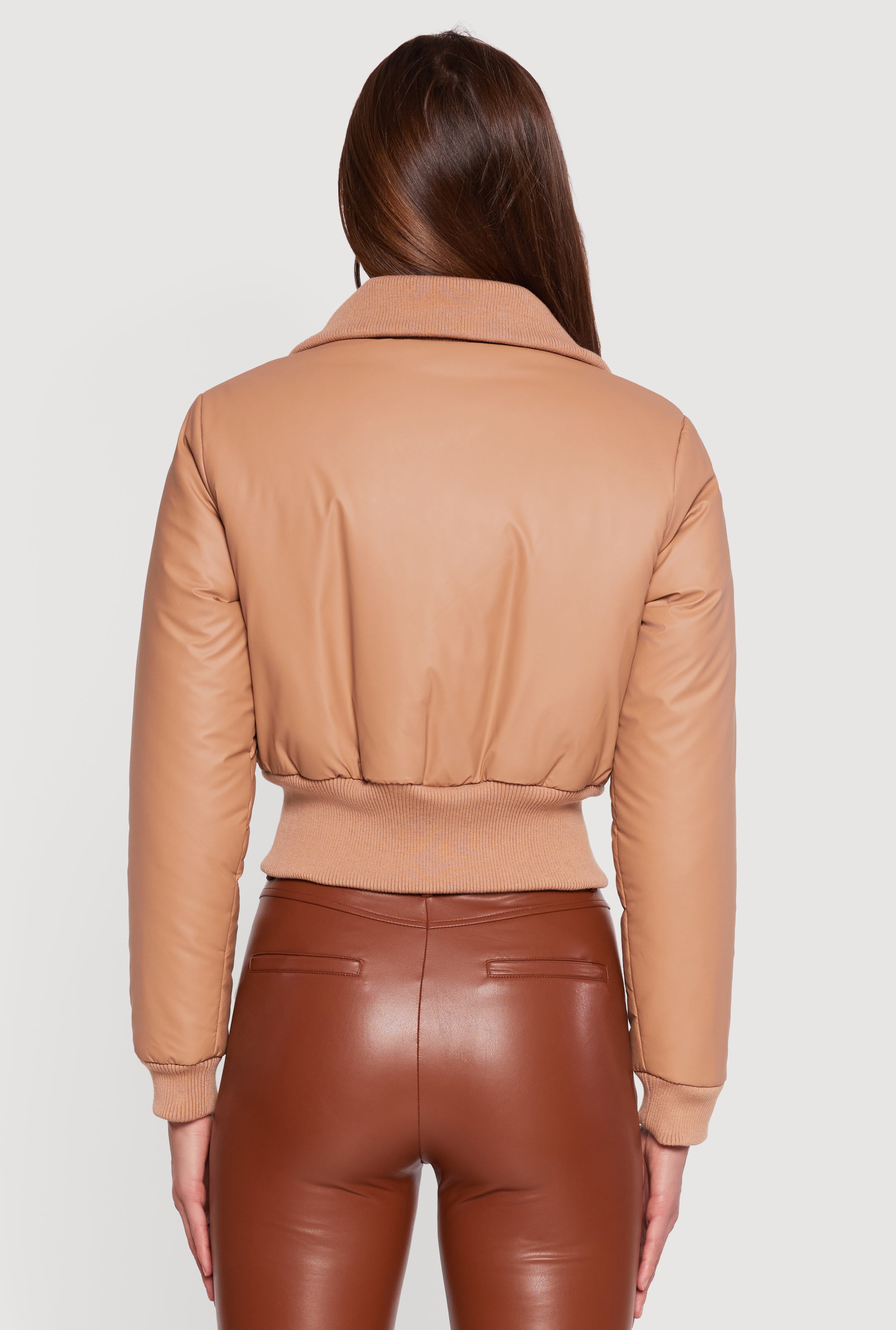 Step up your style game with this Faux Leather Insulated Cropped Bomber Jacket. Designed to keep you cozy without sacrificing edge, this jacket features a sleek faux leather finish and a trendy cropped cut that pairs perfectly with high-waisted jeans or skirts. The insulated lining adds warmth for those chillier days, while the zip closure and faux pocket zip details bring a cool, urban vibe. Whether you're heading out for a casual day or a night on the town, this jacket is your new go-to for effortless, street-smart style.