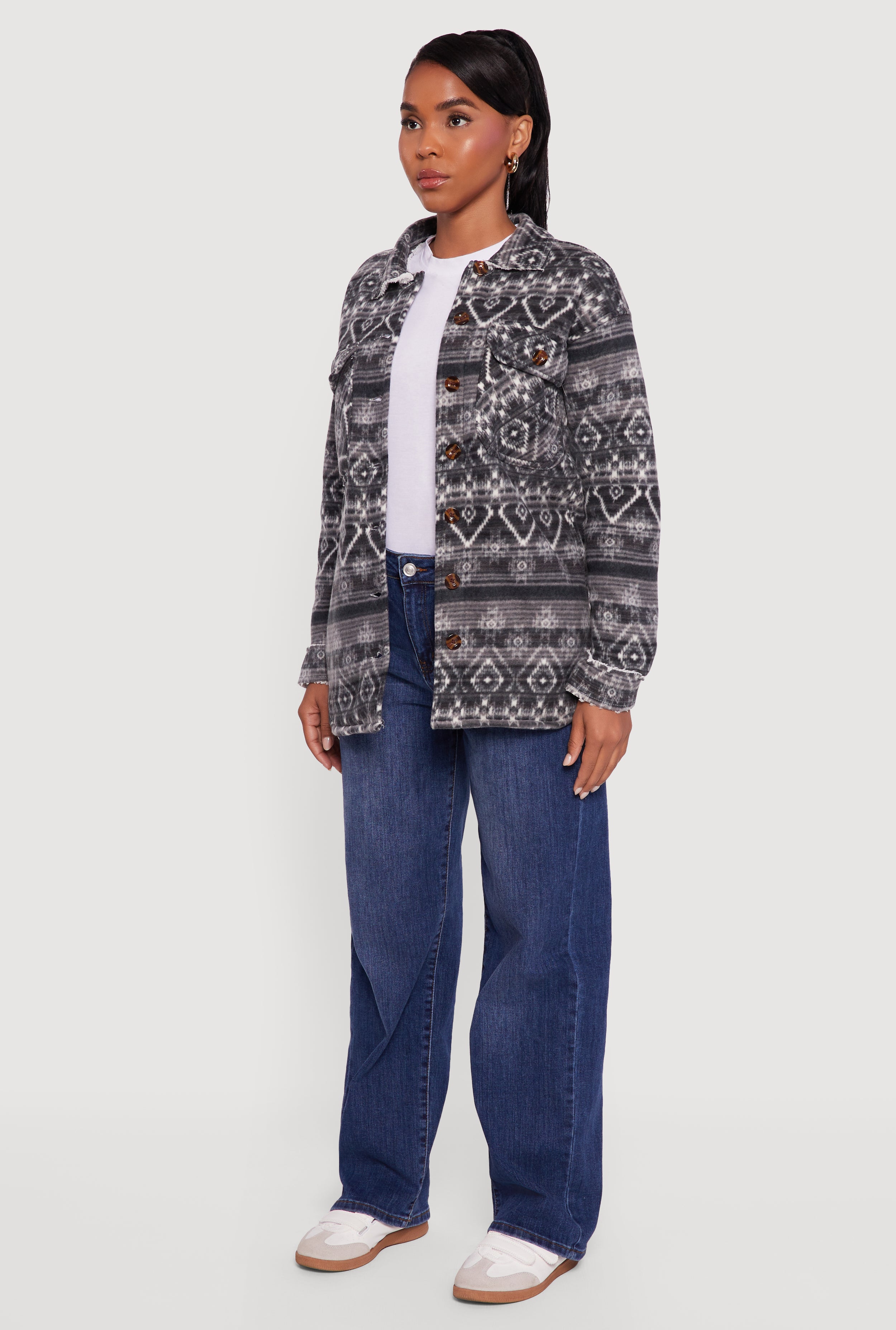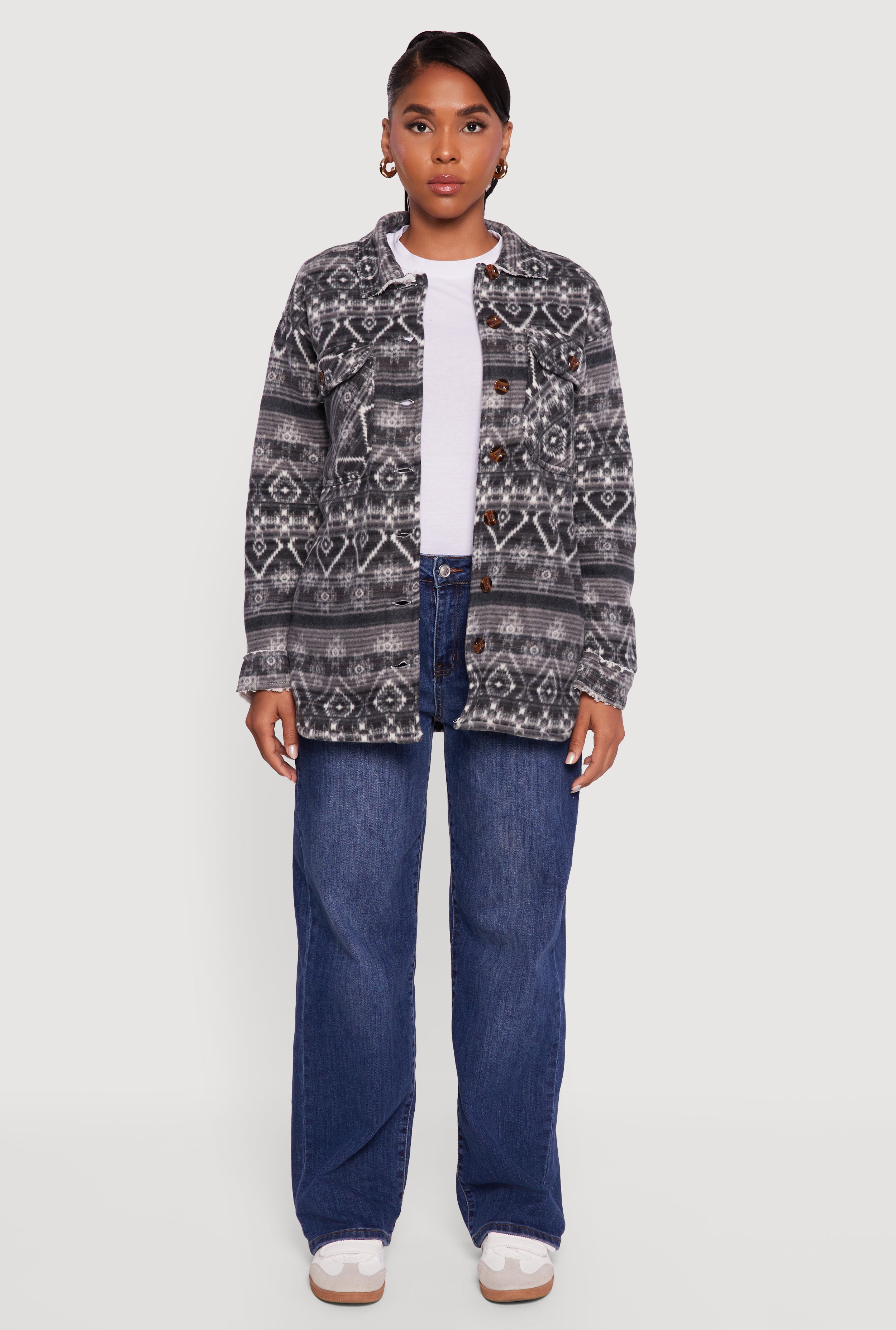 Stay cozy and cute in the Fair Isle Print Sherpa Lined Fleece Shacket, your new go-to for chill days and casual vibes. This button-front shacket blends classic Fair Isle charm with ultra-soft sherpa lining, making it perfect for layering without the bulk. The drop shoulder and blouson sleeves add a relaxed, effortlessly cool touch that fits right into your everyday style. Whether you're running errands or hanging out with friends, this fleece shacket keeps you warm and on-trend.