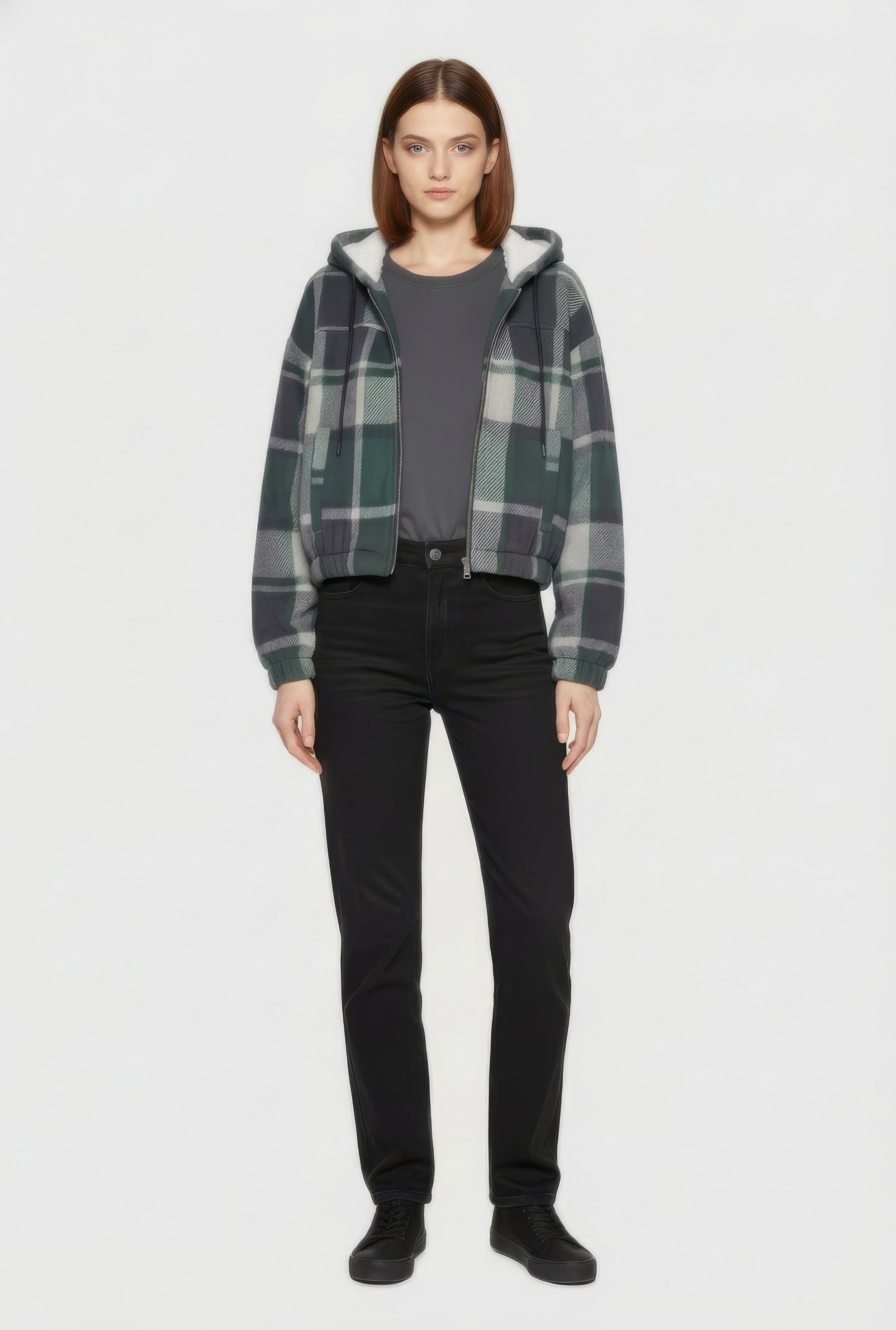 Cozy up in style with this Plaid Sherpa Lined Hooded Jacket, your new go-to for casual days and chilly nights. Featuring a classic plaid pattern and a super soft sherpa lining, this jacket wraps you in warmth without sacrificing on trend. The hood and zipper closure add extra comfort and convenience, making it perfect for layering or wearing solo. Whether you’re running errands or hanging out with friends, this fleece bomber jacket brings effortless cool to your outerwear game.