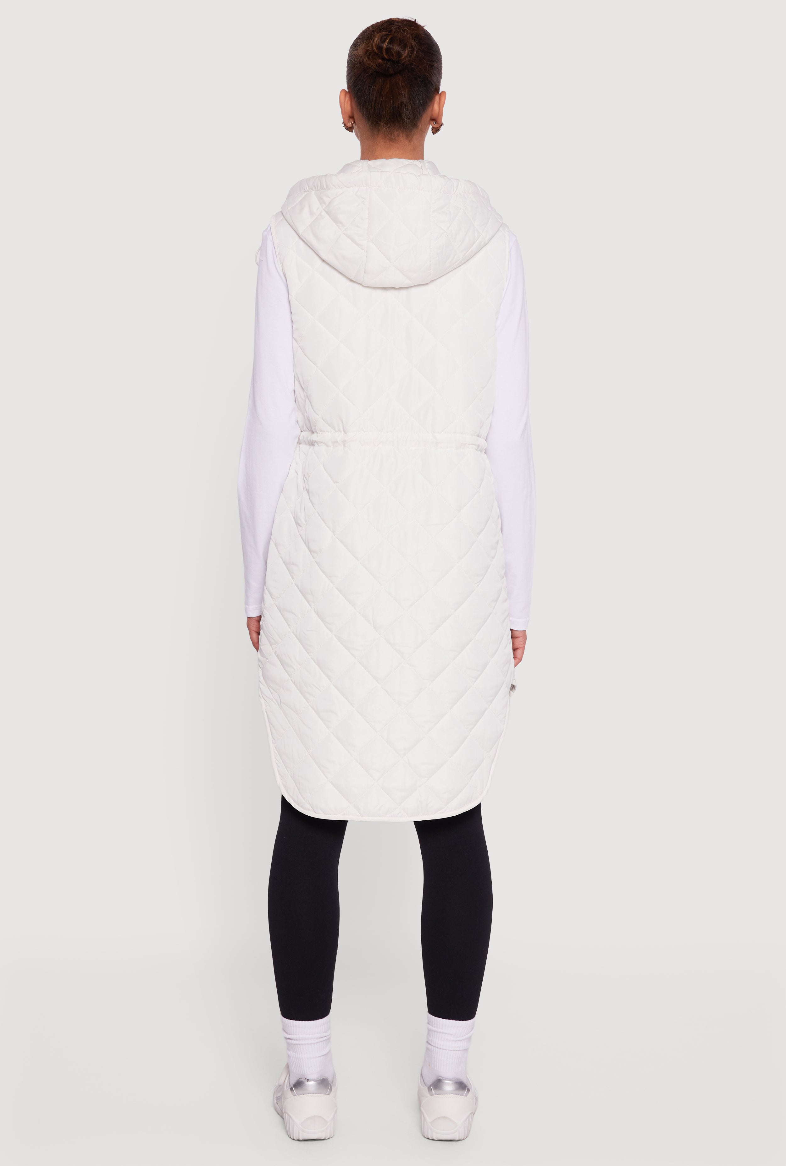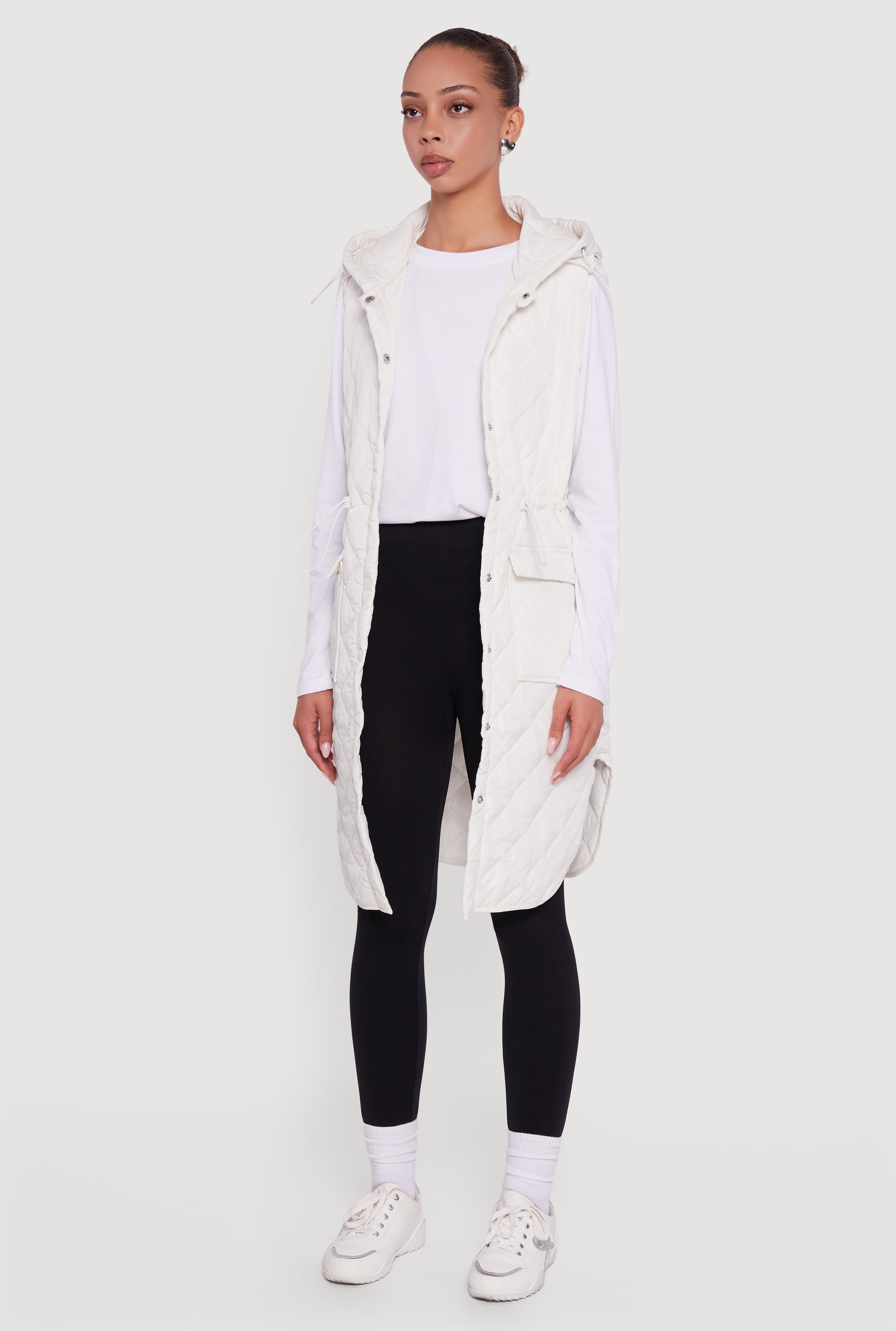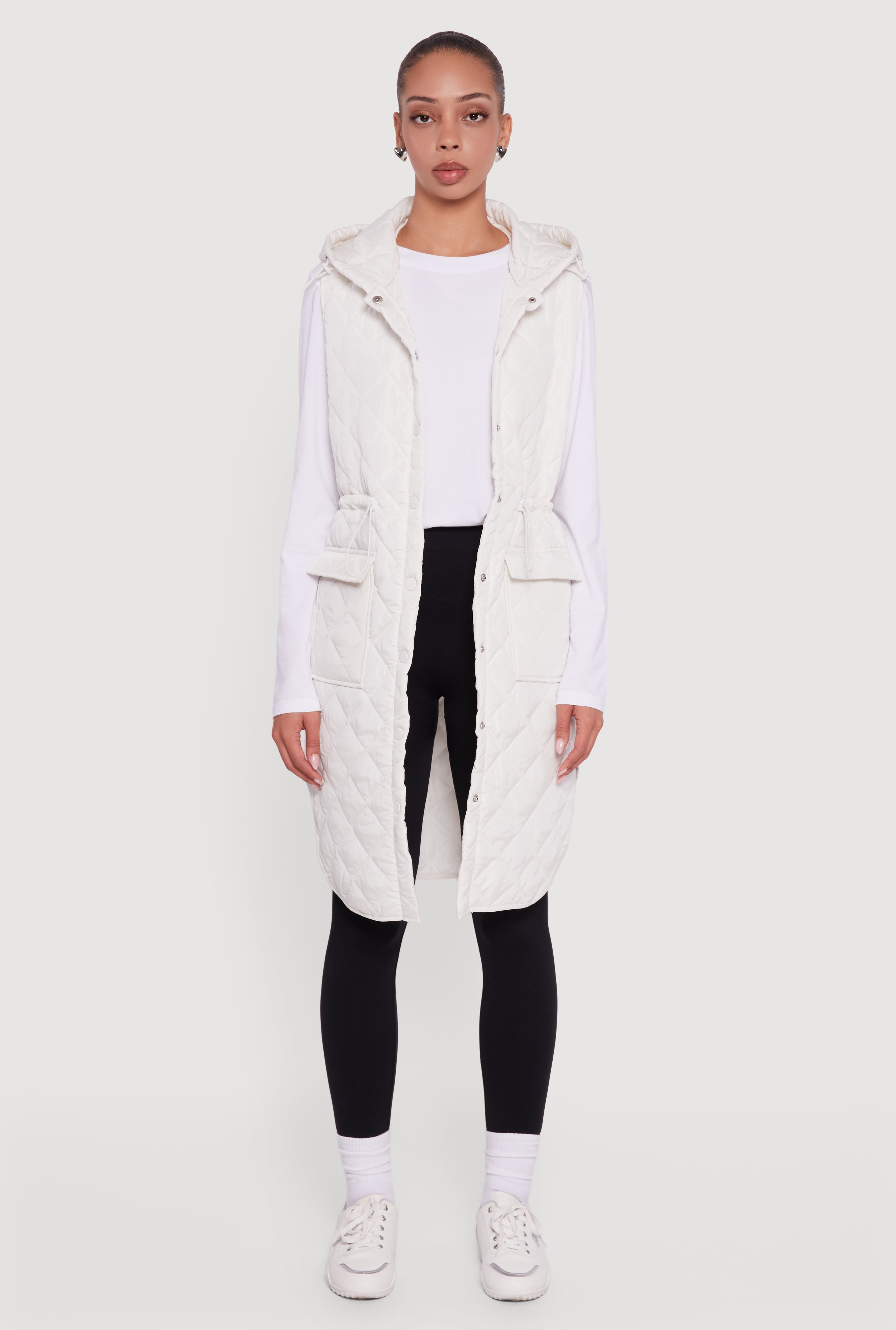 Stay cozy and stylish with the Almost Famous Quilted Hooded Long Puffer Vest, your new go-to layering piece for cooler days. This sleeveless vest features a hooded neckline and a snap button front for easy wear. The adjustable toggle drawstring waist lets you customize your fit while the side slits add a touch of effortless movement. Practical flap pockets keep your essentials close, making this vest both functional and fashionable for everyday adventures.