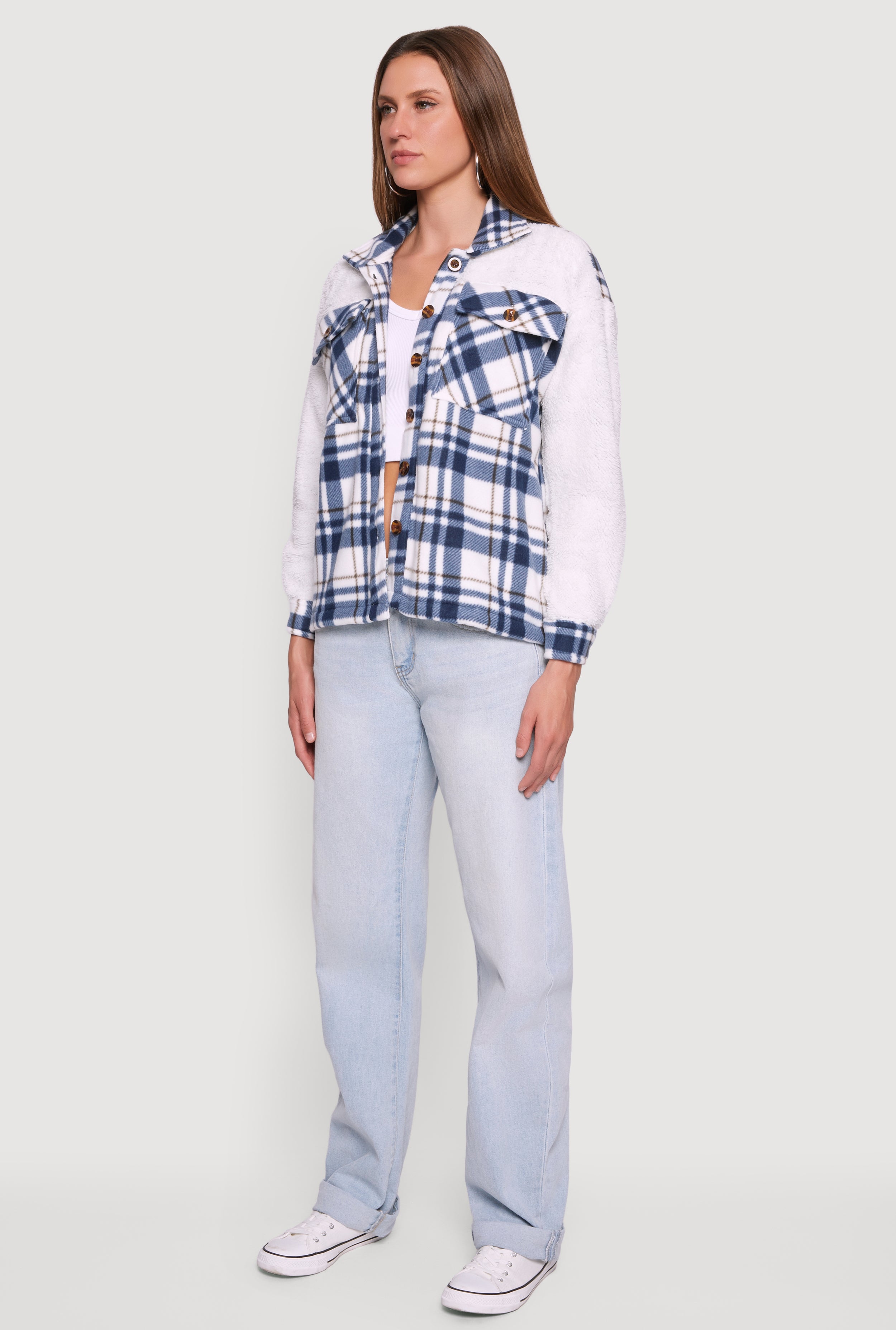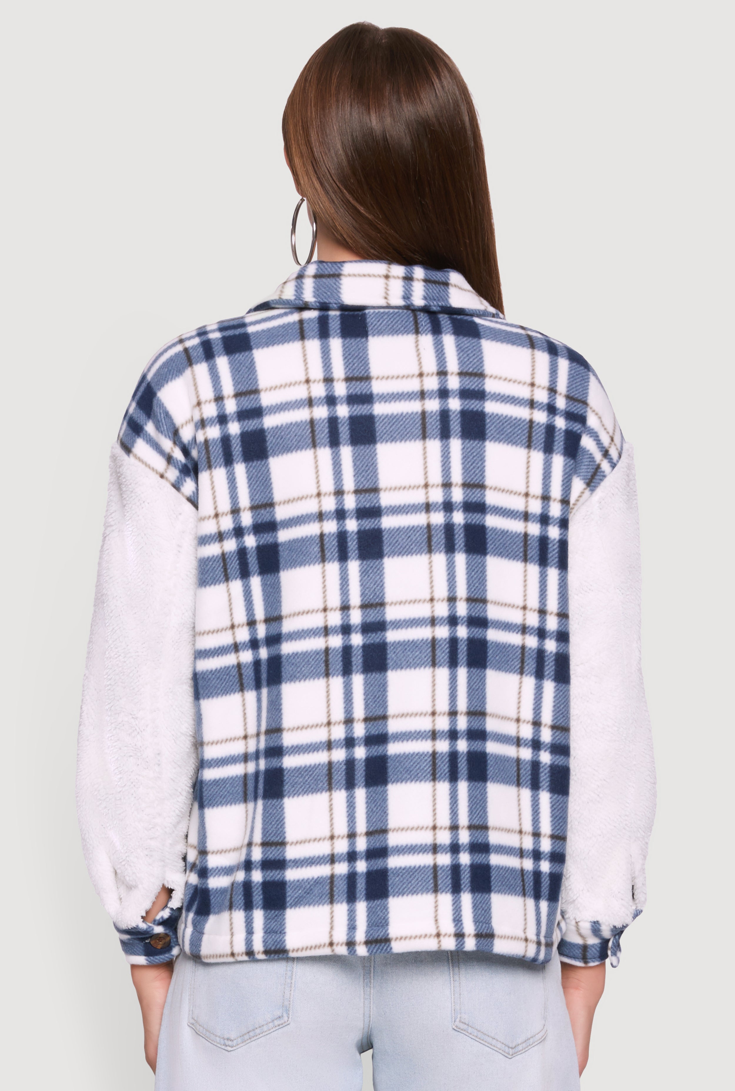 Cozy meets cool in this Plaid Color Block Sherpa Button Front Shacket. Perfect for layering on chilly days, it blends soft fleece and sherpa materials with a trendy plaid and color block design. The collared neckline and button front add classic charm, while flap pockets bring practical style. Whether you’re heading out for a casual hangout or just want to stay snug, this shacket delivers warmth and effortless street style.
