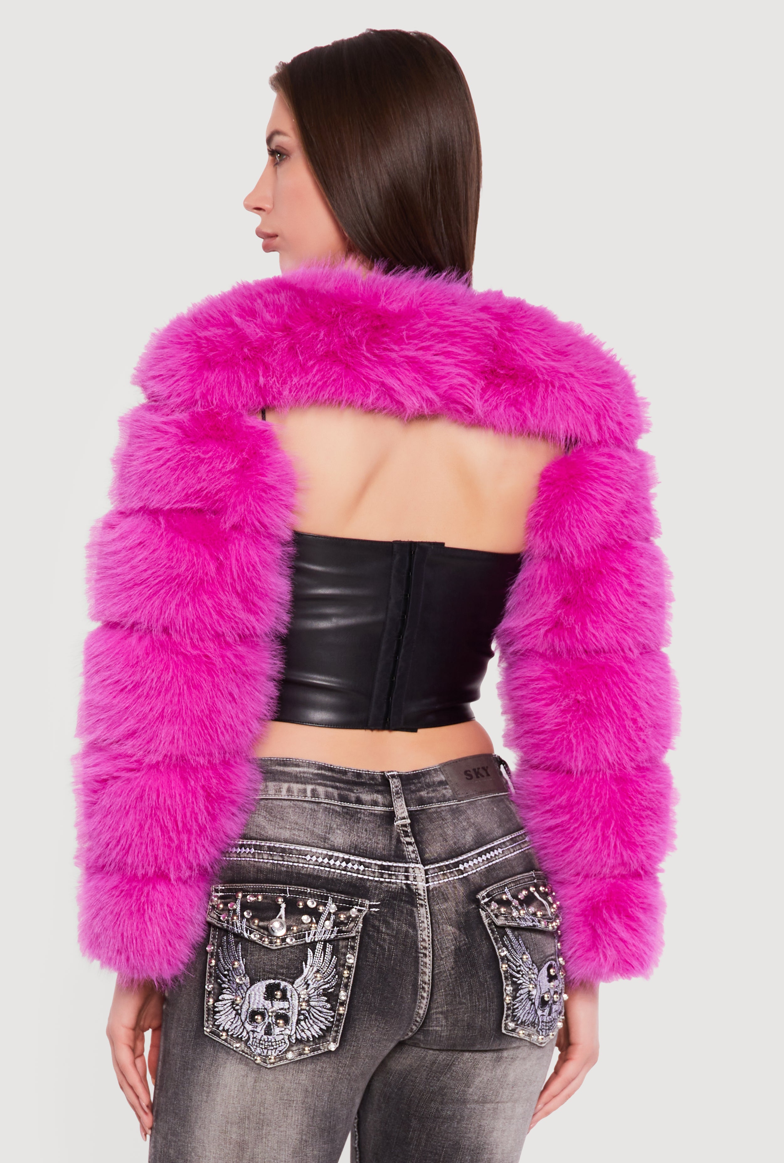 This cropped faux fur jacket features a high neckline and long sleeves, designed to add a sophisticated layer to dressy outfits. Its plush texture and solid pattern make it an elegant choice for formal occasions and evening events.