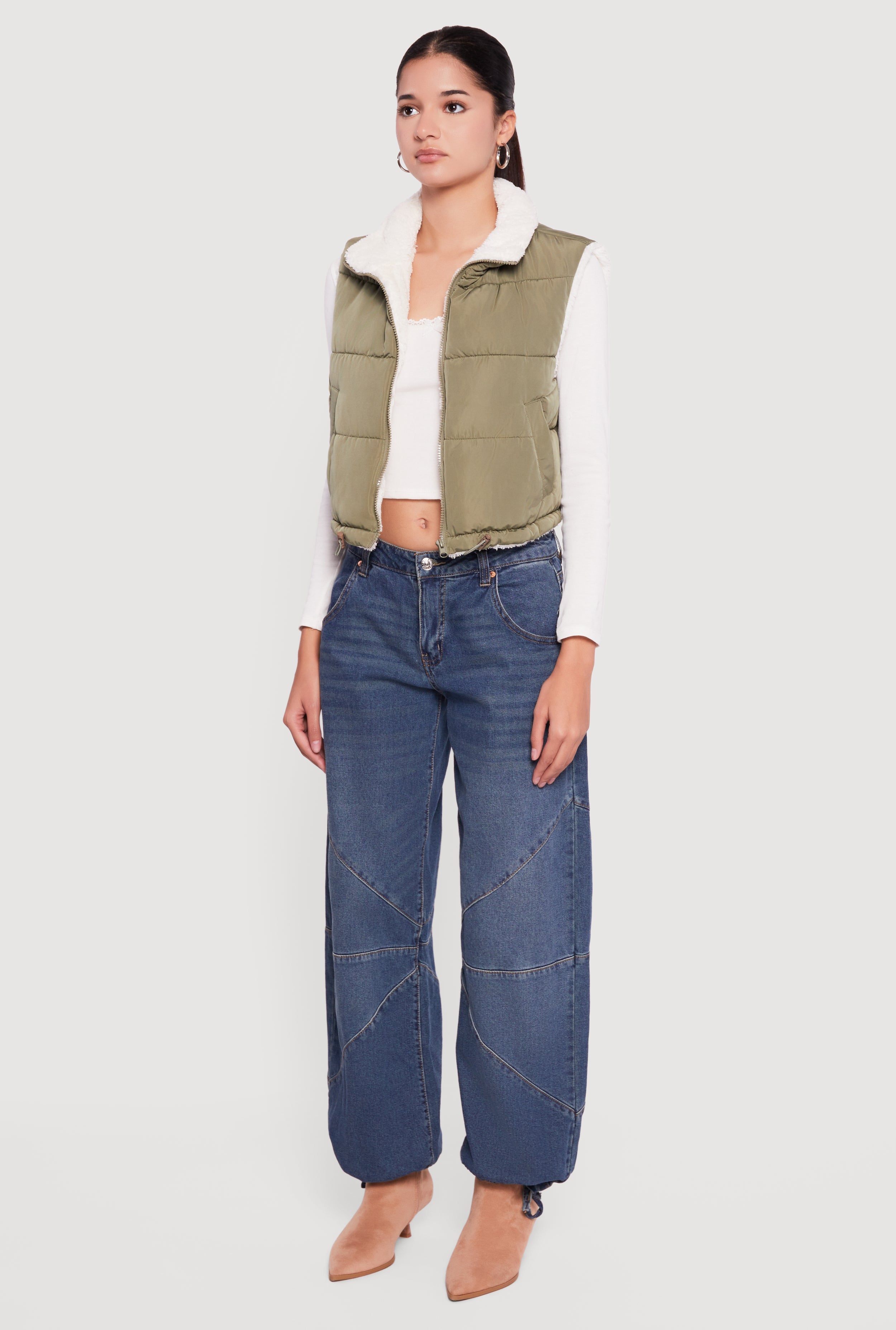 Sherpa Lined Drawstring Hem Zip Front Puffer Vest