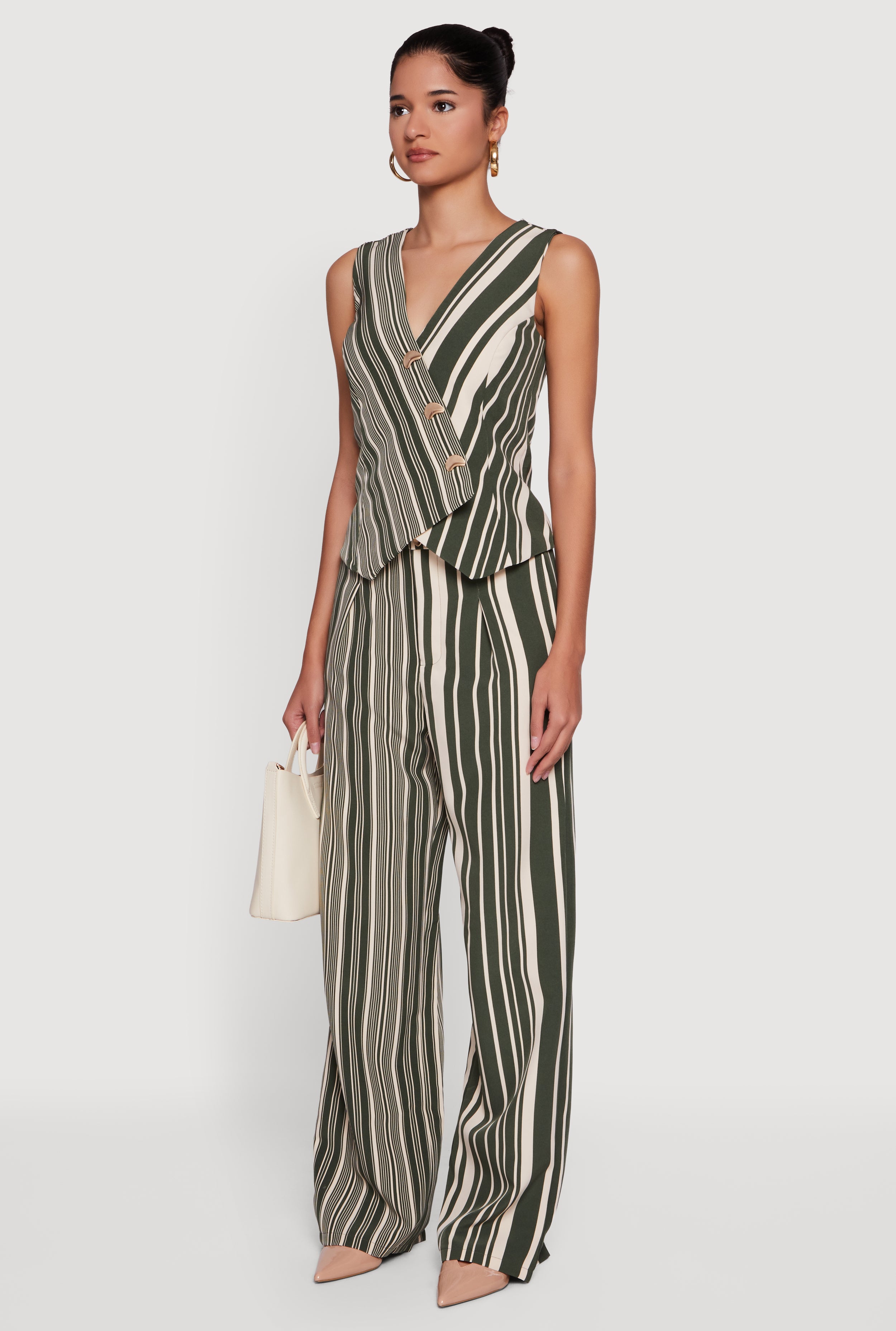Step up your style game with this Striped Button Front Wrap Blazer Vest designed to turn heads at your next night out or party. Crafted from soft crepe knit, this sleeveless blazer vest features a flattering V-neck and a chic button front wrap design that adds a modern twist to a classic silhouette. The bold stripes bring a fresh, trendy vibe that effortlessly elevates any outfit, making it your go-to piece for easy layering and confident looks.