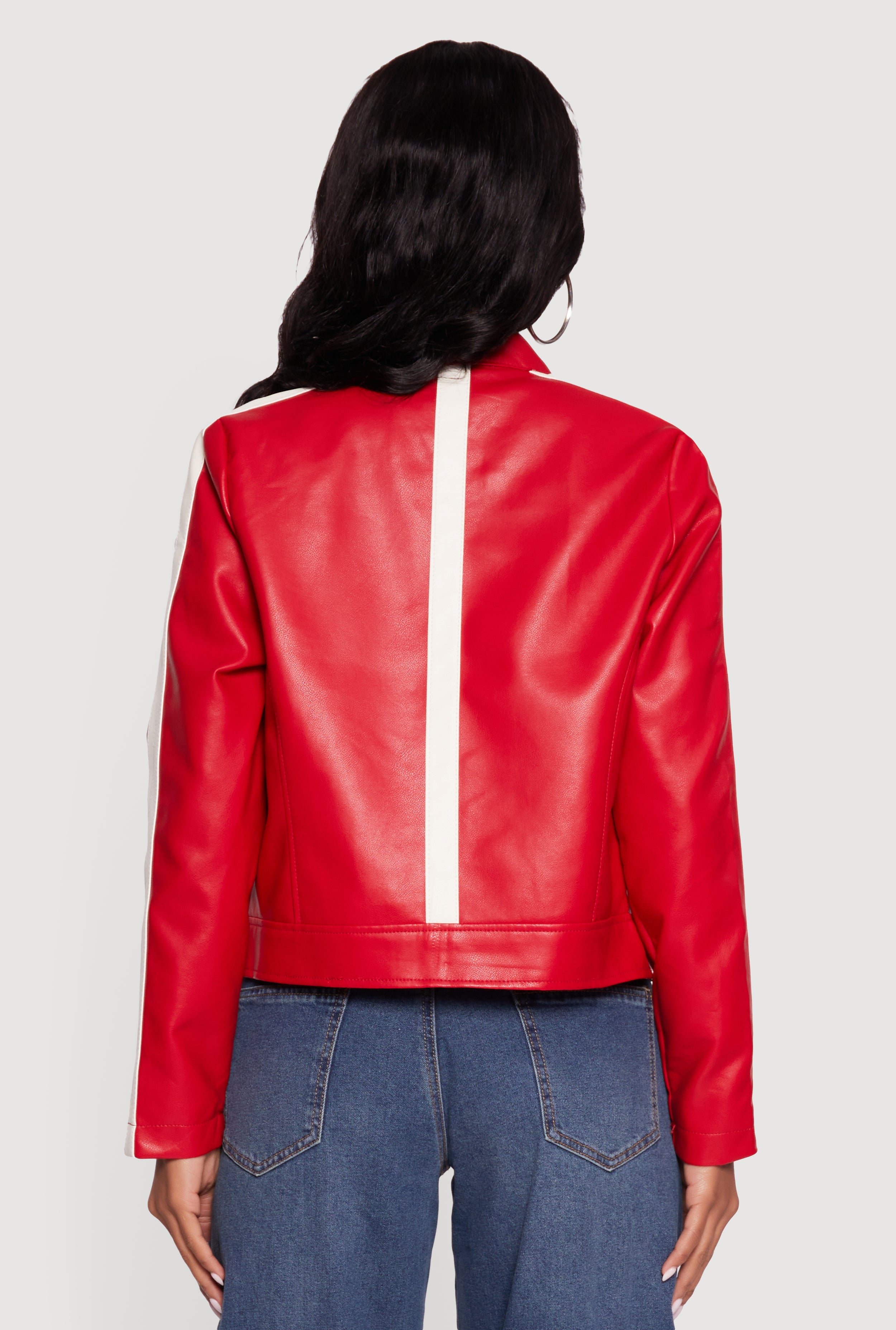 Step up your style game with the Stripe Detail Zip Front Moto Jacket. Crafted from sleek faux leather, this jacket brings edgy vibes with a modern twist. The zip front and band collar add cool, easy-to-wear details that make it perfect for layering over your favorite looks. Whether you’re heading out for a casual day or a night on the town, this moto jacket is your go-to for instant attitude and effortless chic.