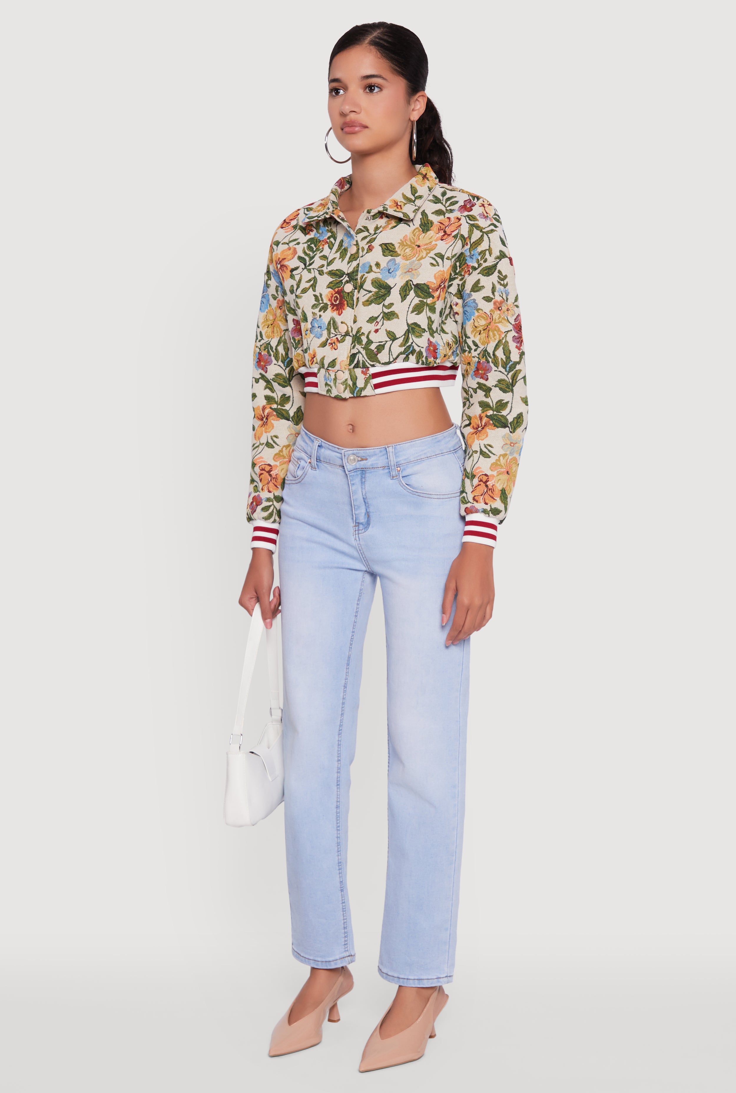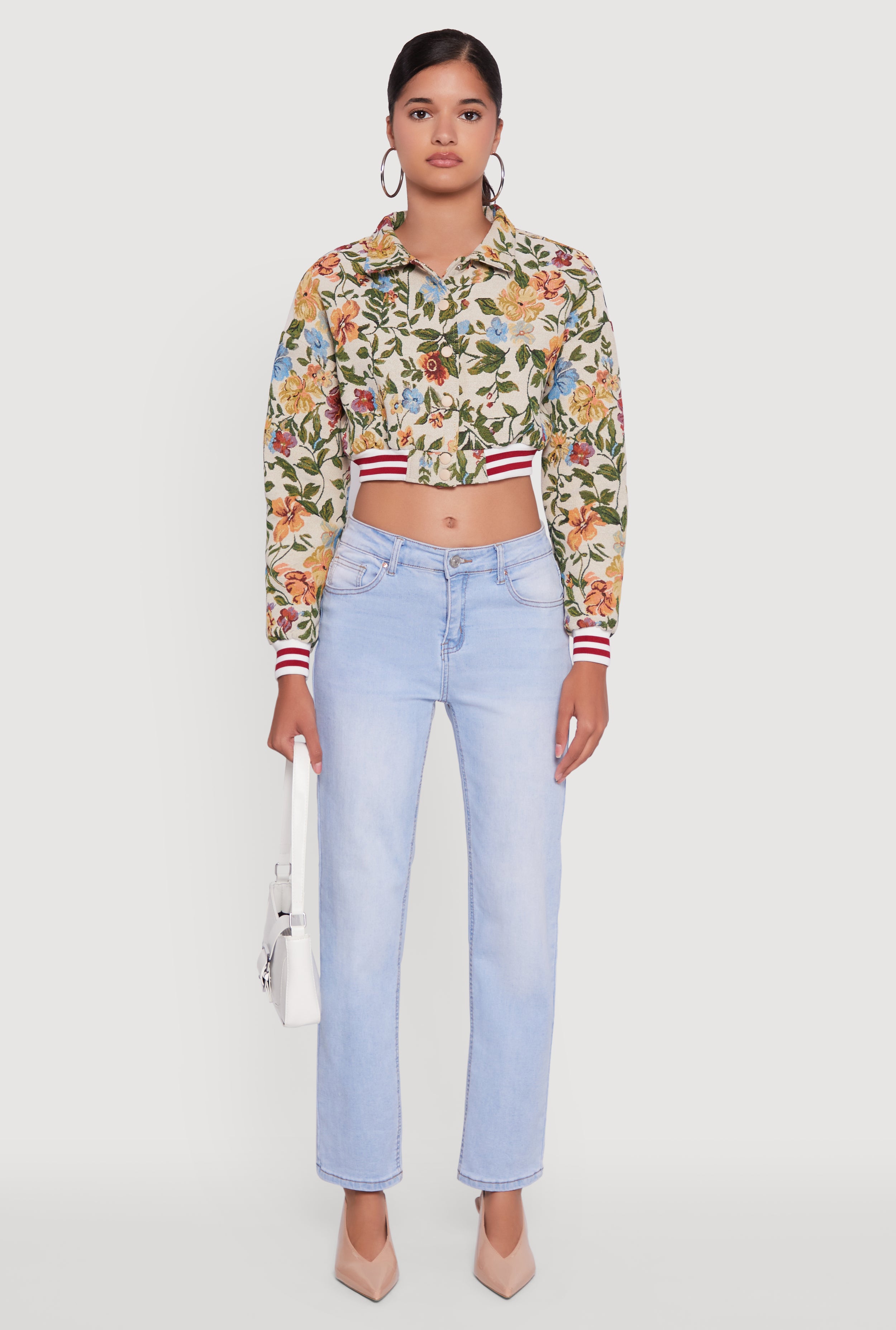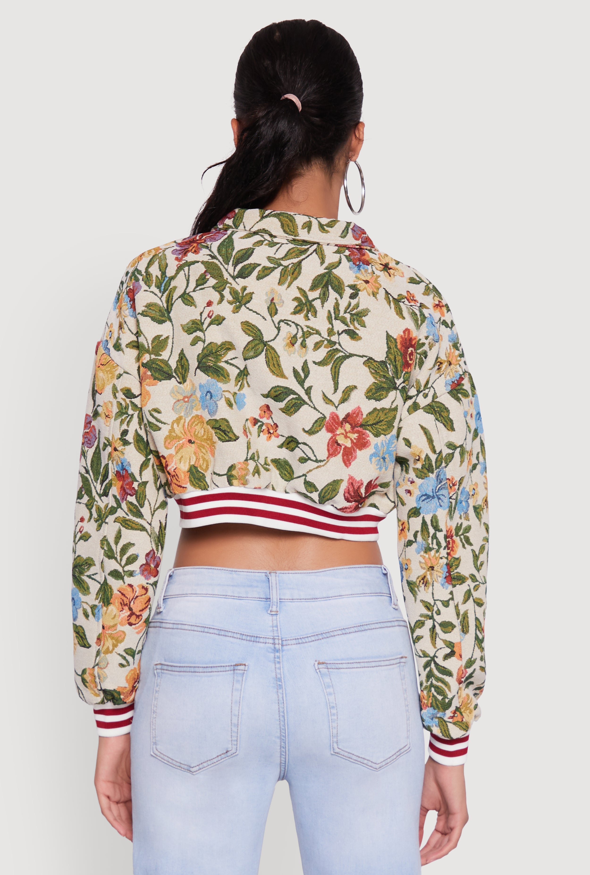 Step up your casual game with this Floral Embroidered Jacquard Jacket with Varsity Stripes. Featuring a cool cropped fit and eye-catching floral embroidery, it blends sporty vibes with feminine flair. The classic button front and collar keep it effortlessly stylish, while the varsity stripes add that perfect touch of retro cool. Whether you’re layering over your favorite tee or dressing up a simple outfit, this jacket is your new go-to for instant outfit upgrade.
