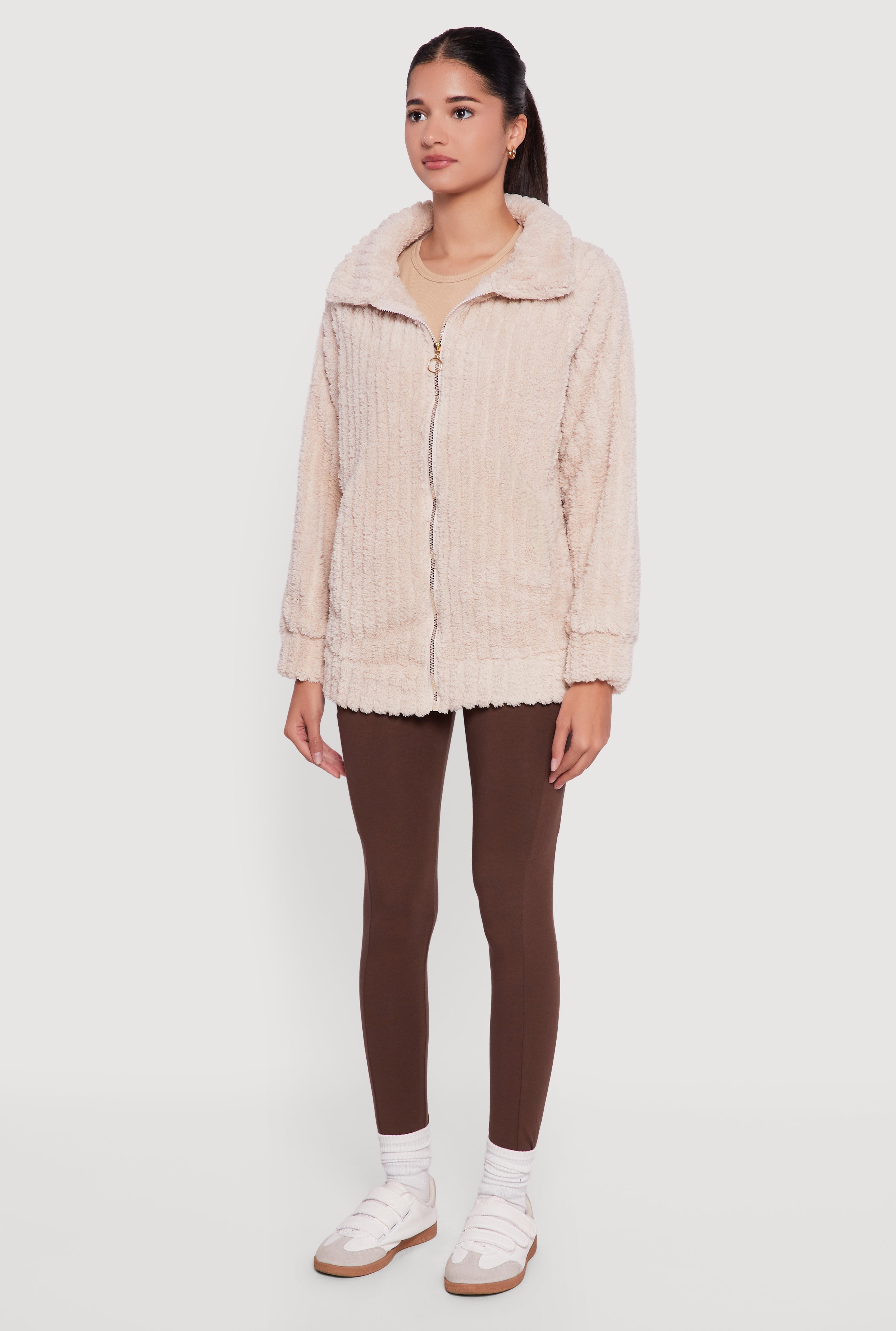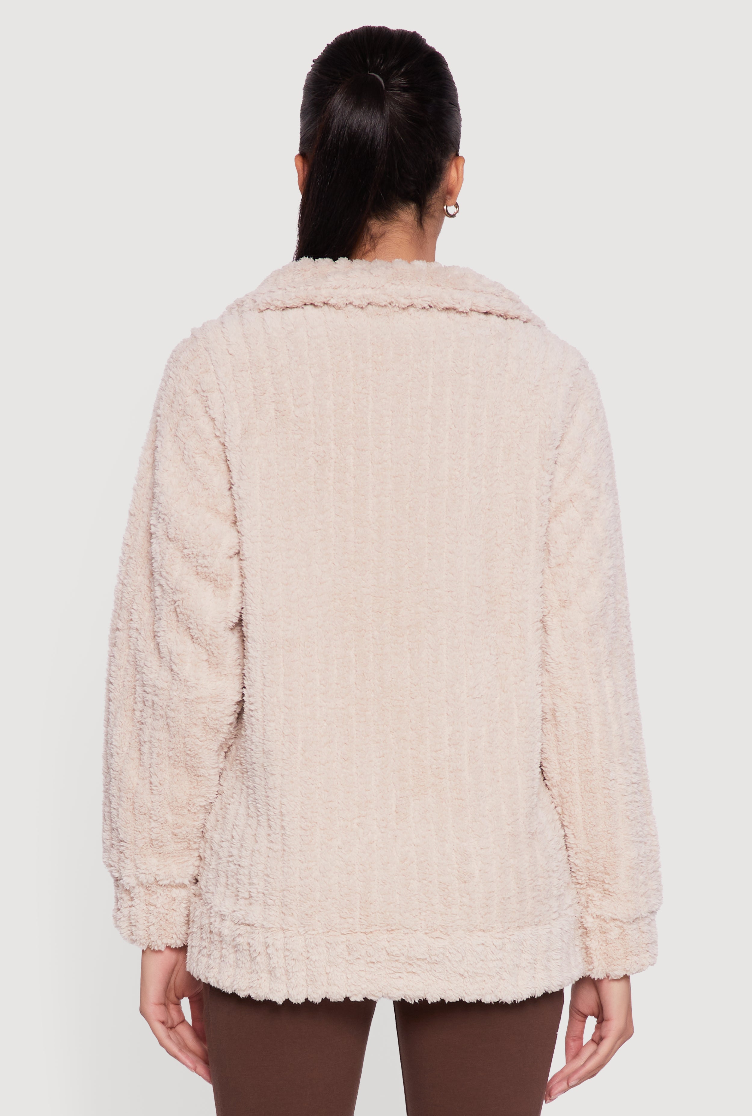 Cozy up in style with the Oversized Ribbed Knit Sherpa Jacket, your new go-to for casual cool vibes. This jacket blends soft sherpa warmth with trendy ribbed knit texture, making it perfect for layering on chilly days. The mock neck adds a touch of chic, while the zip front closure lets you adjust your look with ease. Whether you're out grabbing coffee or lounging at home, this oversized jacket keeps comfort and fashion effortlessly balanced.