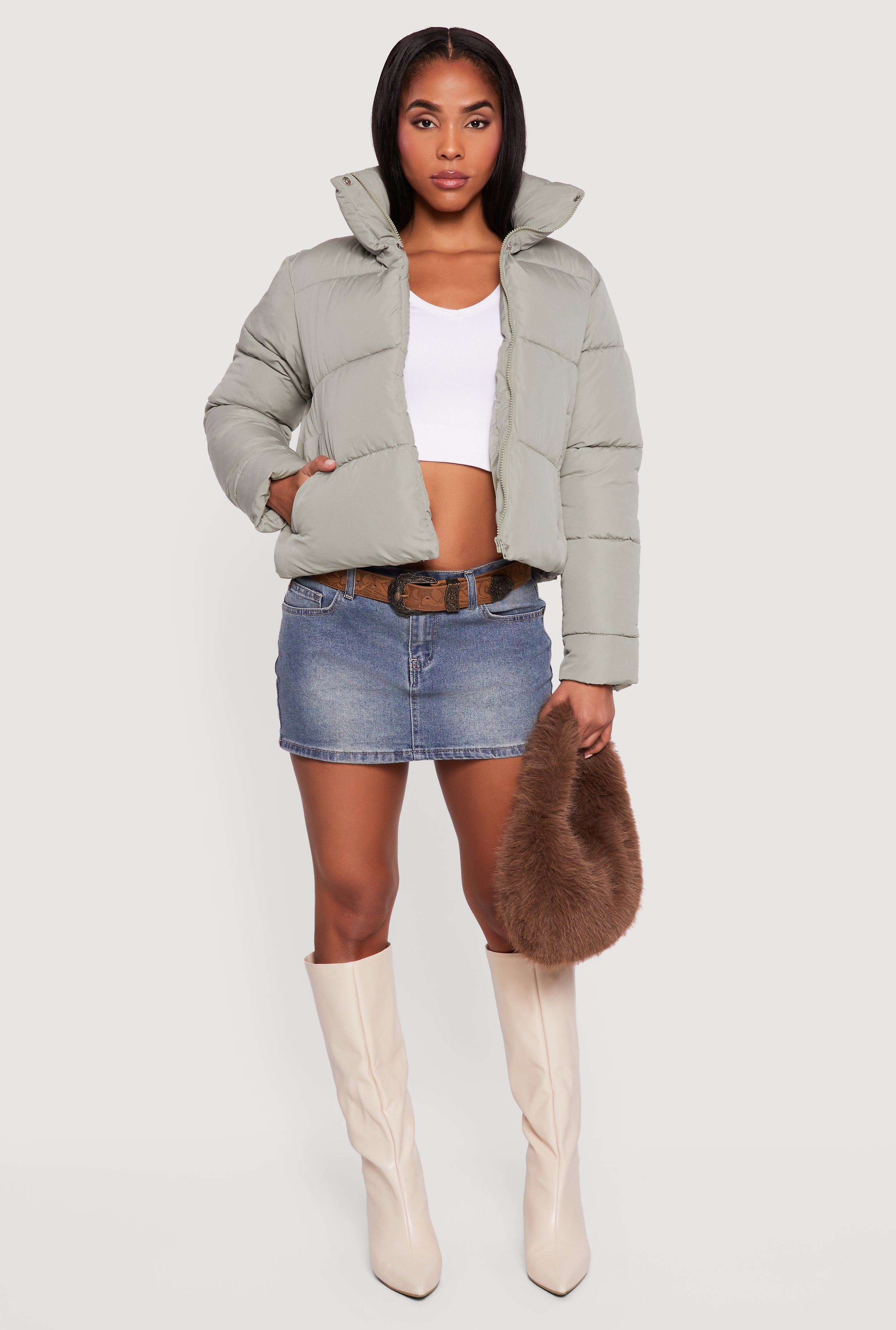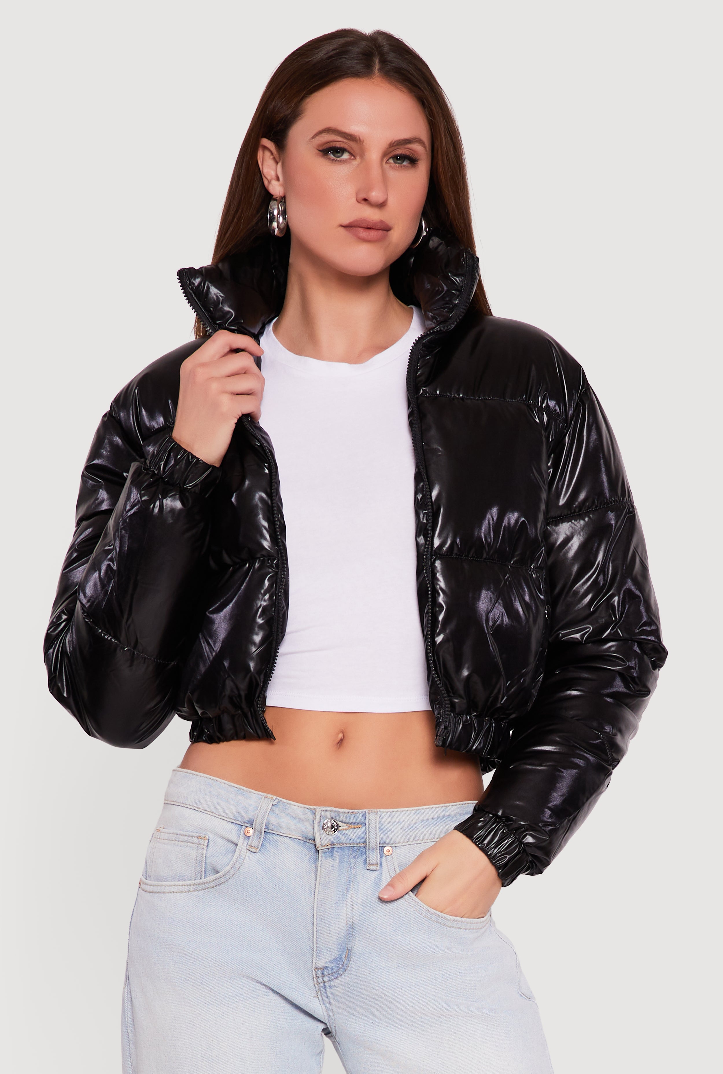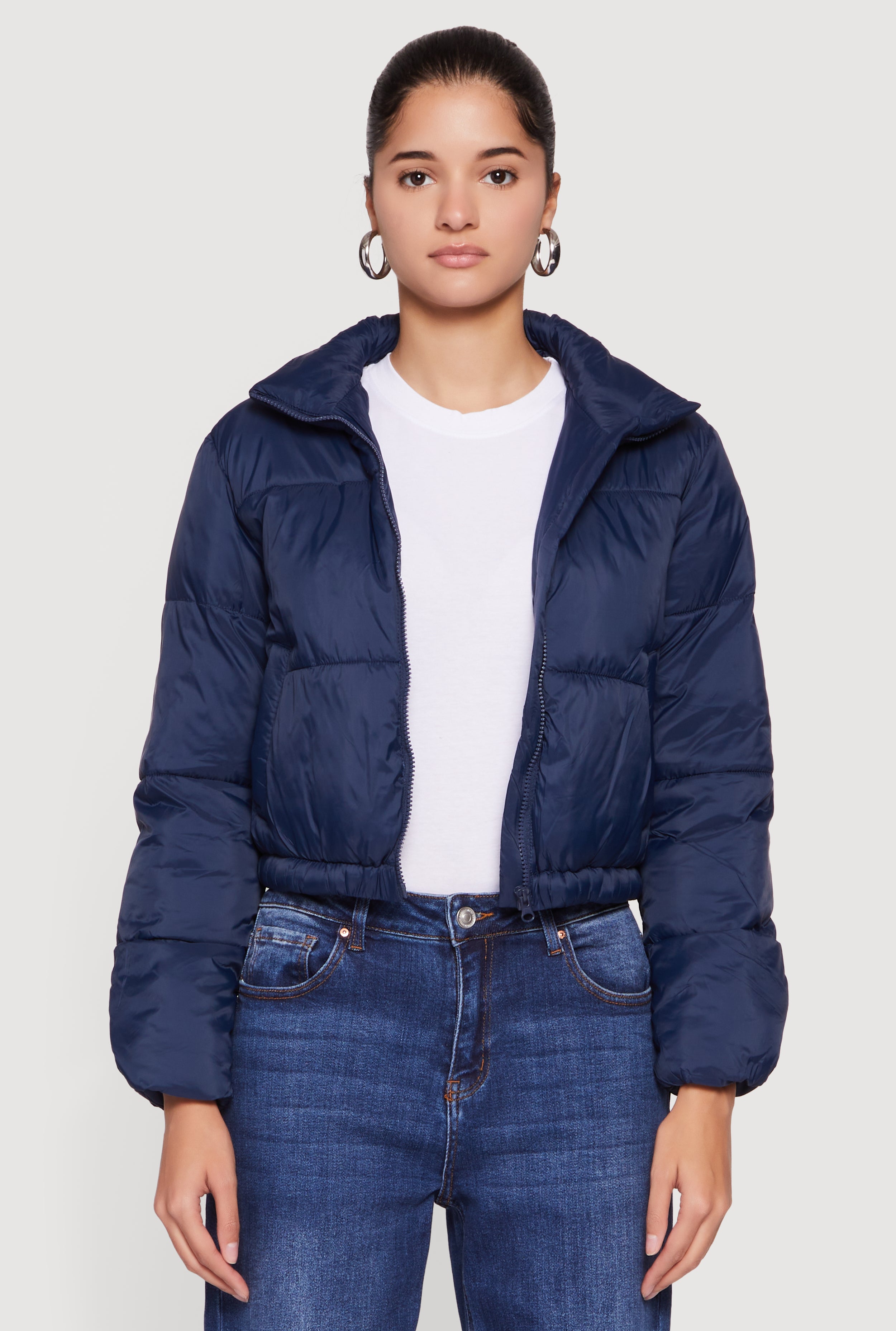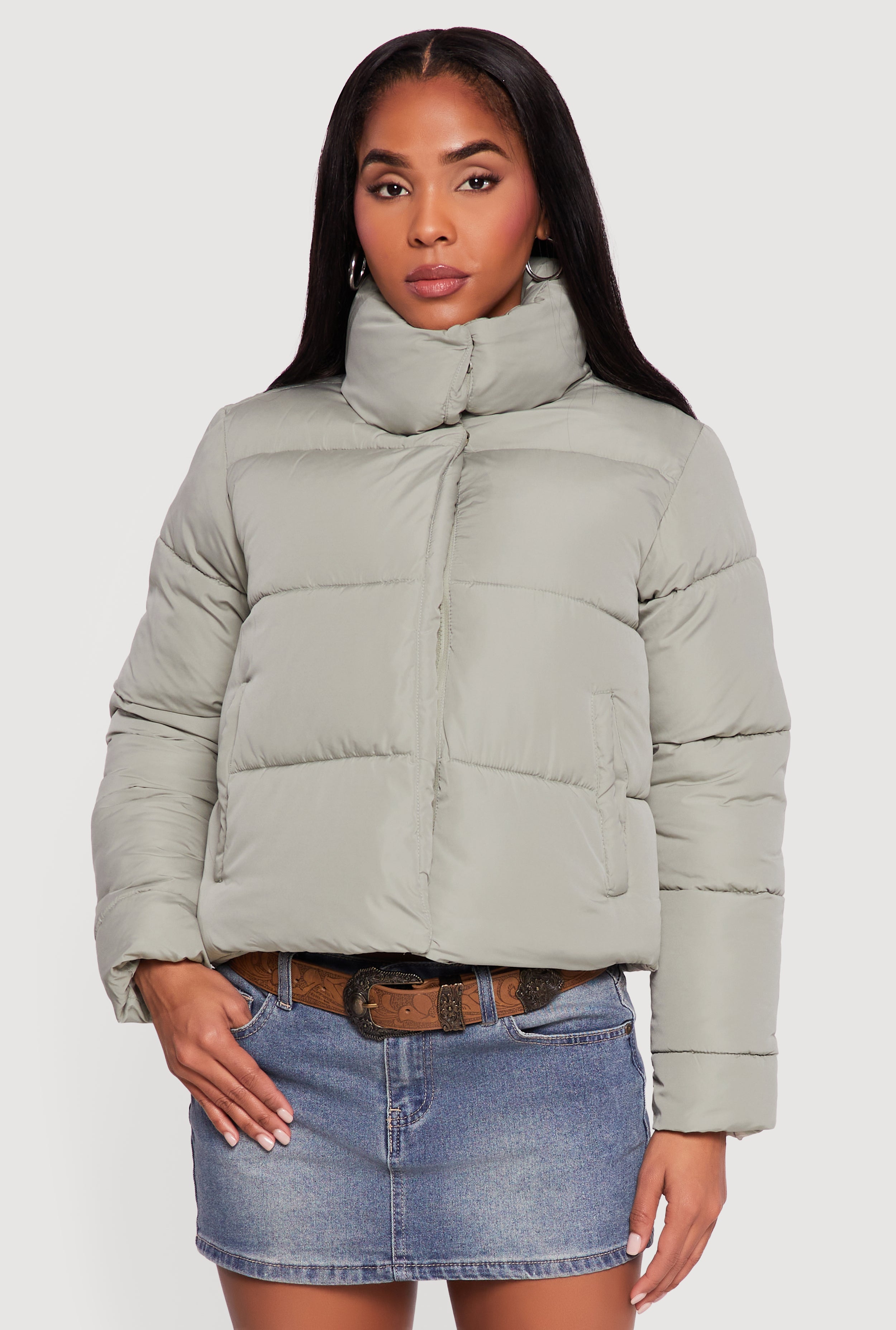 Nylon Long Sleeve Mock Neck Zip Front Puffer Jacket