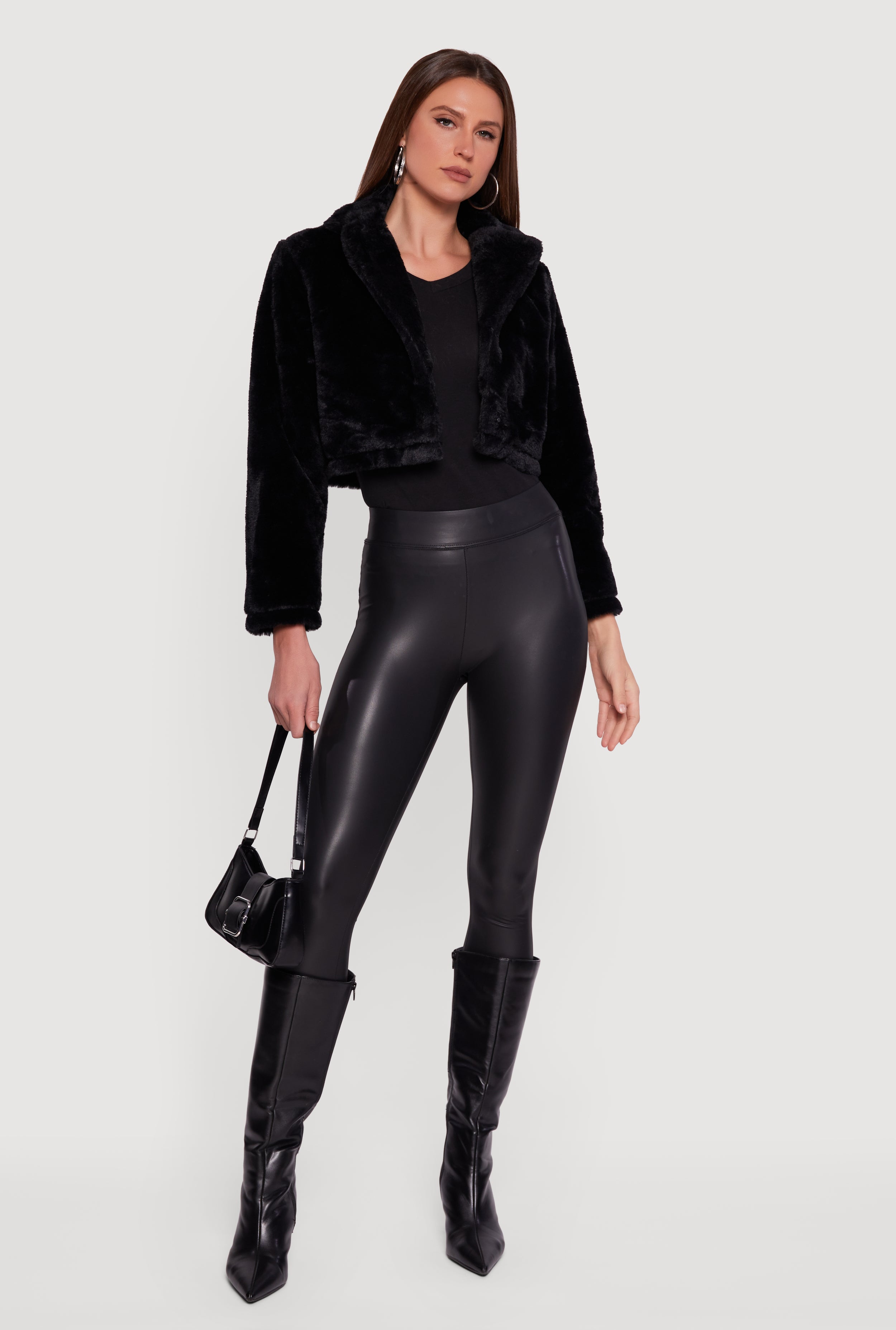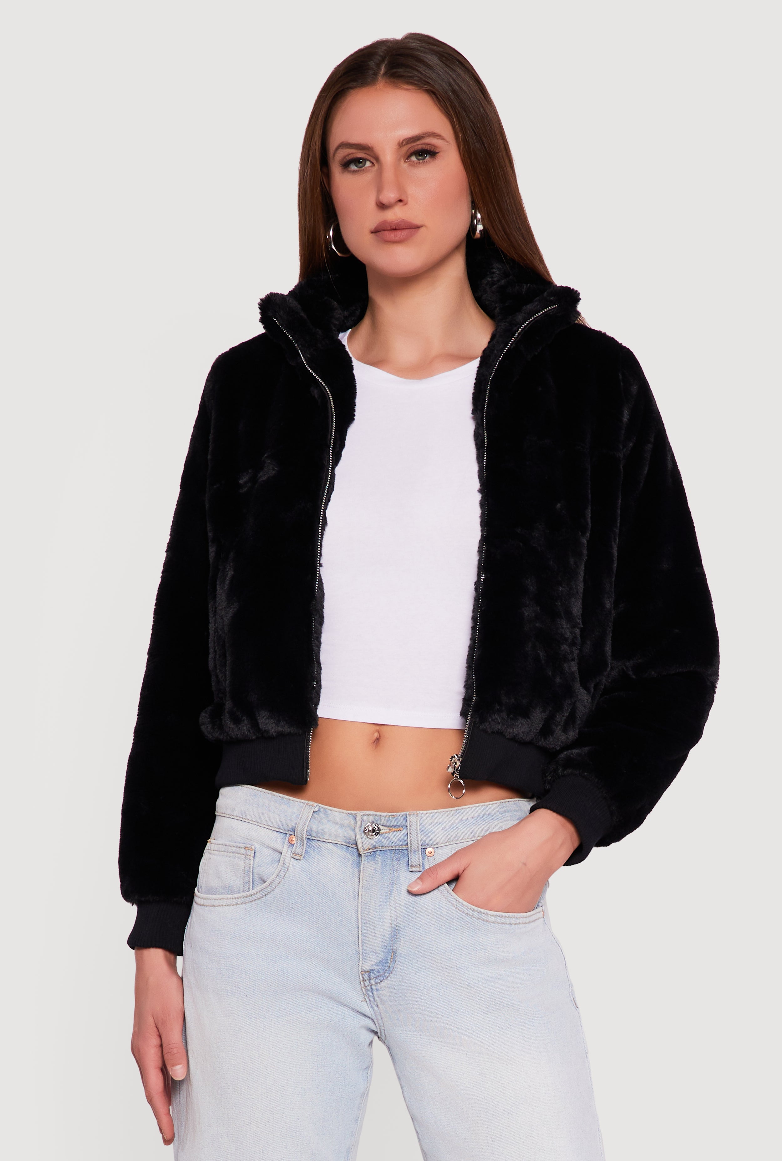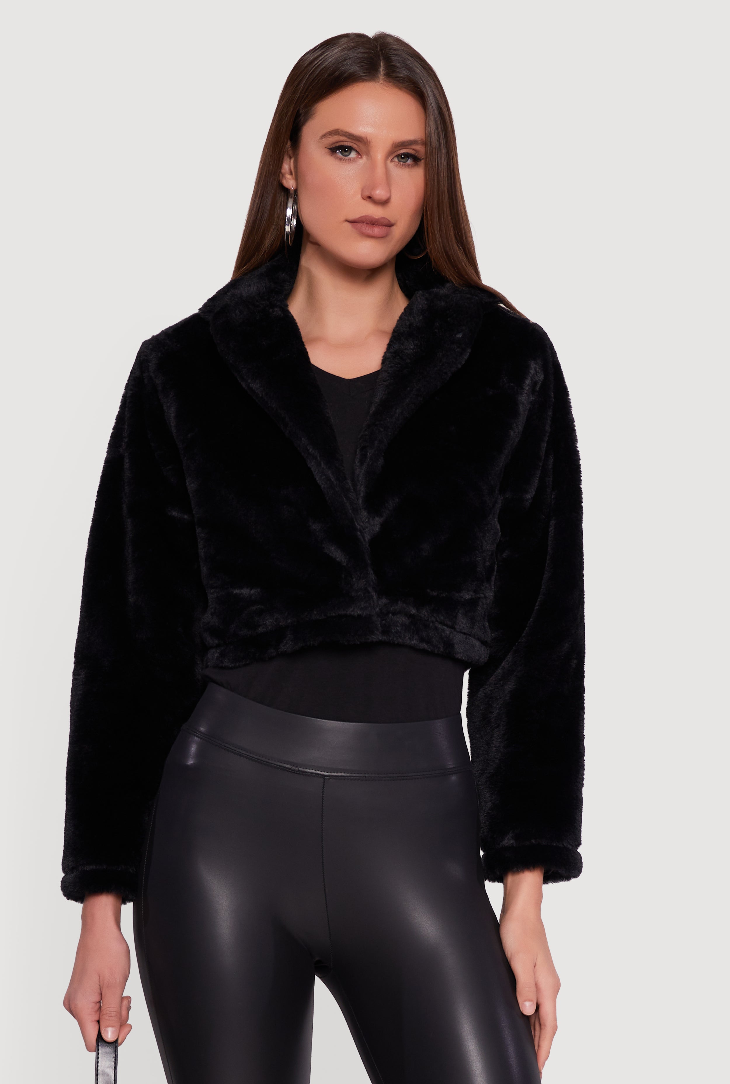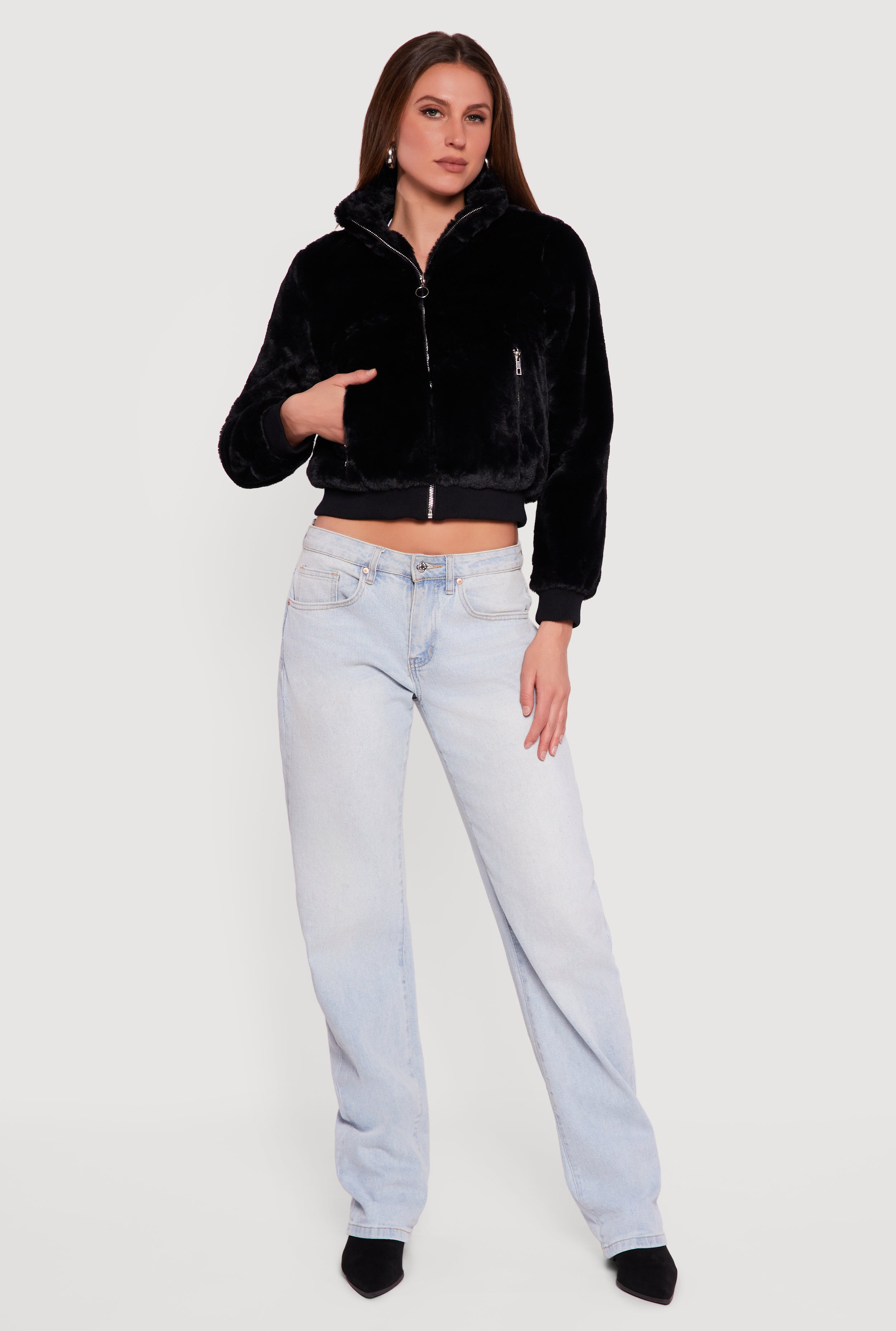 Faux Fur Cropped Long Sleeve Mock Neck Zip Front Jacket