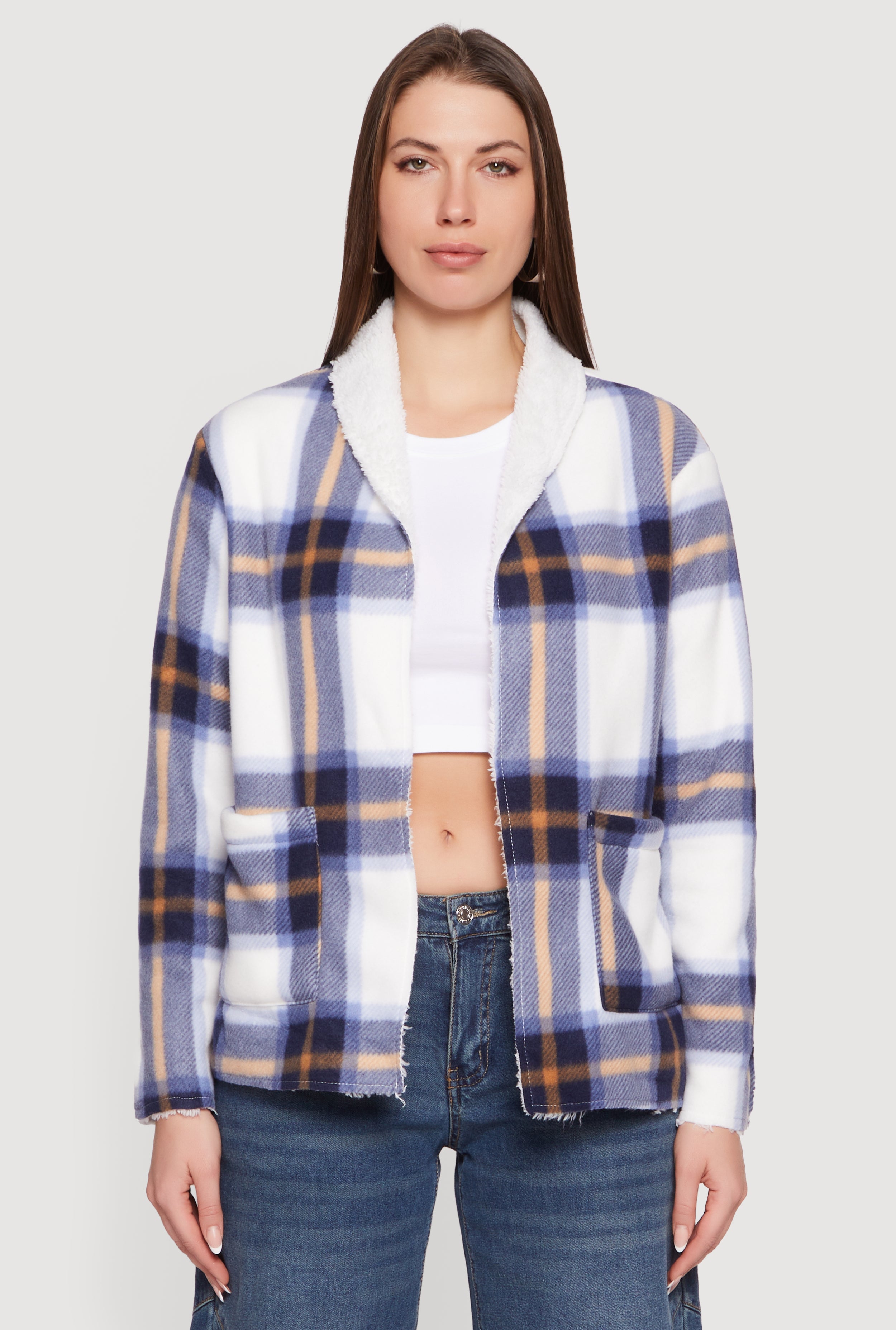 Plaid Zip Front Cropped Hooded Sherpa Shacket