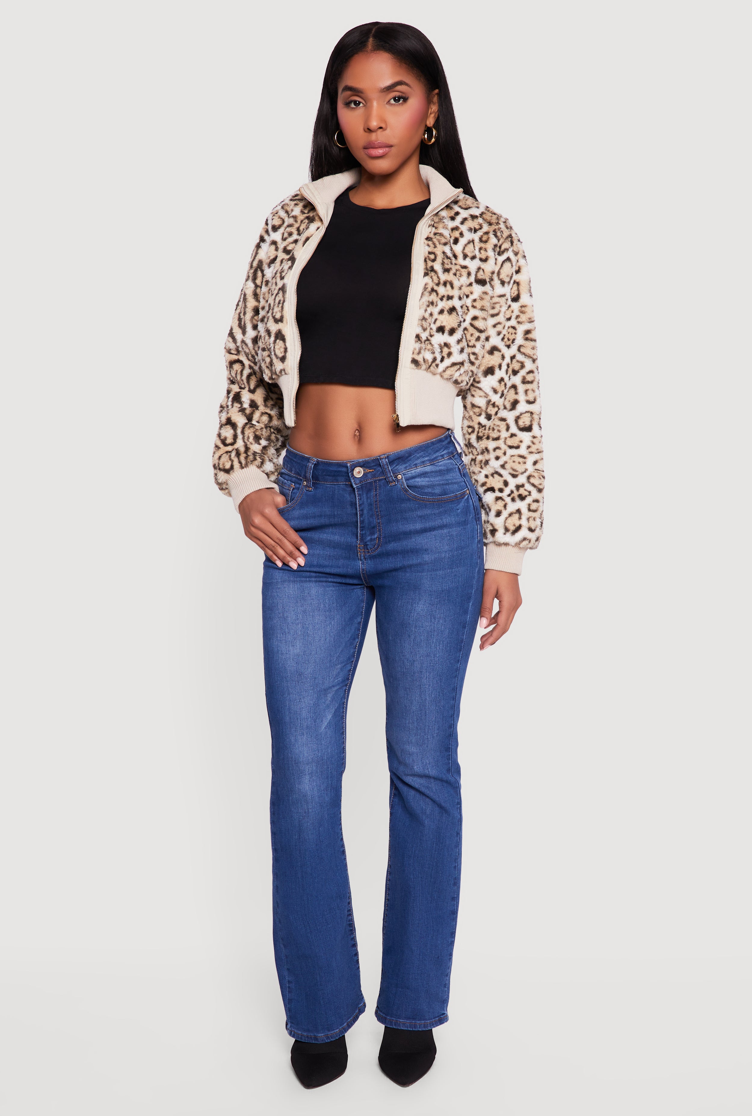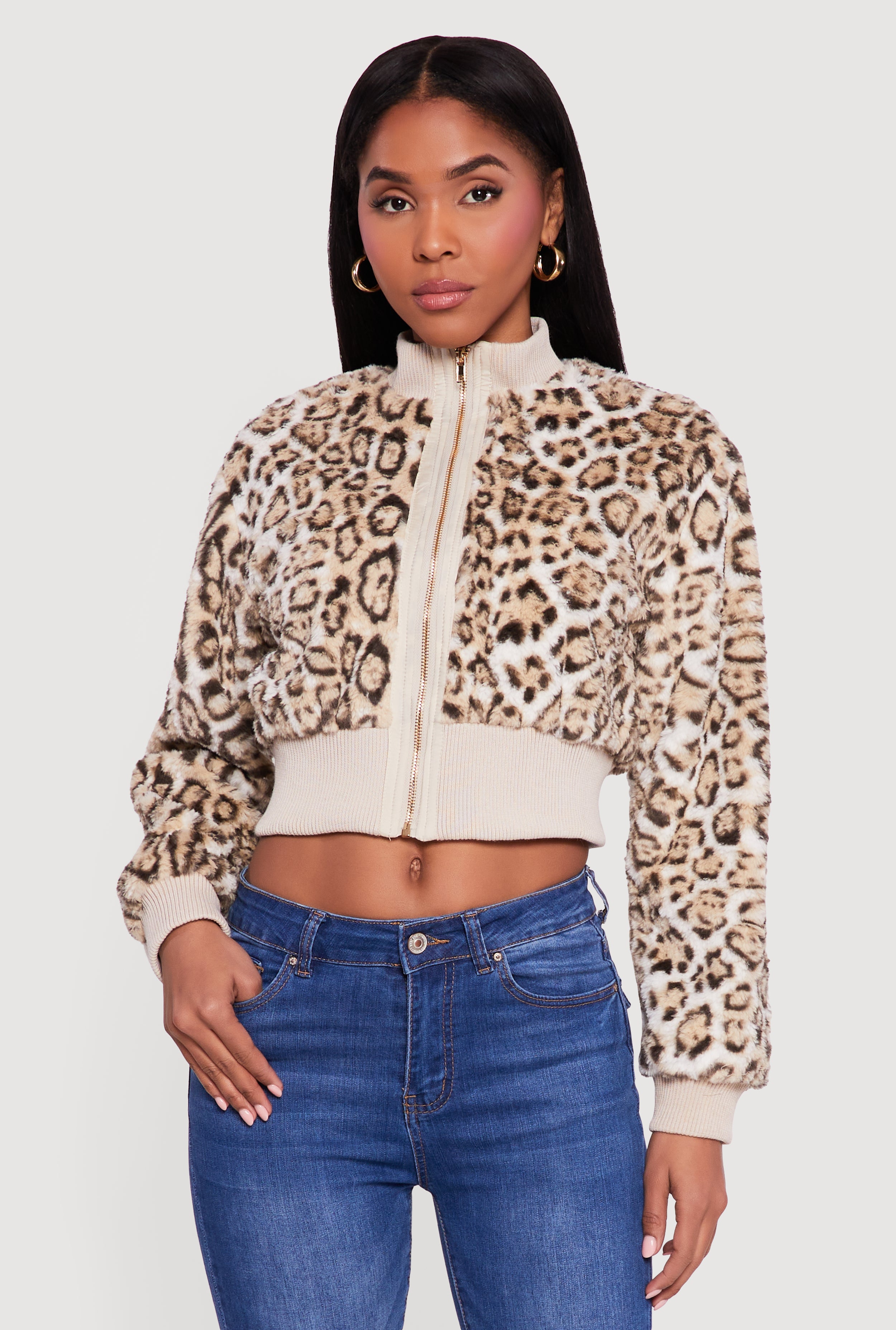 Animal Print Faux Fur Cropped Zip Front Bomber Jacket