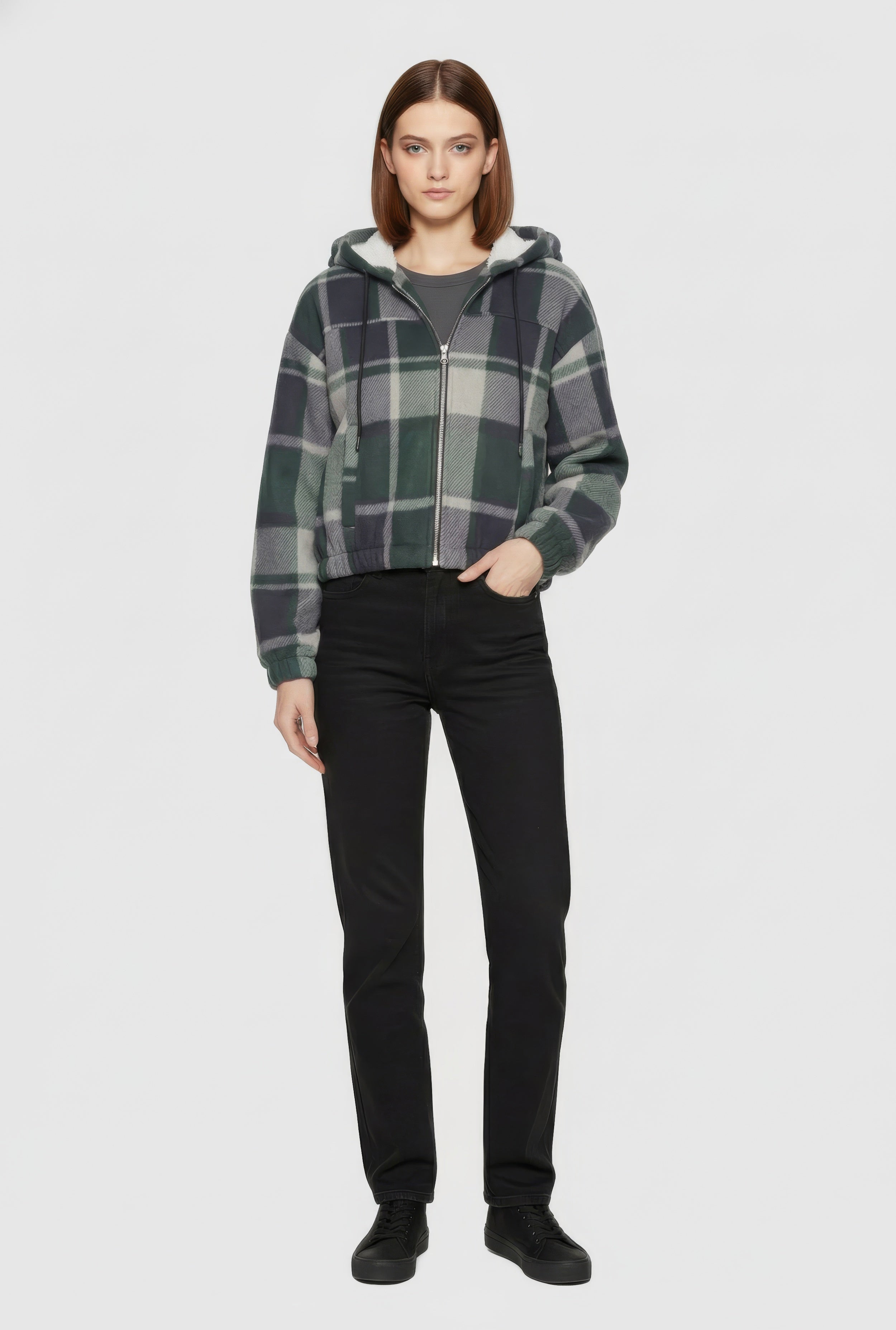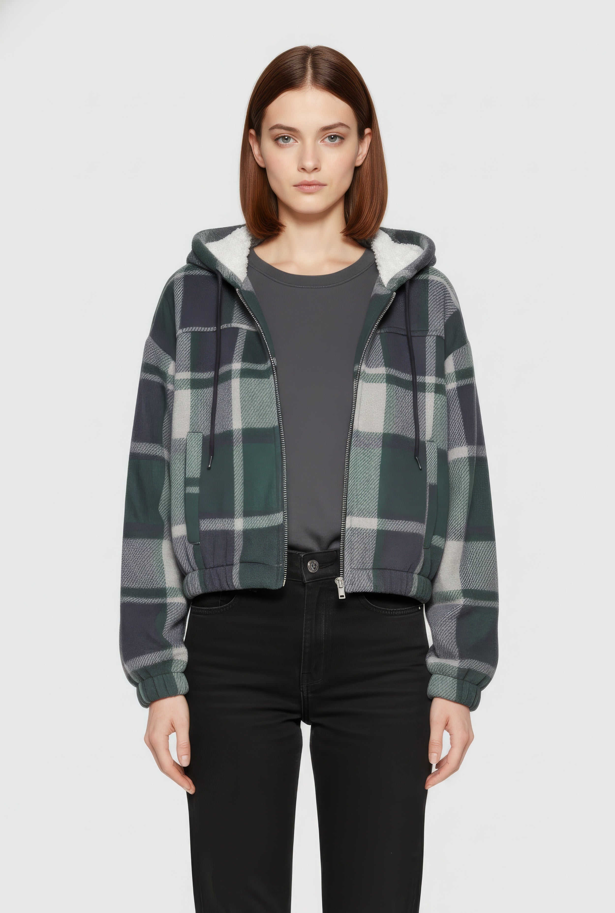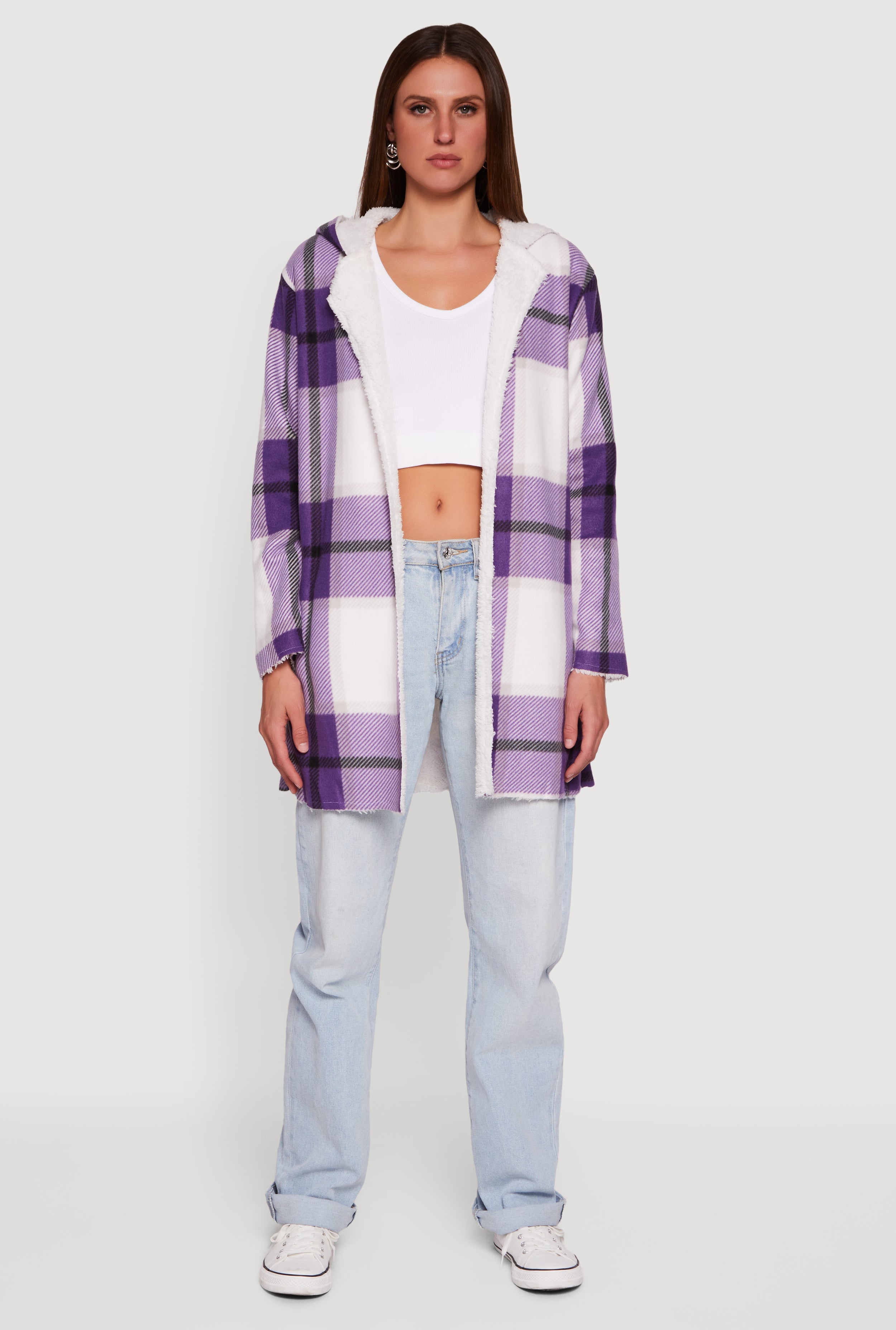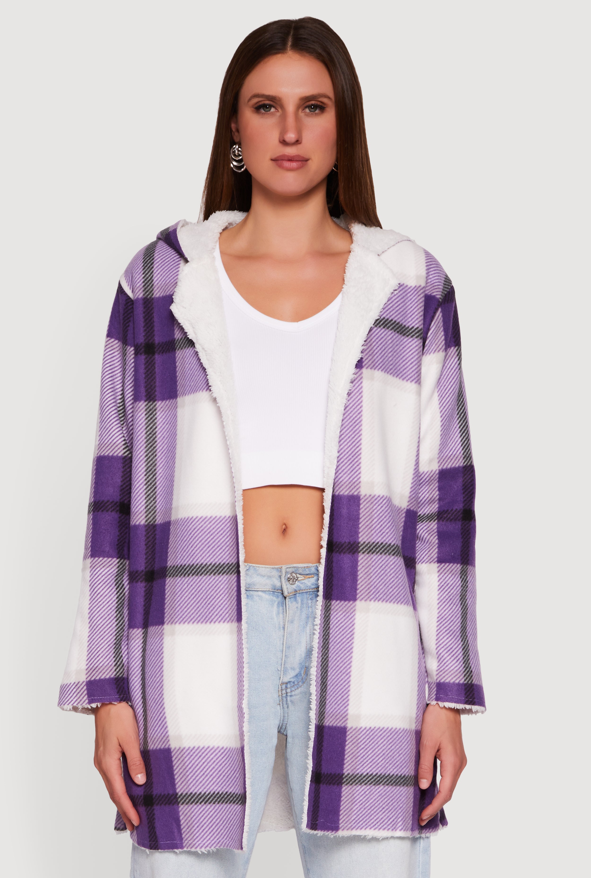 Plaid Patterned Hooded Open Front Sherpa Jacket