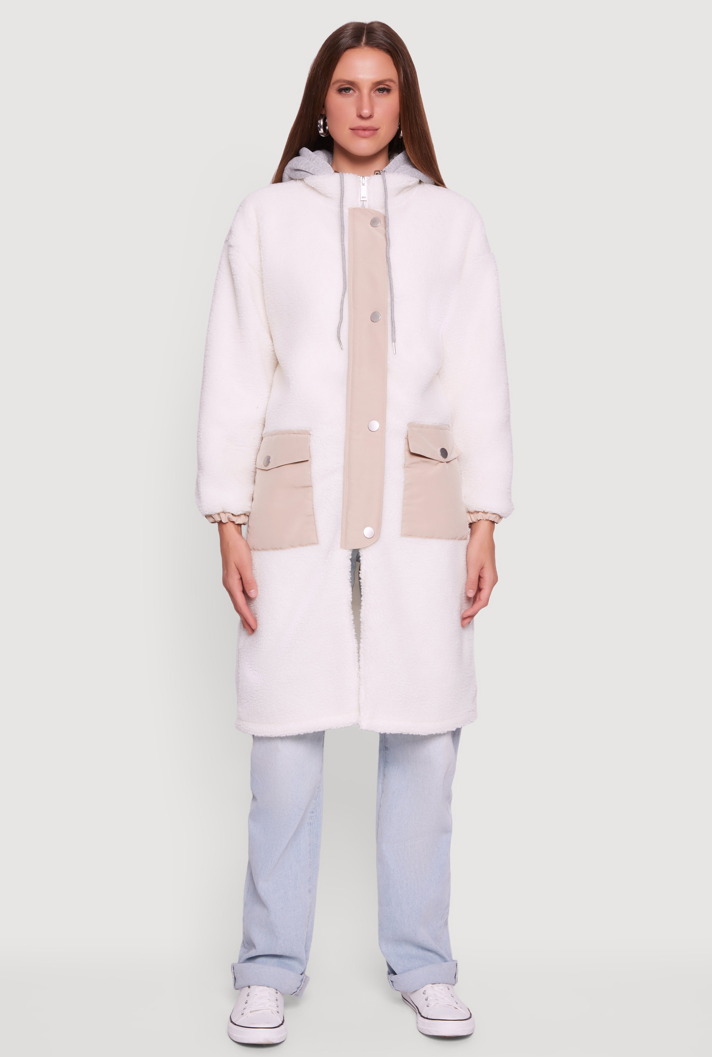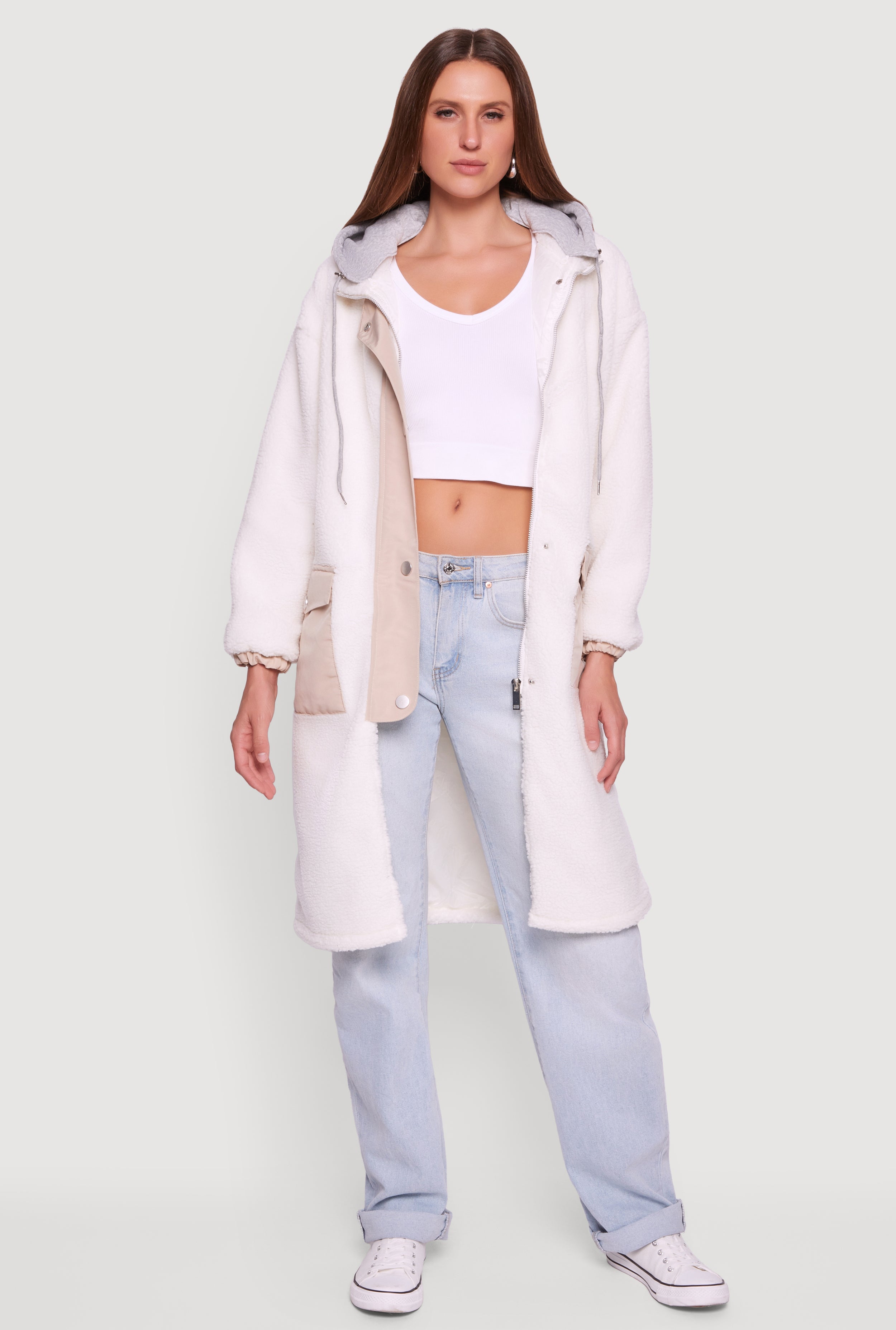 Snap Button Zip Front Sherpa Coat with Removable Hood