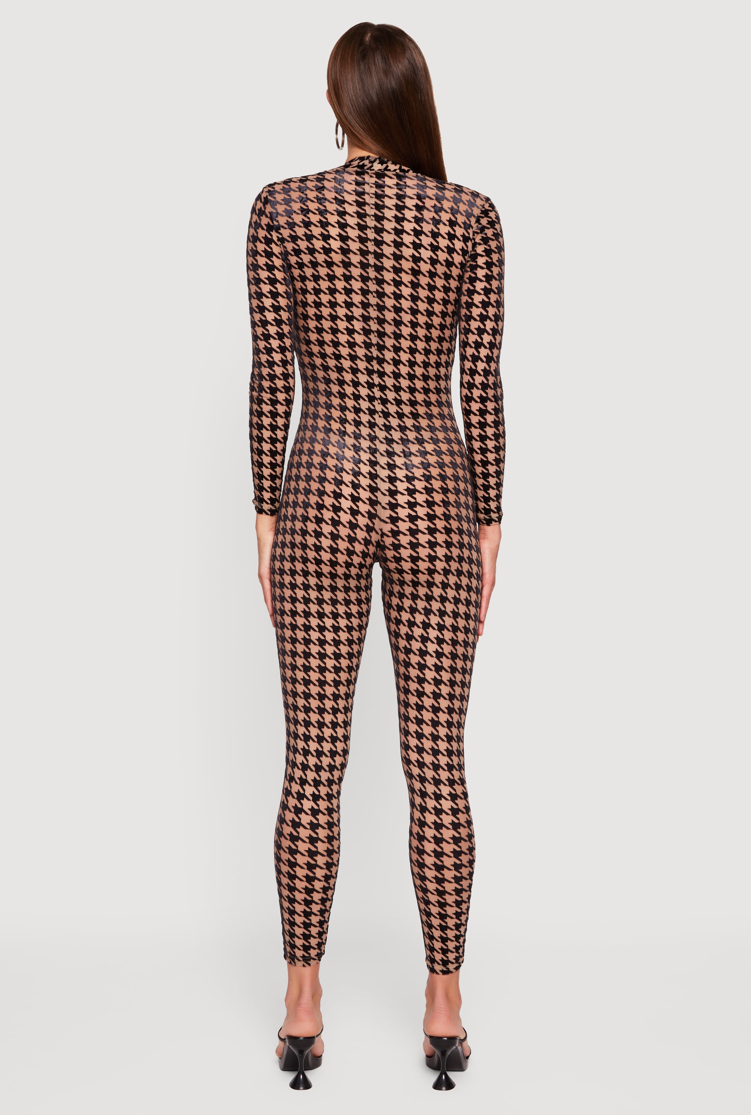 Step into the spotlight with this Houndstooth Velvet Burnout Jumpsuit designed to turn heads at every party or festival. Featuring a daring plunge neckline and sleek skinny legs, this full-length jumpsuit combines edgy mesh and luxe velvet burnout fabric for a texture-rich look that’s both bold and playful. Perfect for a night out when you want to feel confident and stylish without trying too hard.