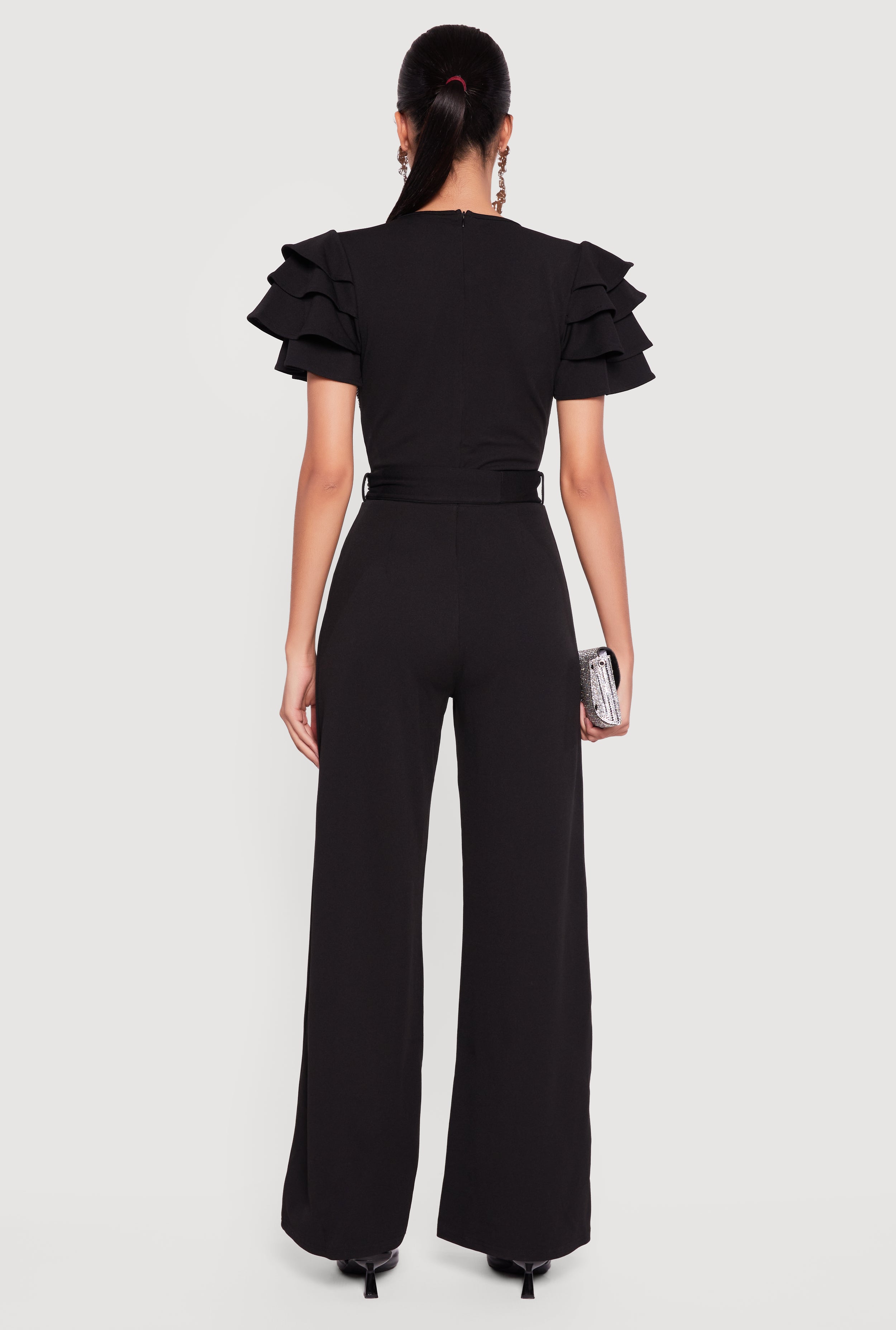 Step into effortless style with this Tiered Sleeve Tie Waist Belted Faux Wrap Jumpsuit. Designed to flatter every curve, it features a plunging neckline and tiered short sleeves that add a playful touch. The wide-leg pants create a flowy silhouette that moves with you, while the tie waist belt cinches your waist for a perfect fit. Crafted from soft crepe knit, this jumpsuit is your go-to for casual days, dressy nights, or any occasion in between where you want to feel confident and chic.