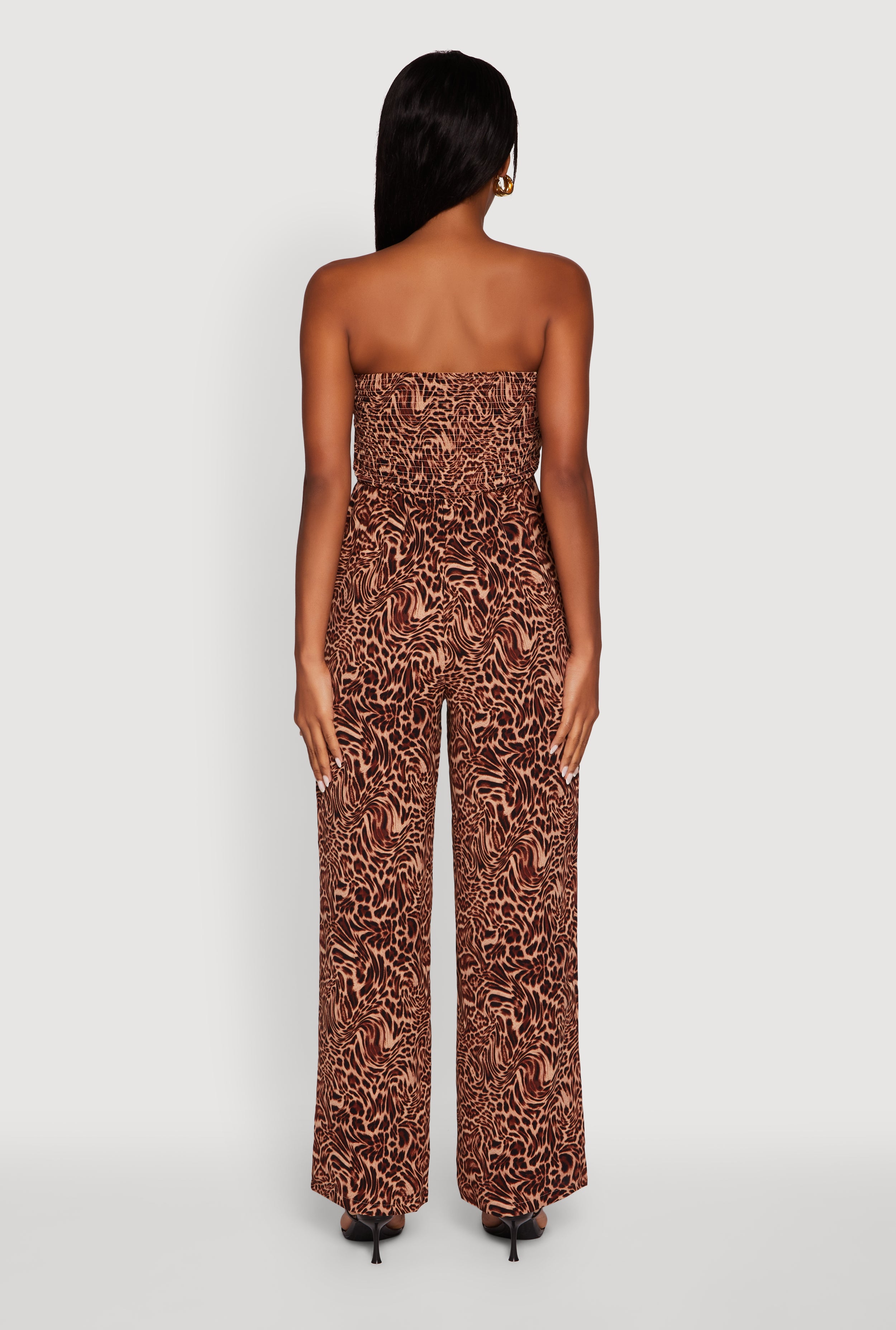 Airy Crepe Knit Strapless Smocked Printed Jumpsuit