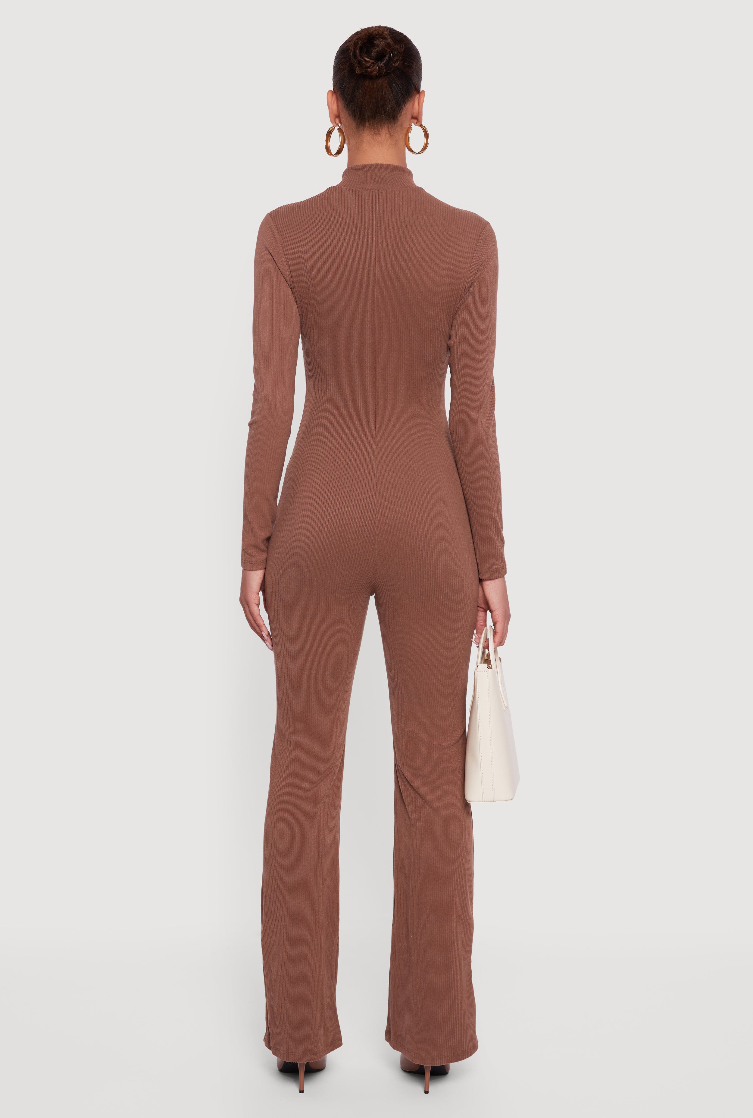 Step into effortless style with the Ribbed Knit Zip Front Mock Neck Jumpsuit. Designed for those who want to blend comfort and cool, this jumpsuit features a sleek zip front and a flattering mock neck that adds a touch of sophistication. The ribbed knit fabric hugs your curves in all the right places while keeping you cozy. Whether you're heading out for a casual day or a night out, its slim bootcut pant legs and long sleeves make it an easy go-to that feels as good as it looks.
