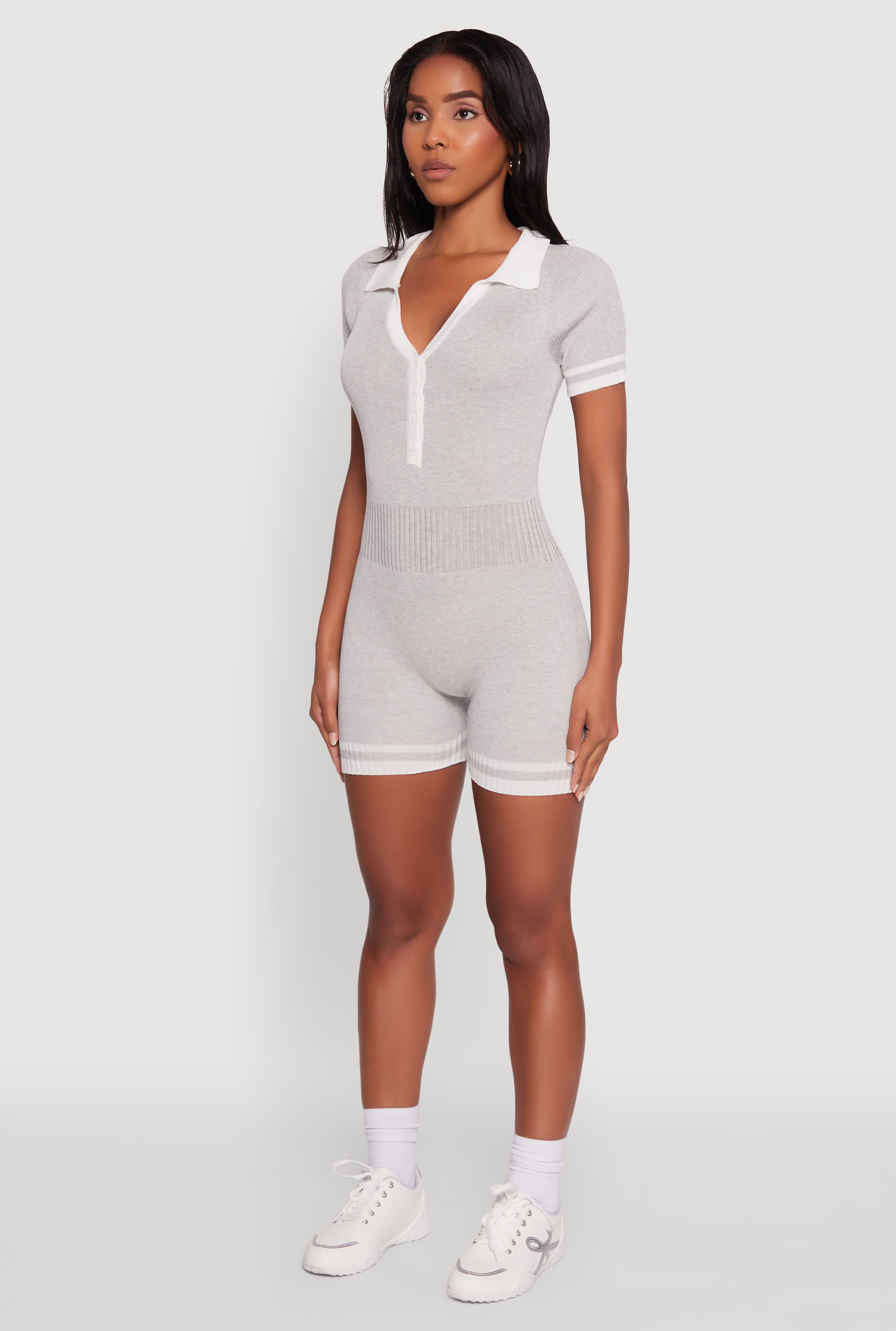 Step into effortless cool with the Daisy Ribbed Knit Varsity Stripe Button Front Romper. This curve-hugging piece features a sleek collar and sporty varsity stripes that bring streetwear vibes to your casual days. The ribbed knit fabric feels soft and moves with you, making it perfect for everything from quick errands to laid-back hangouts. Button front details add a fun twist, while the short sleeves keep it fresh and easy to wear. Ready to elevate your everyday style? This romper is your new go-to for athleisure-inspired looks that never sacrifice comfort.