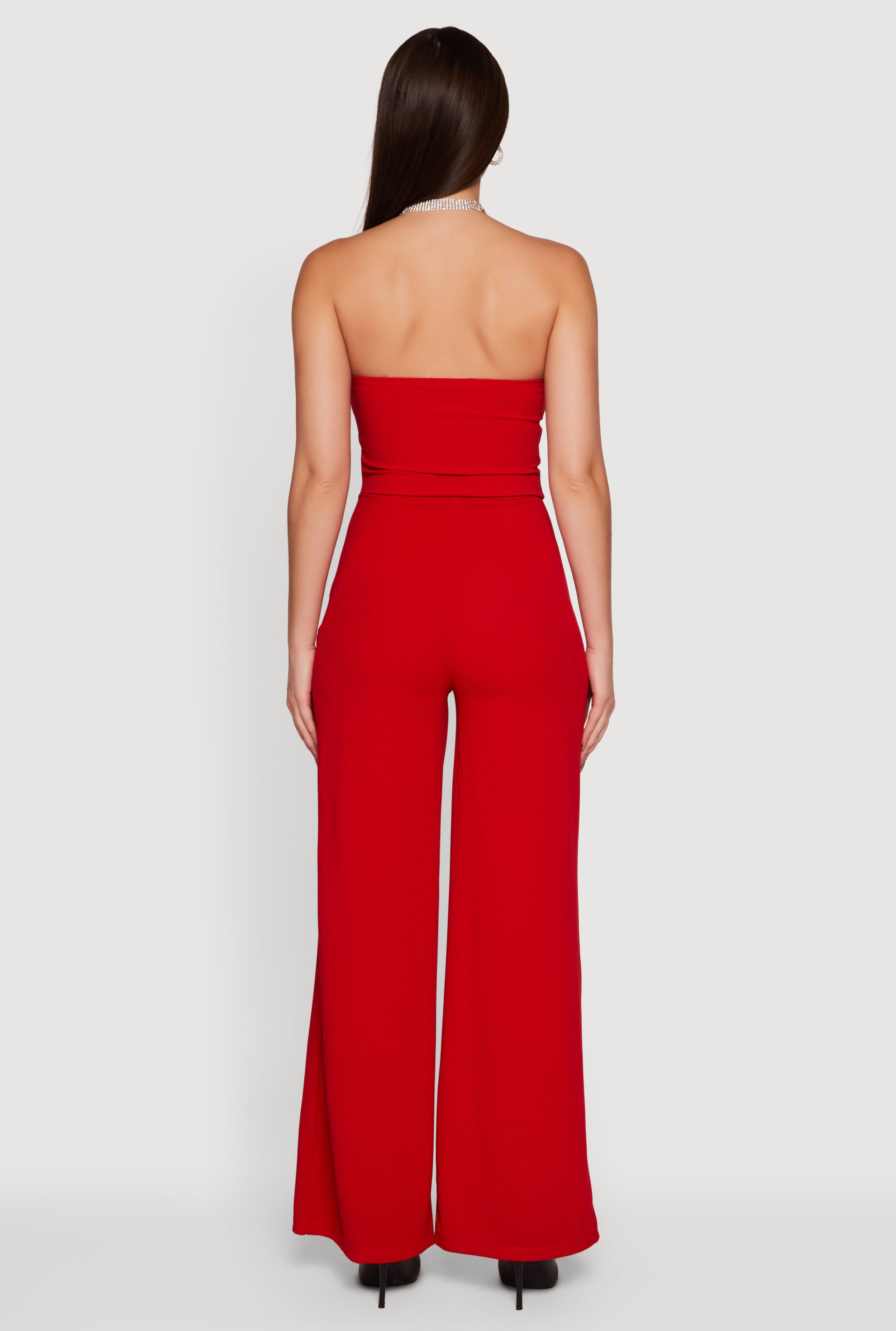 Step into the spotlight with the Rhinestone Buckle Detail Tube Jumpsuit, your new go-to for nights that demand a little extra sparkle. This strapless, sleeveless jumpsuit features a chic wide-leg silhouette crafted from soft crepe knit for all-night comfort and style. The eye-catching rhinestone buckle adds a touch of glam while the open back and sleek zipper closure keep things effortlessly cool. Perfect for parties or a night out, this solid black jumpsuit lets you shine without trying too hard.