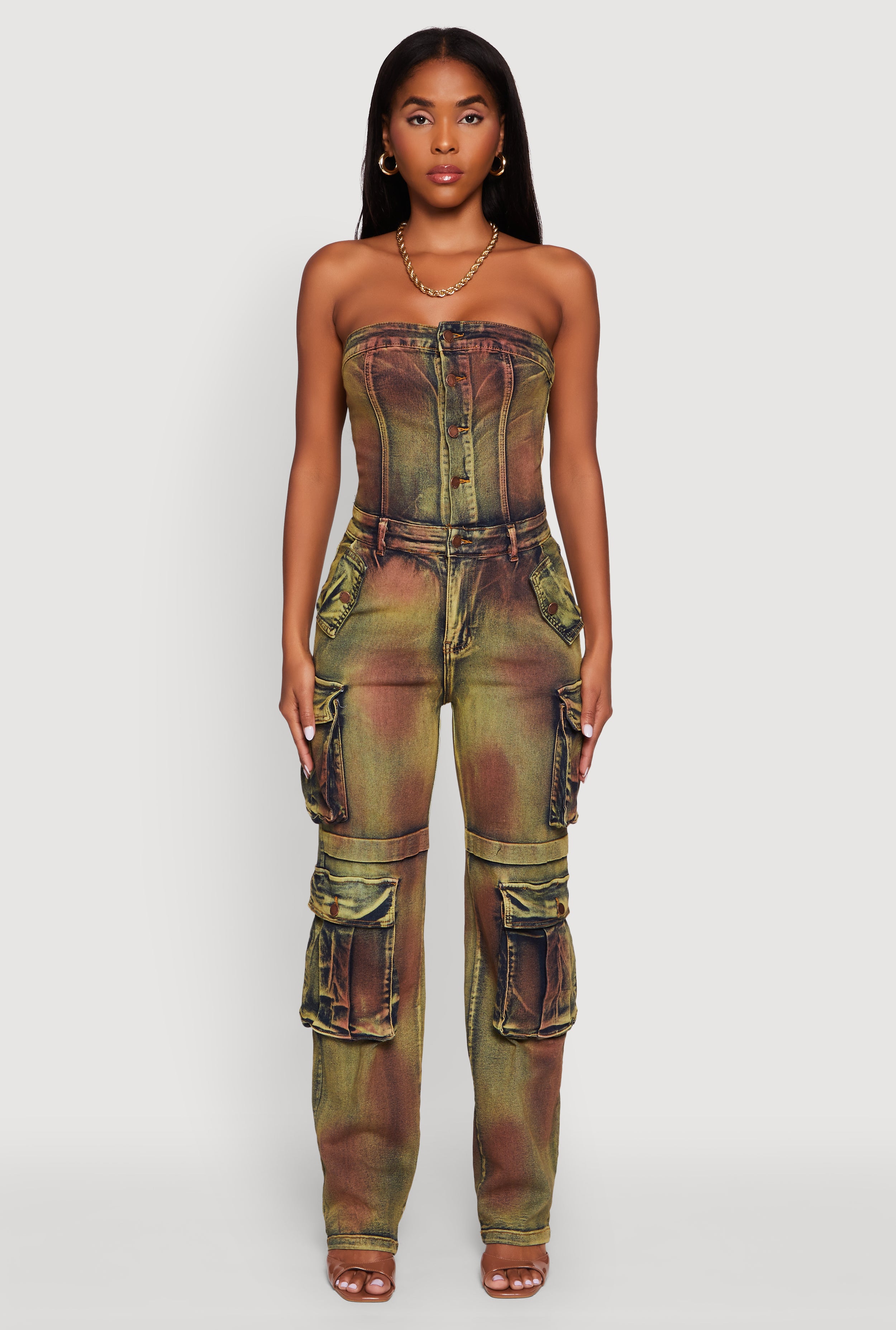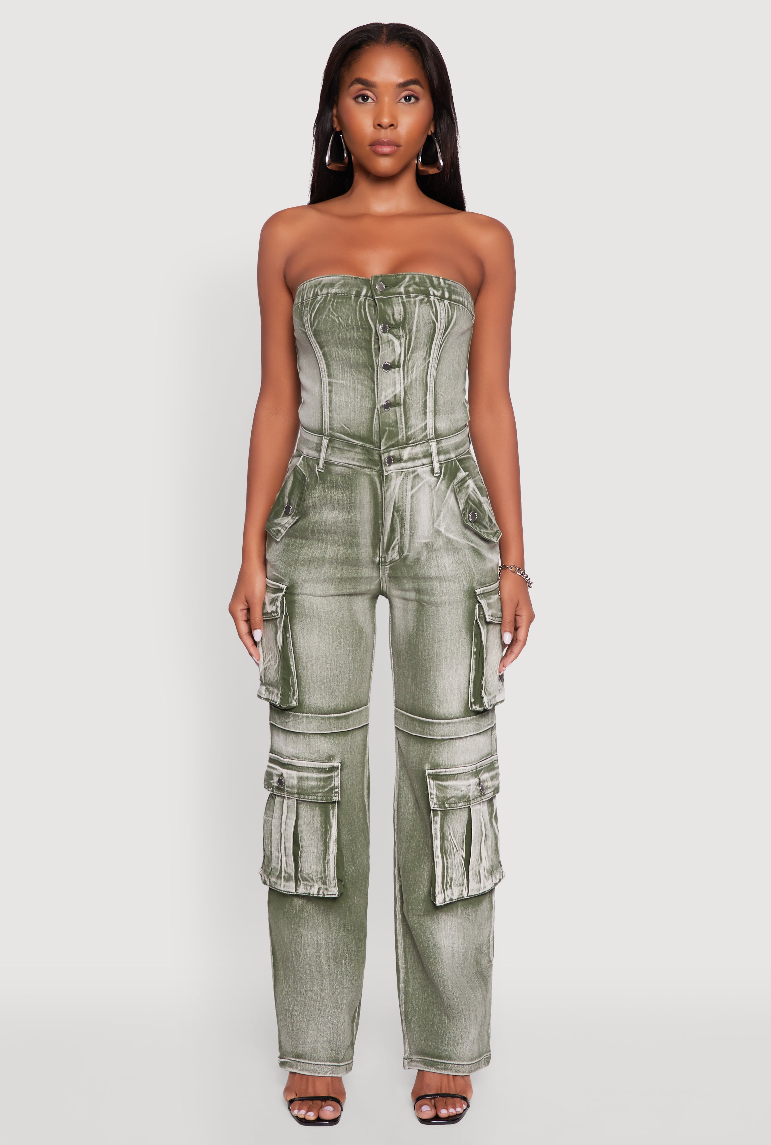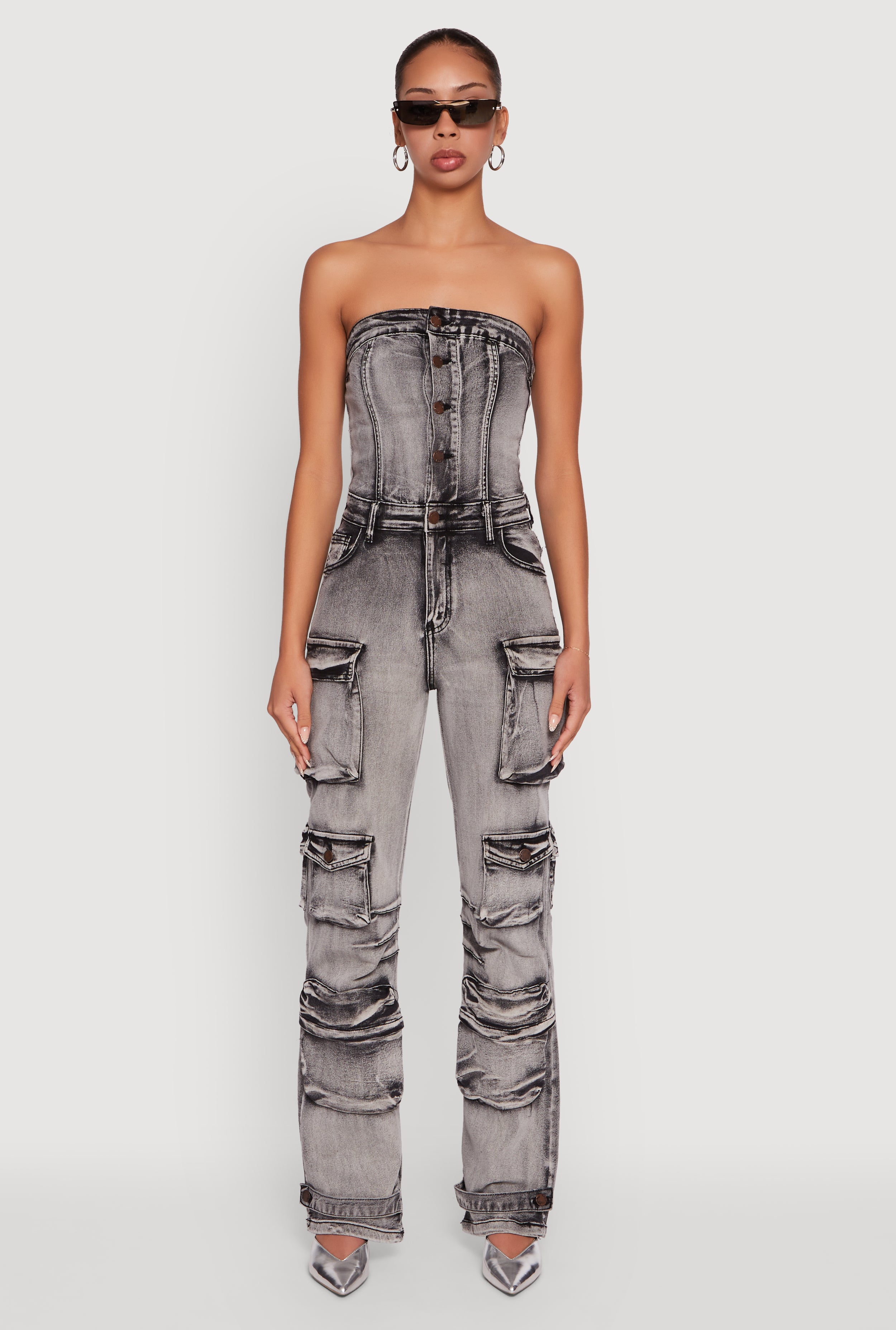 Acid Wash Button Front Tube Utility Jumpsuit