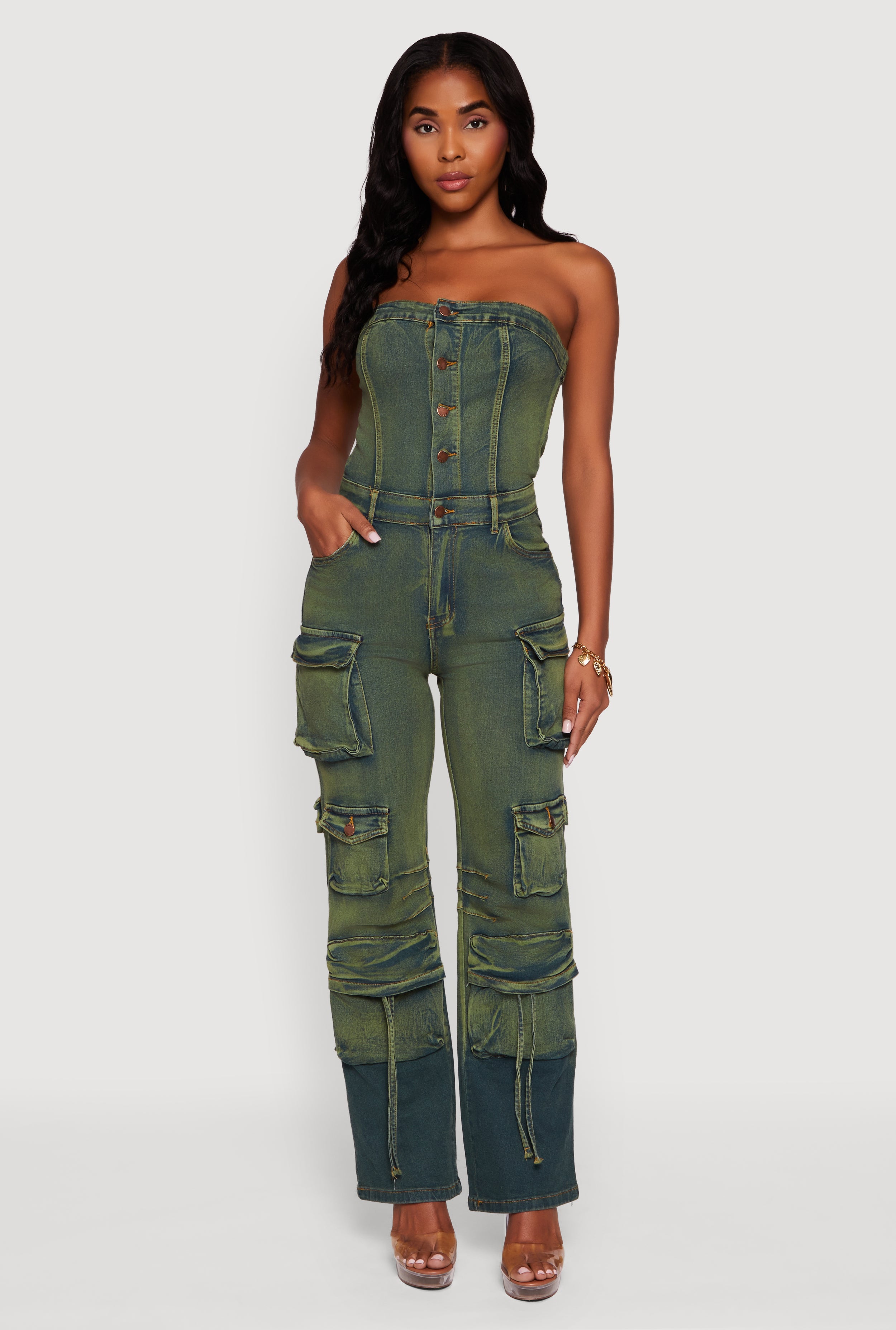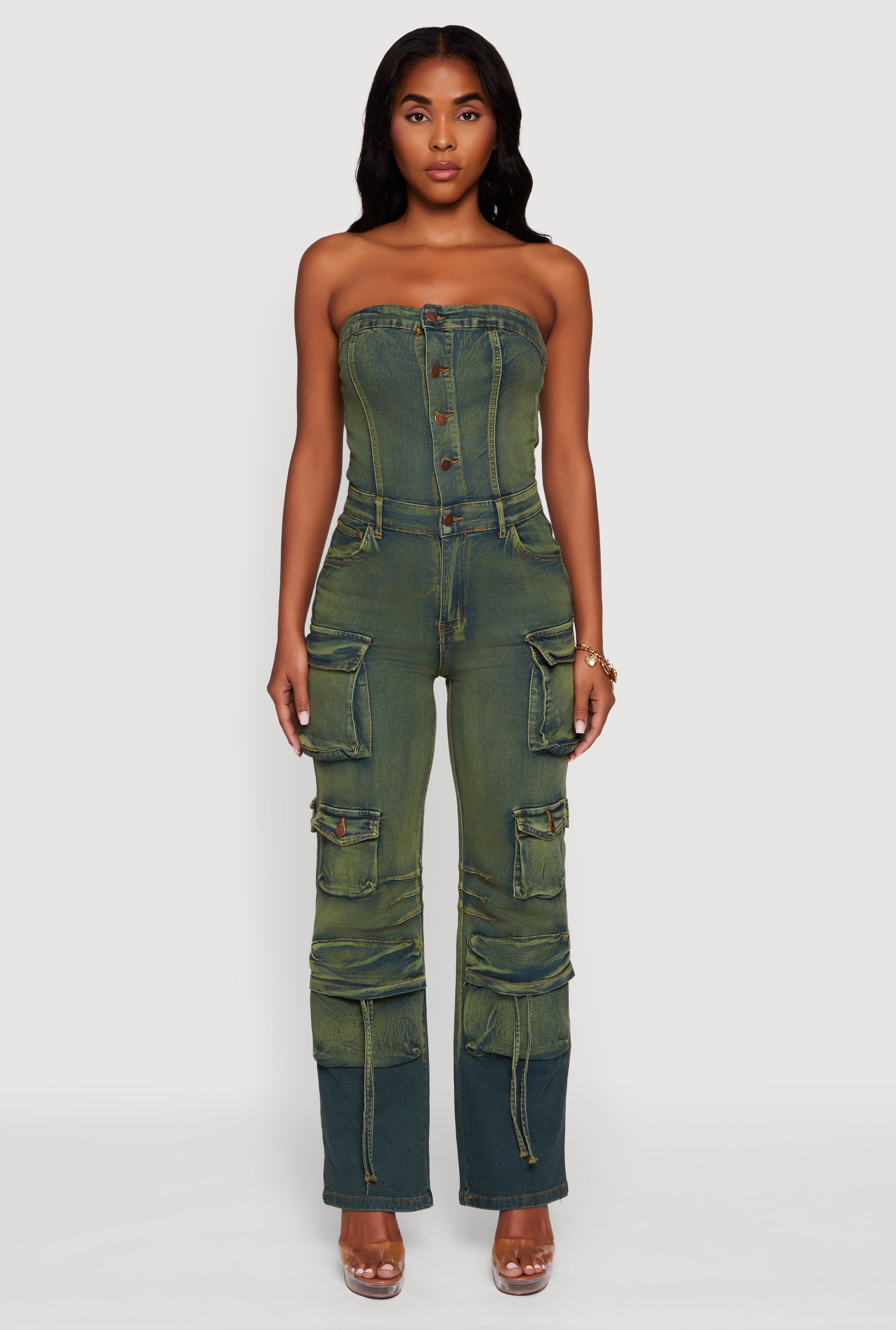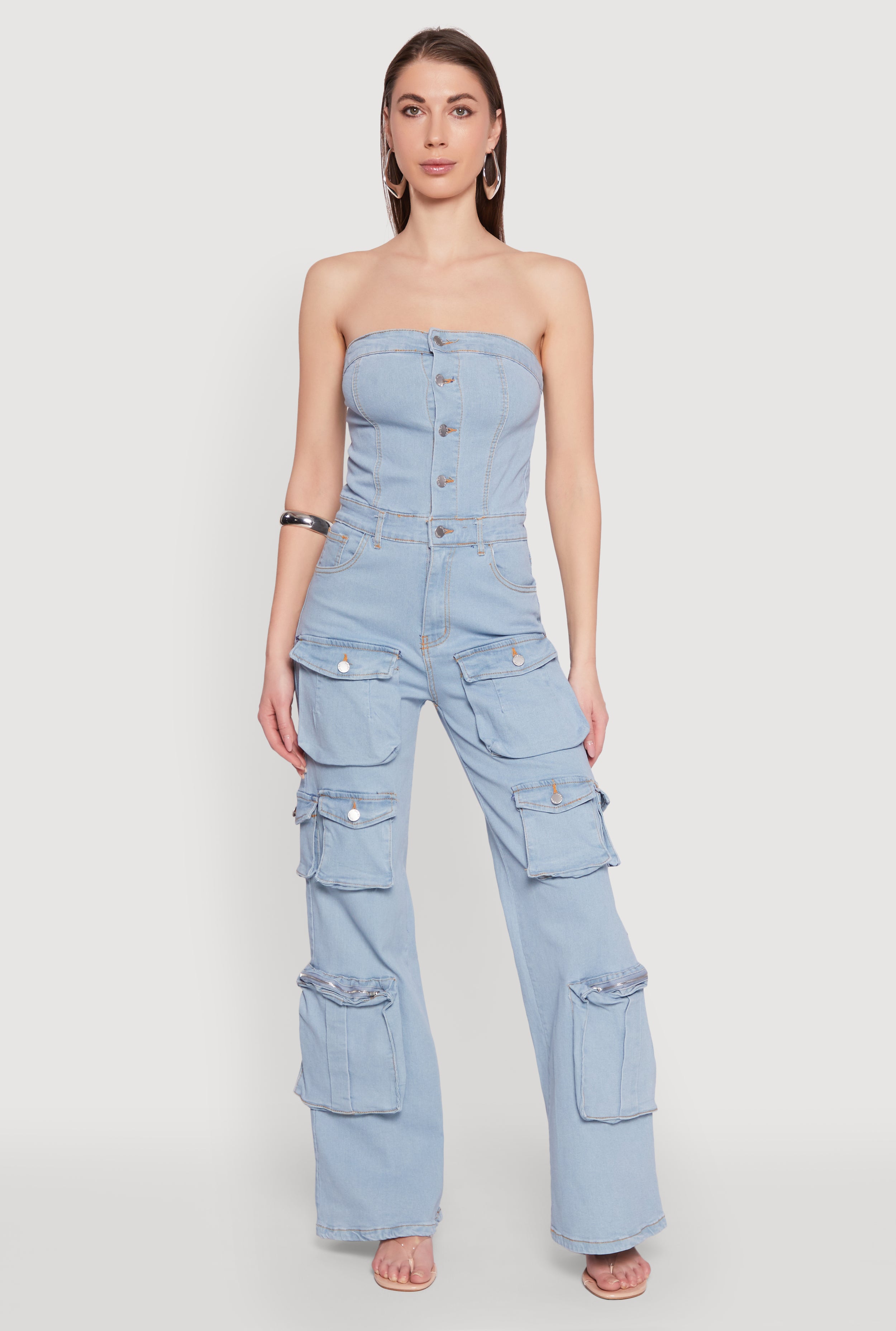 Acid Wash Denim Multi Cargo Pocket Strapless Jumpsuit
