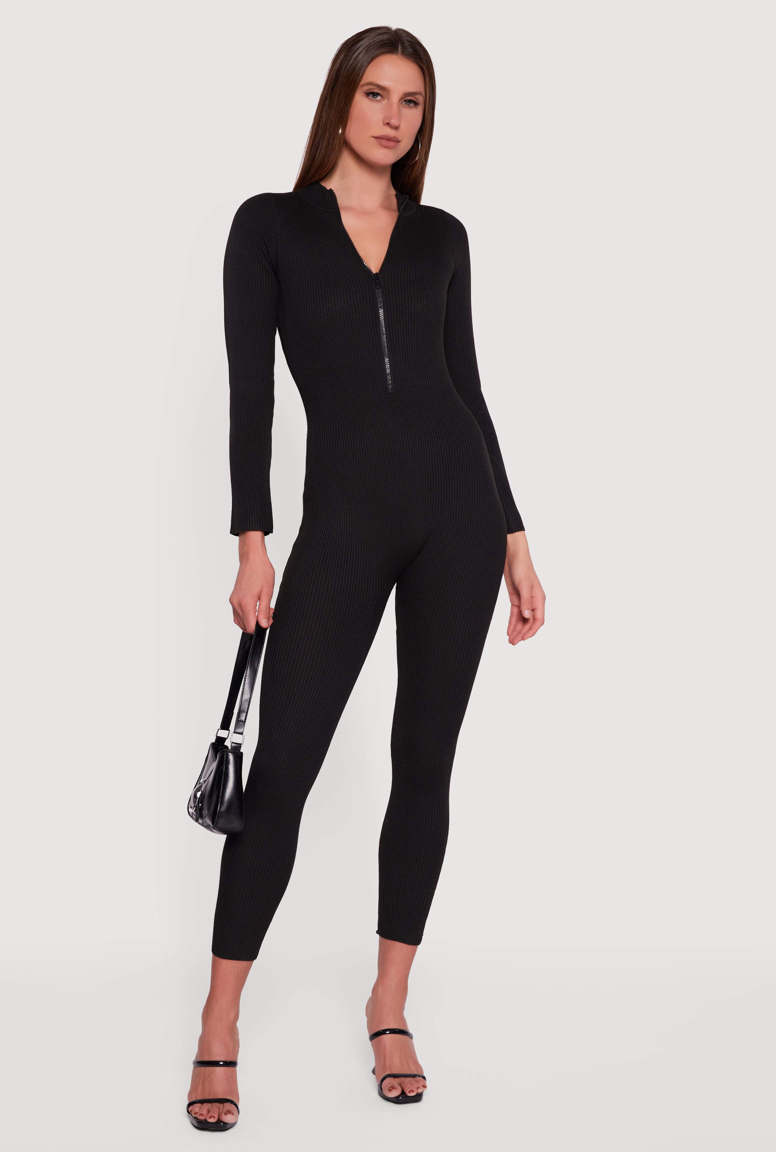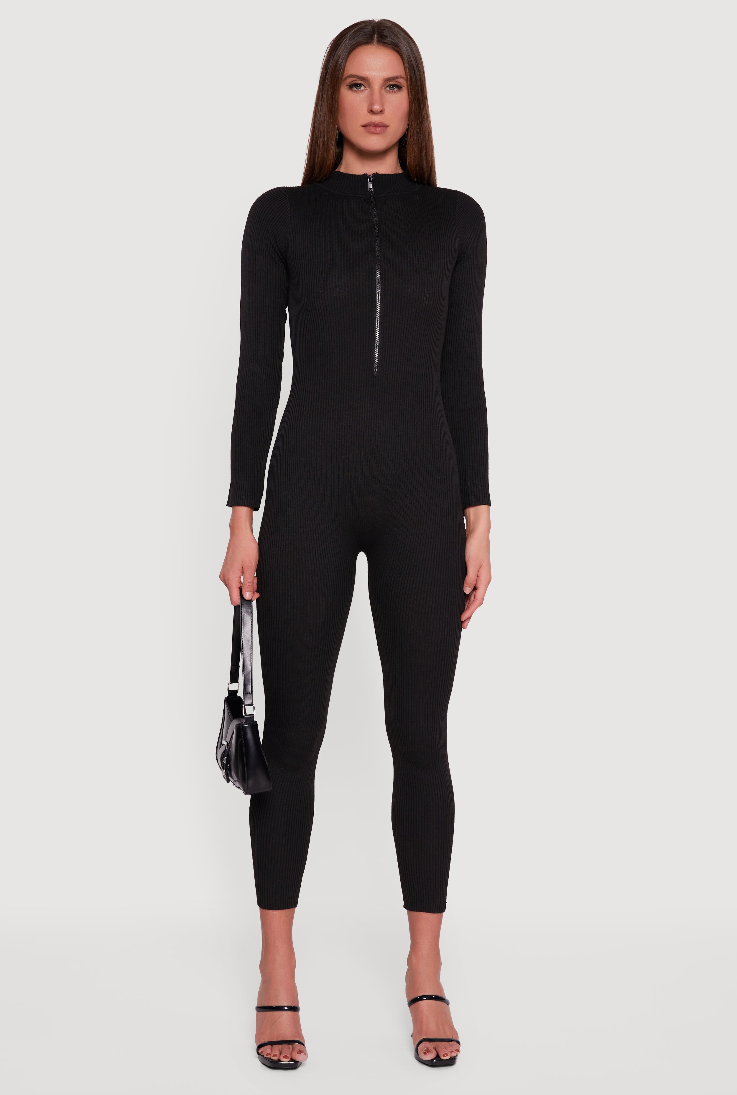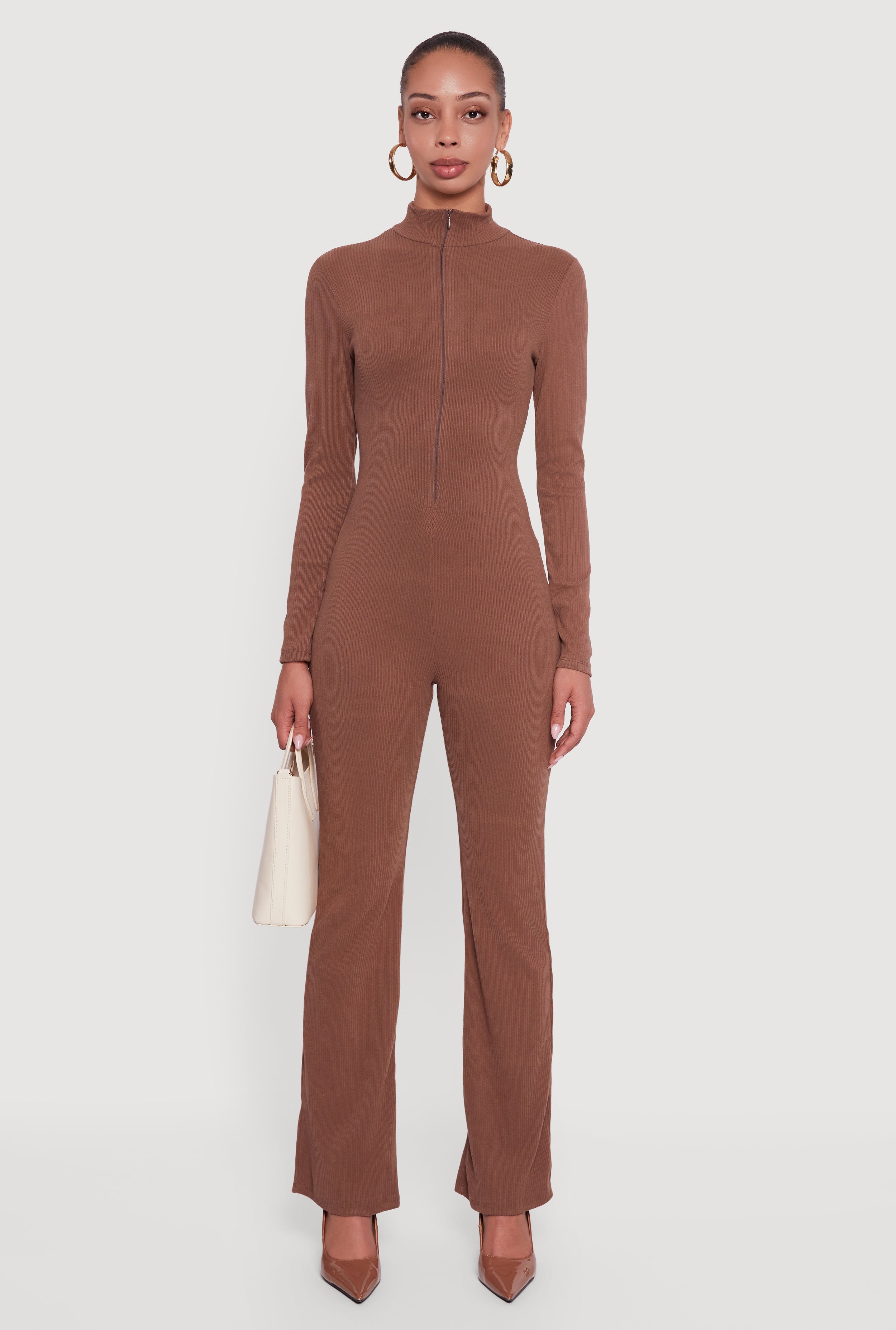 Zip Front Mock Neck Ribbed Knit Jumpsuit