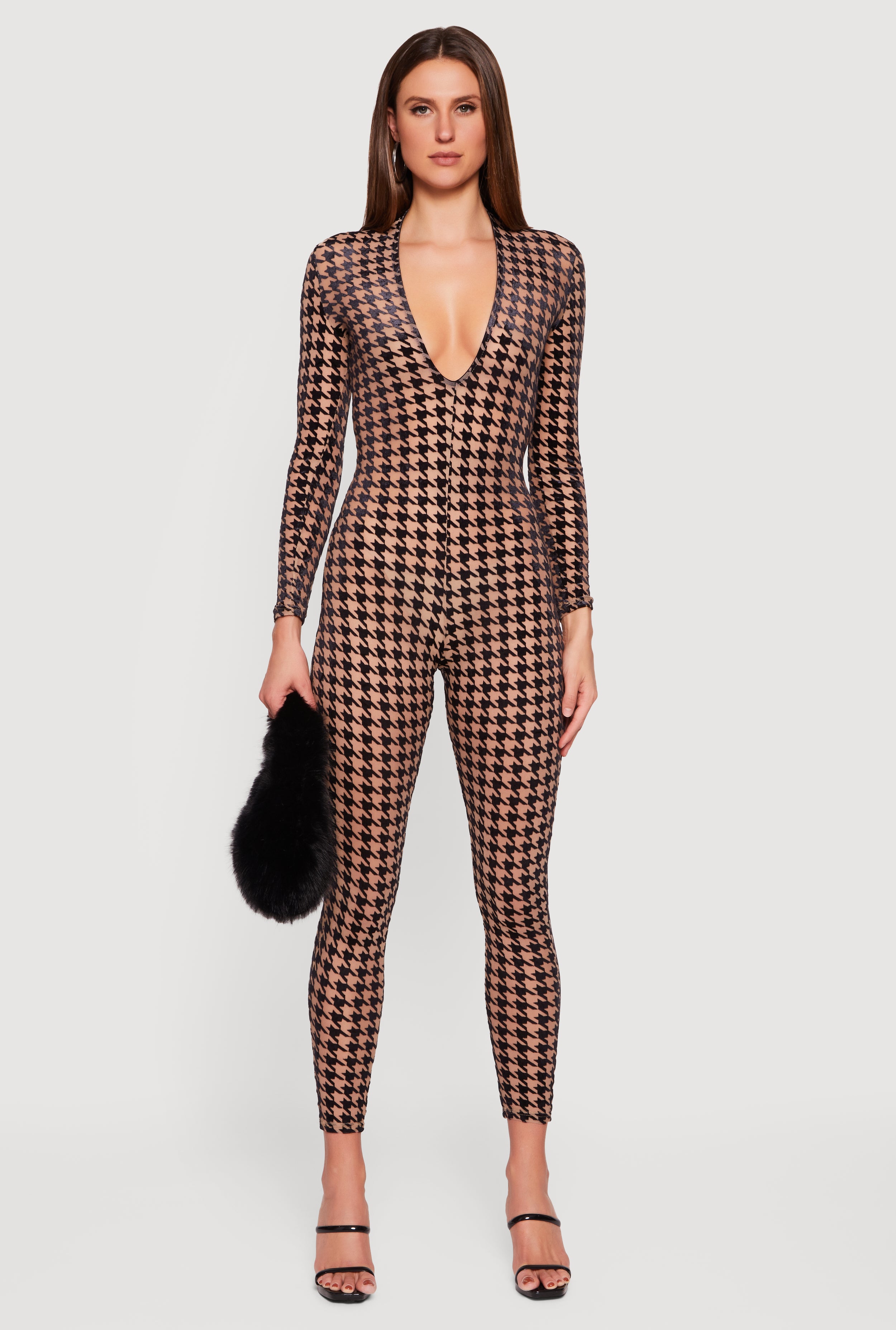 Houndstooth Velvet Burnout Long Sleeve Plunge Neck Jumpsuit