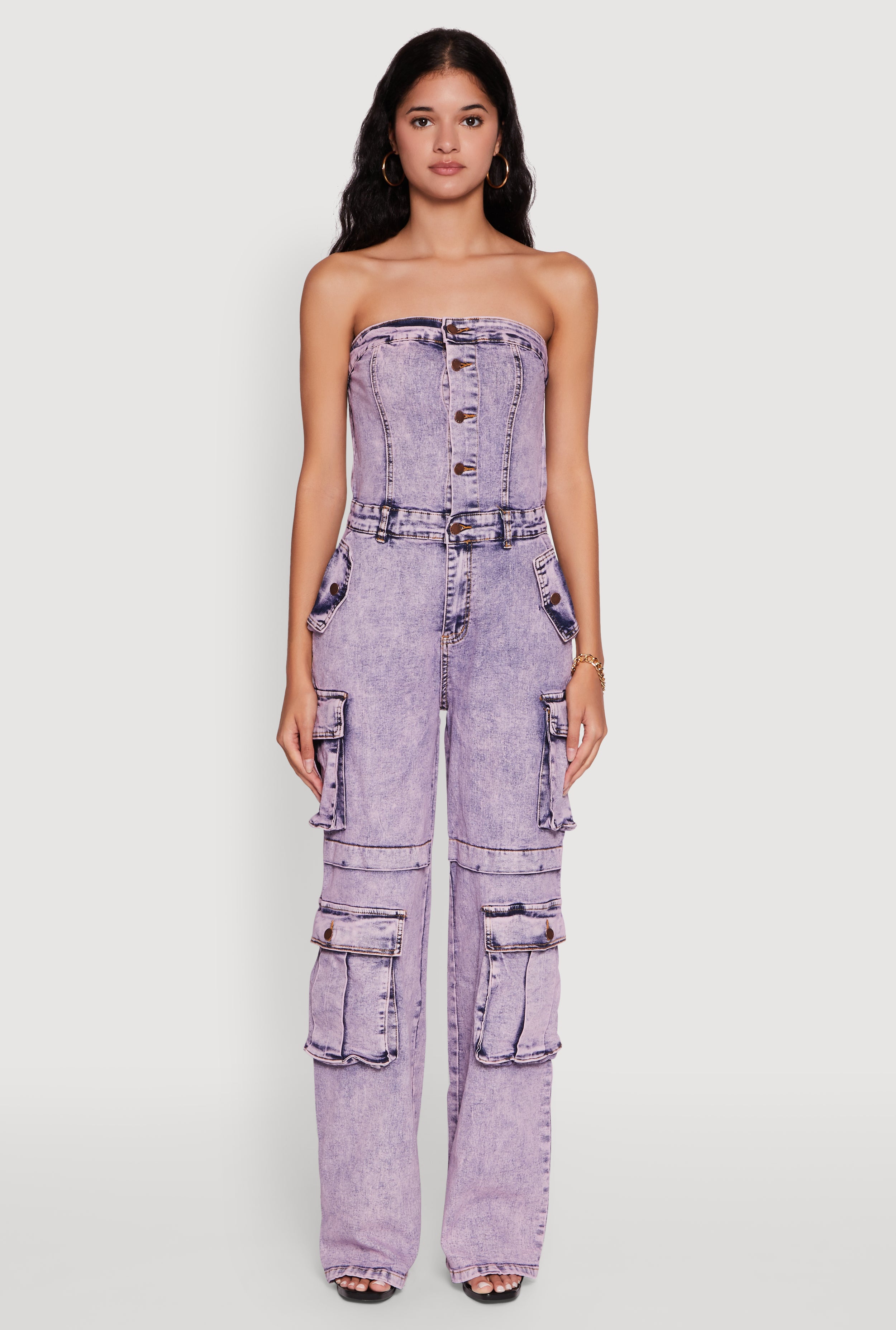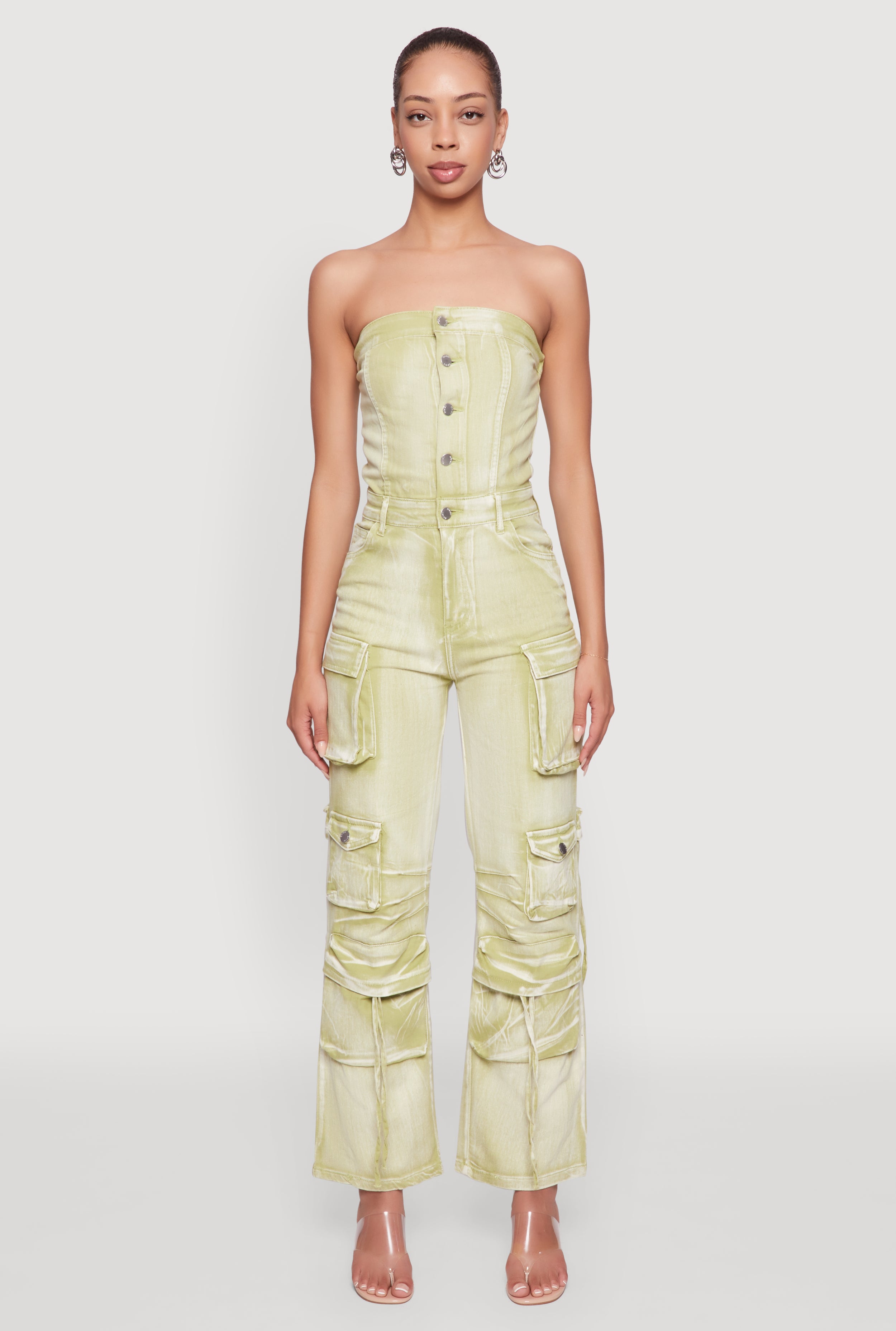 Acid Wash Strapless Button Front Utility Jumpsuit
