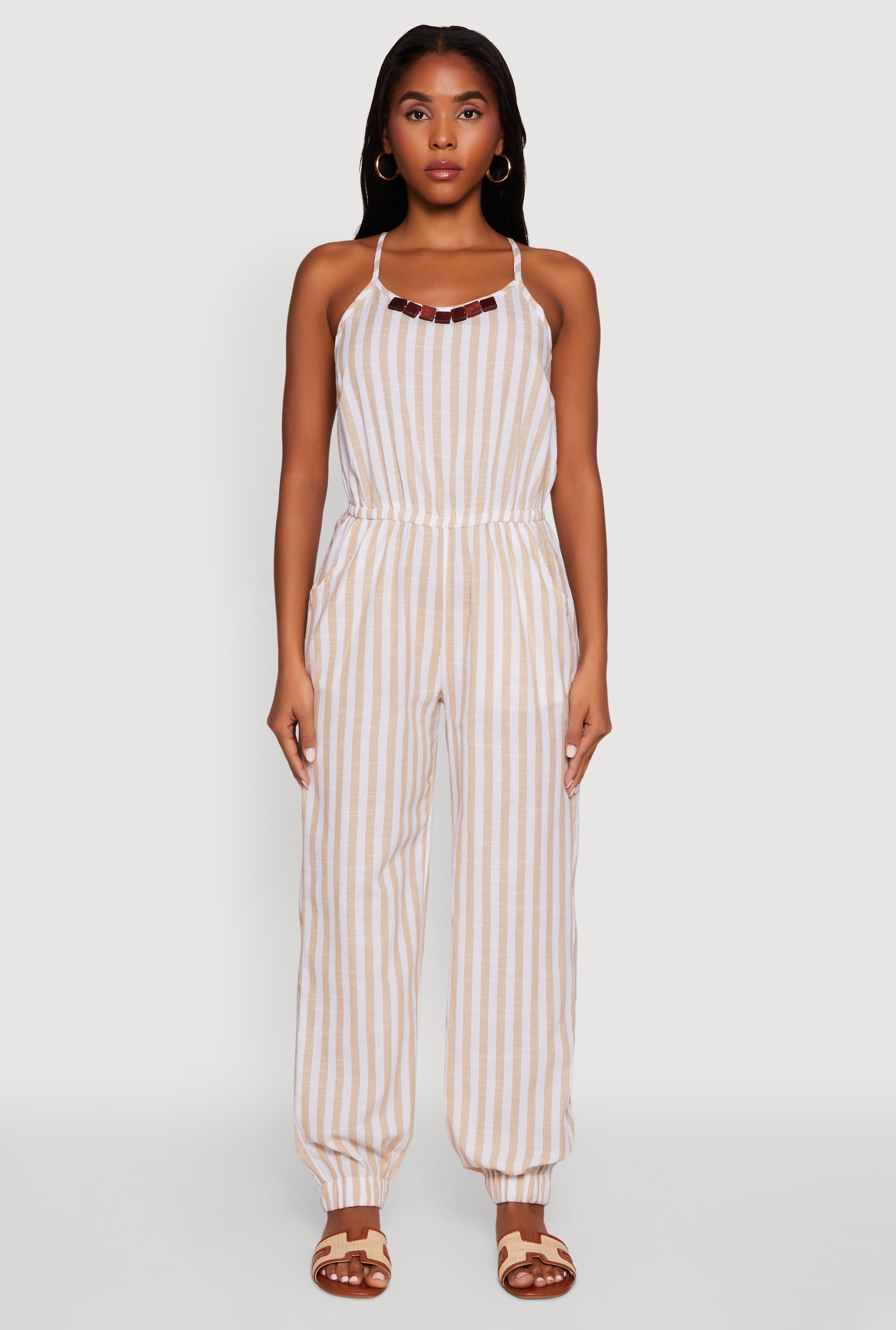 Wooden Beaded Detail Striped Jumpsuit