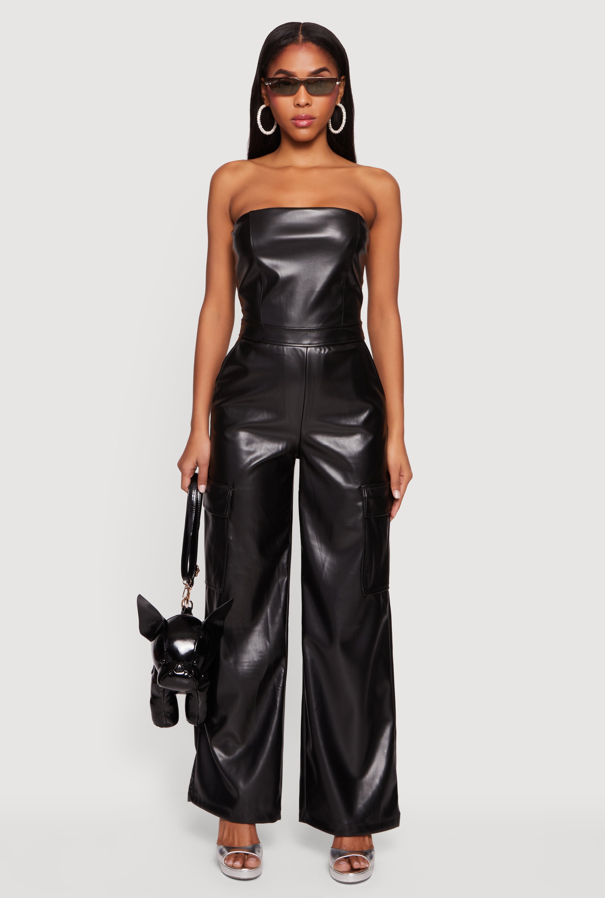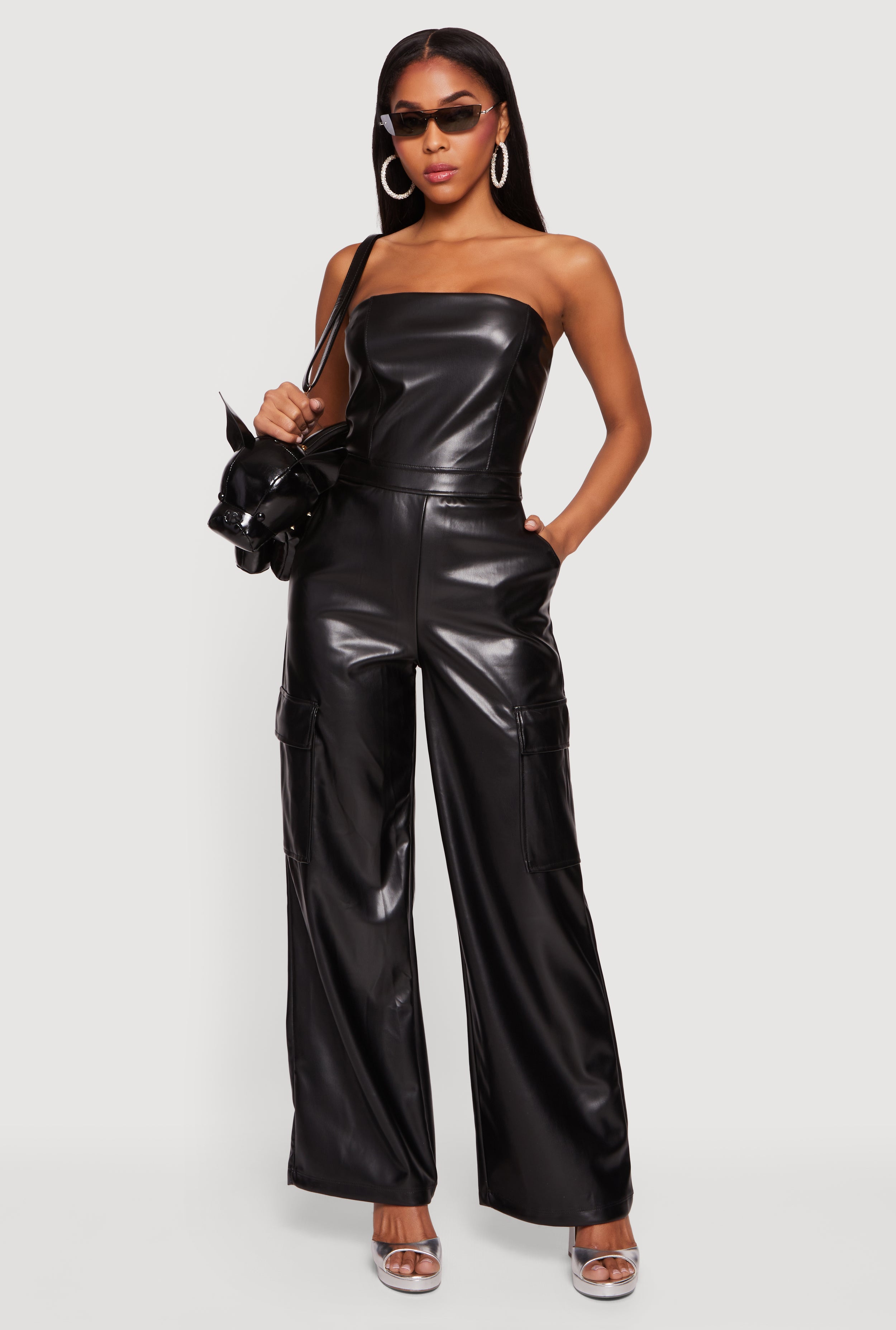 Faux Leather Strapless Wide Leg Cargo Jumpsuit