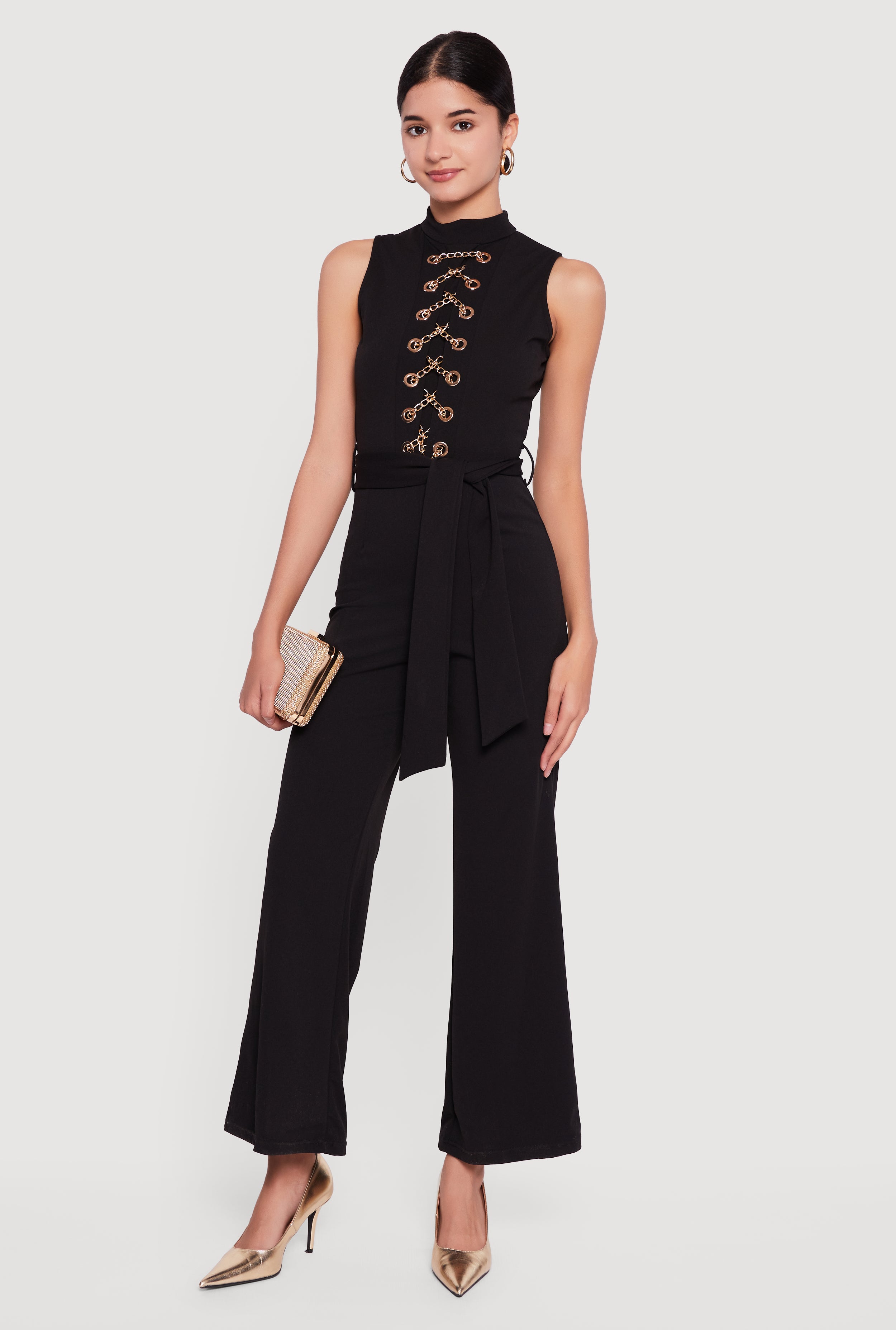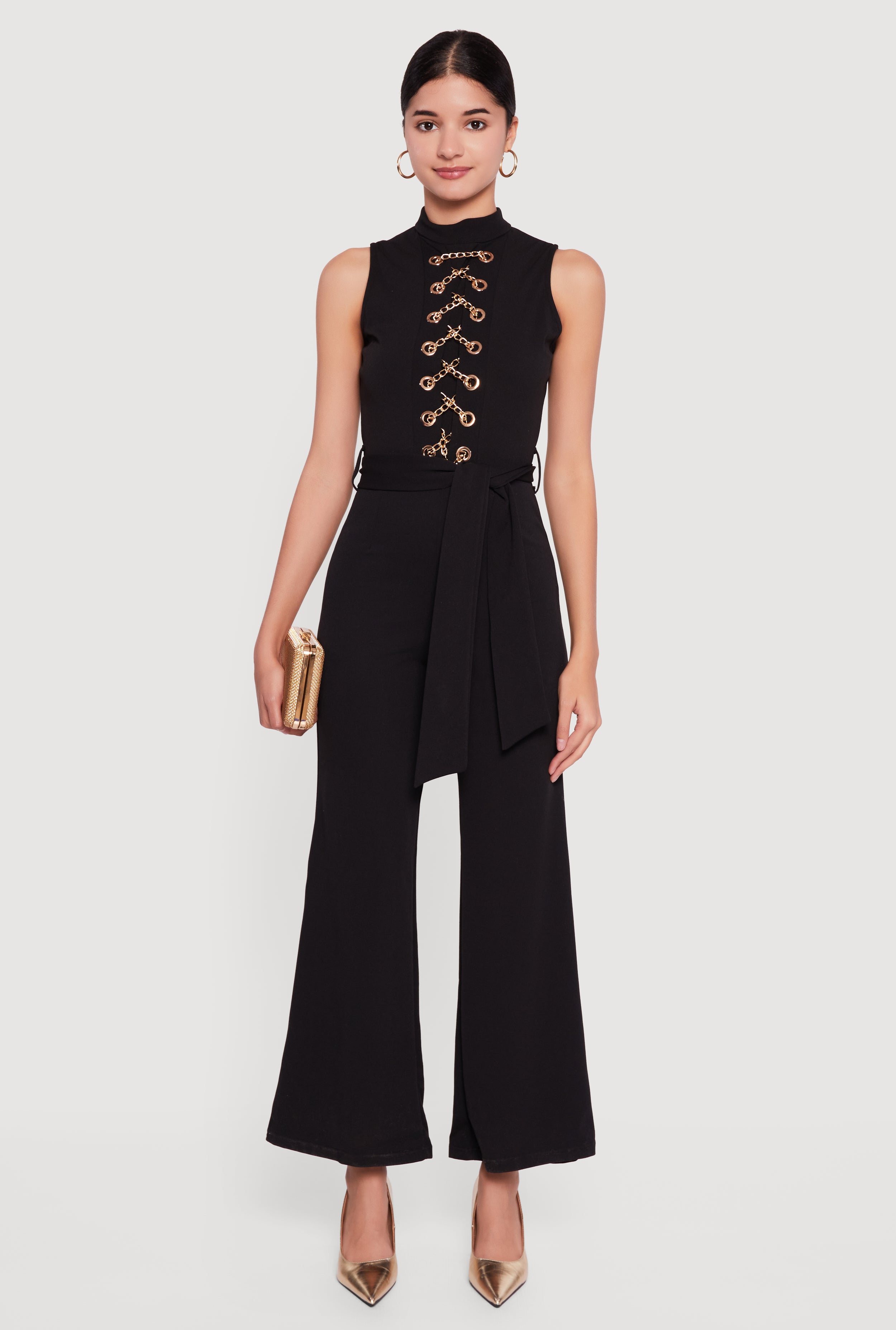Chain Lace Up Crepe Knit Flare Leg Jumpsuit