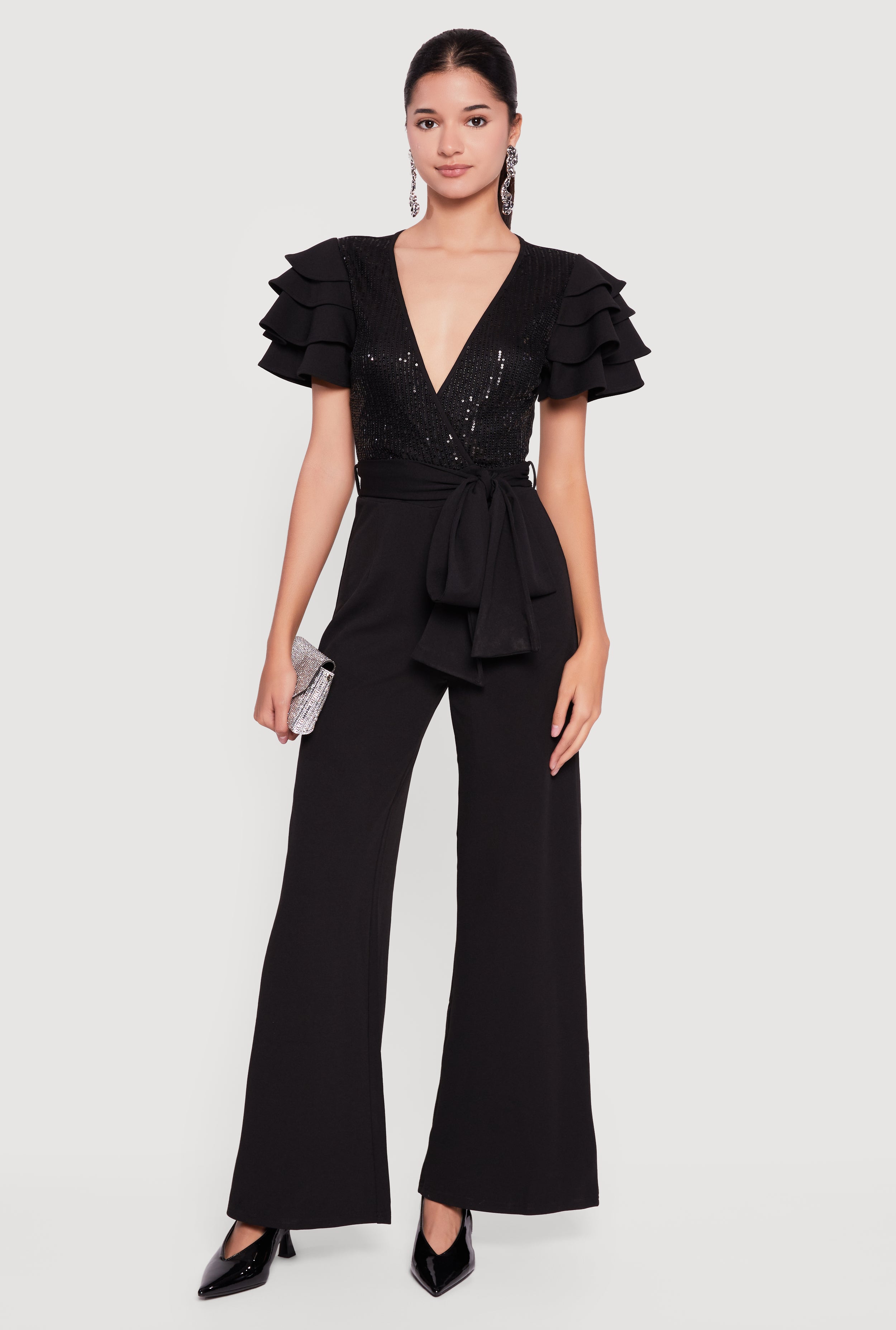 Tiered Sleeve Tie Waist Belted Faux Wrap Jumpsuit