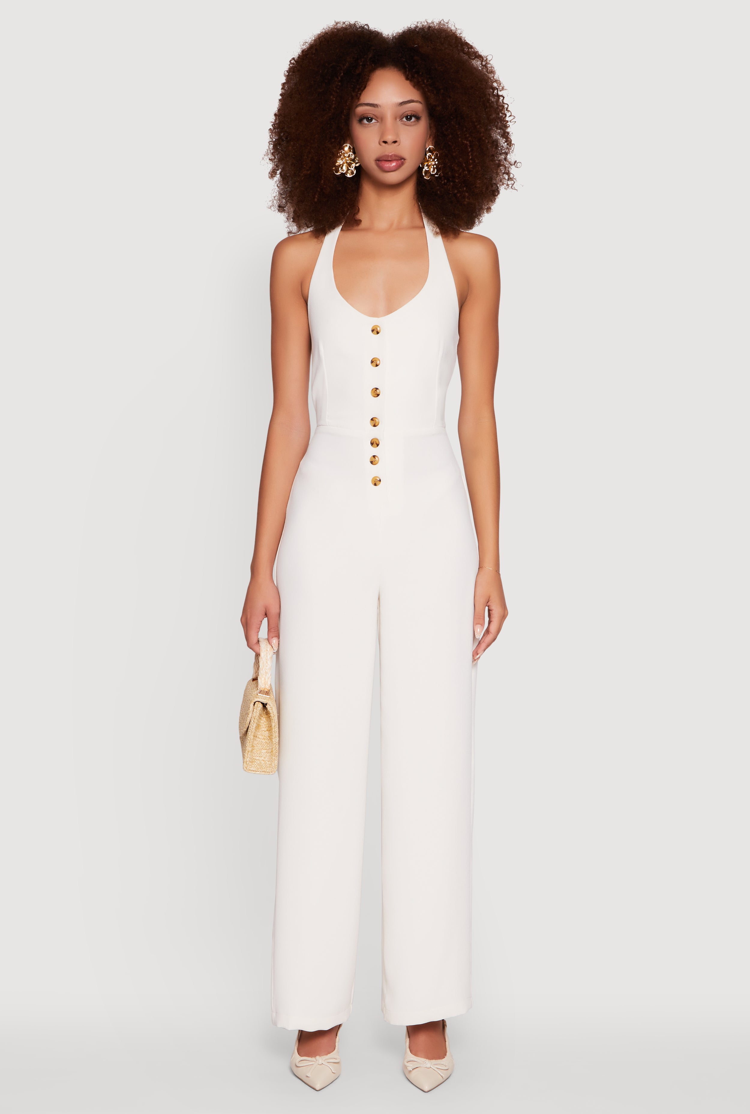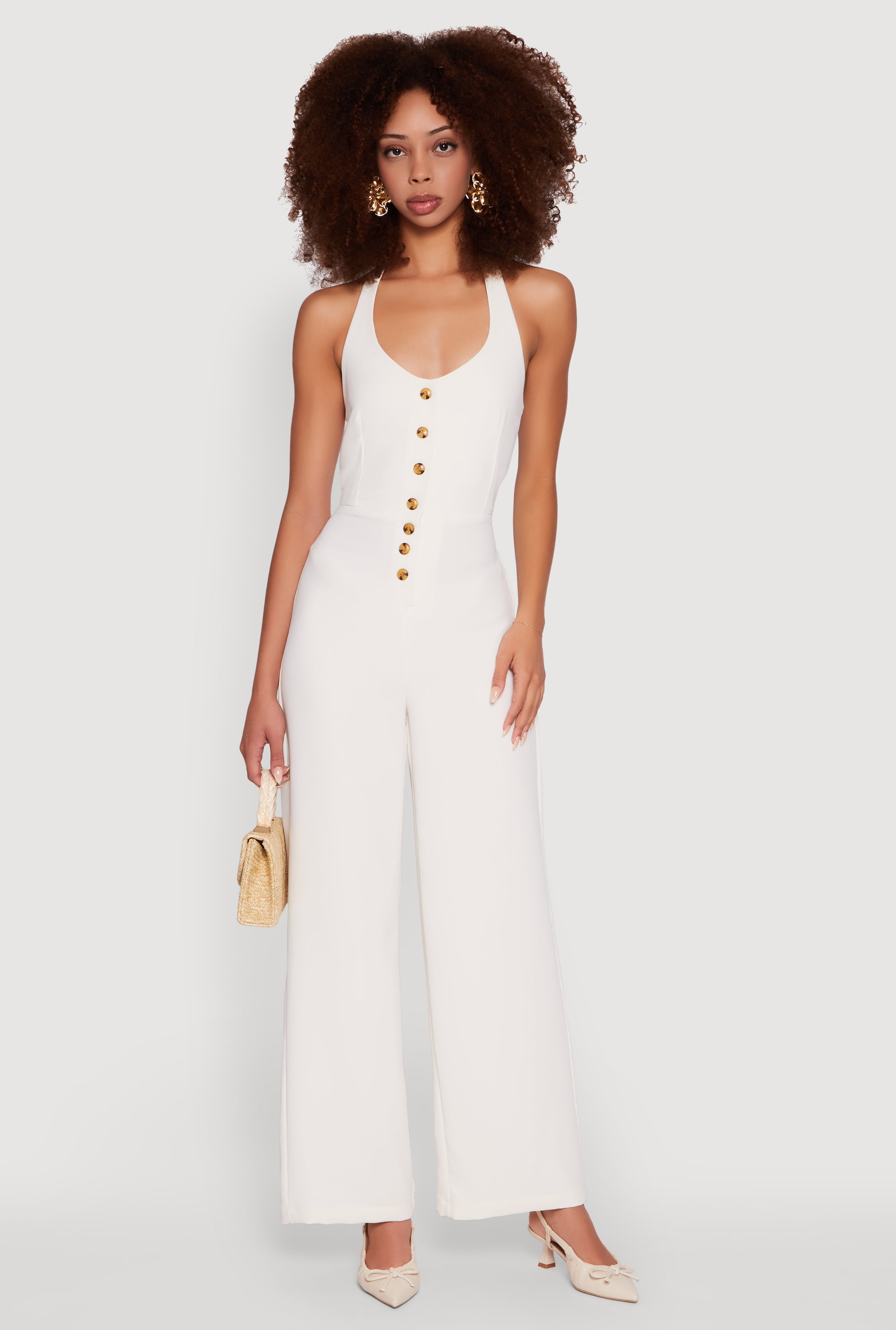 Crepe Knit Button Front Halter Jumpsuit