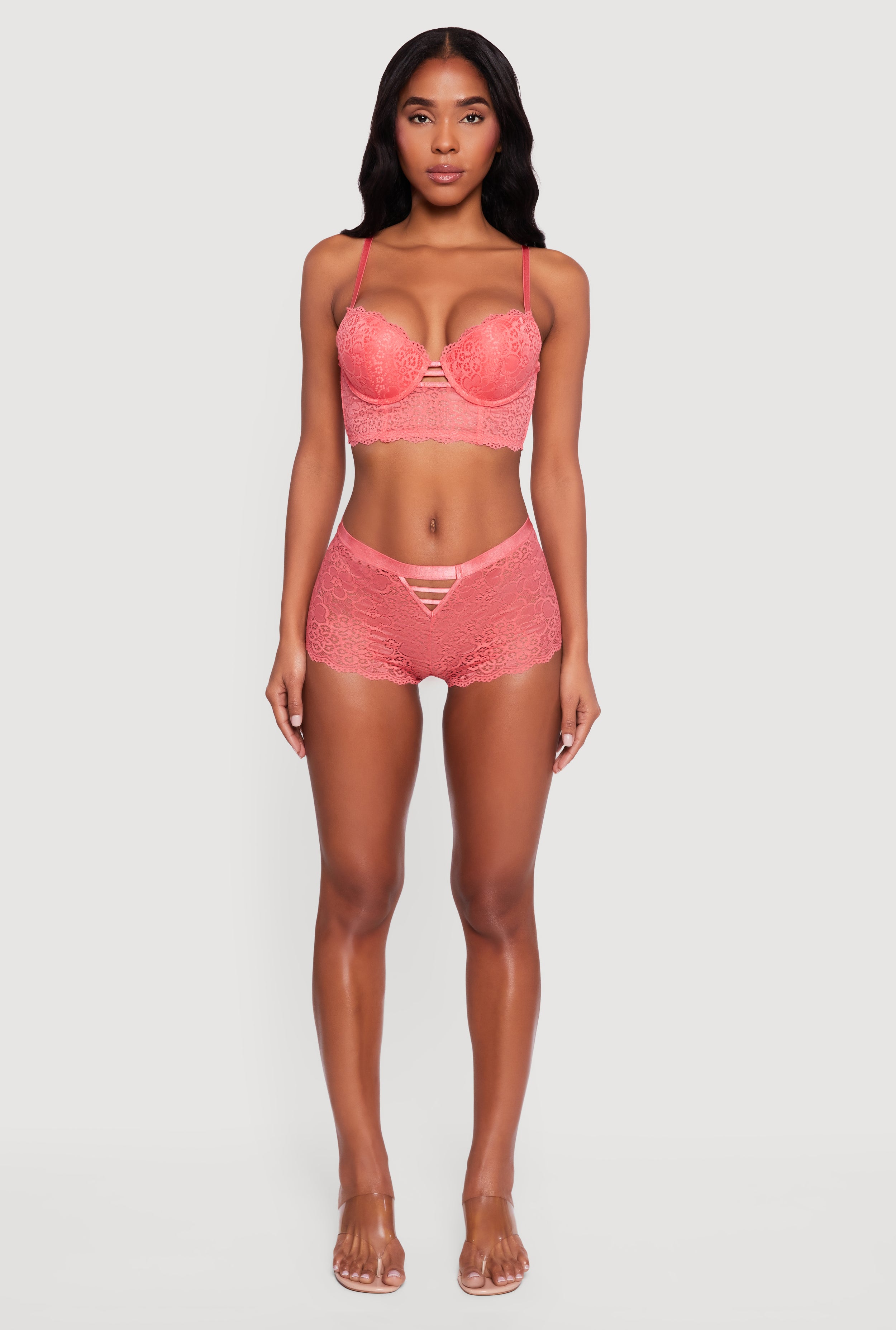 Elevate your lingerie game with this Trendy Caged Detail Plunge Longline Bra. Designed to turn heads, it features a daring plunge neckline and stylish caged details that add an edgy vibe to your look. The longline silhouette offers extra support and a smooth fit, making it perfect for layering or wearing on its own. Finished with delicate lace and light padding, this bra combines comfort with a flirty, fashion-forward edge.