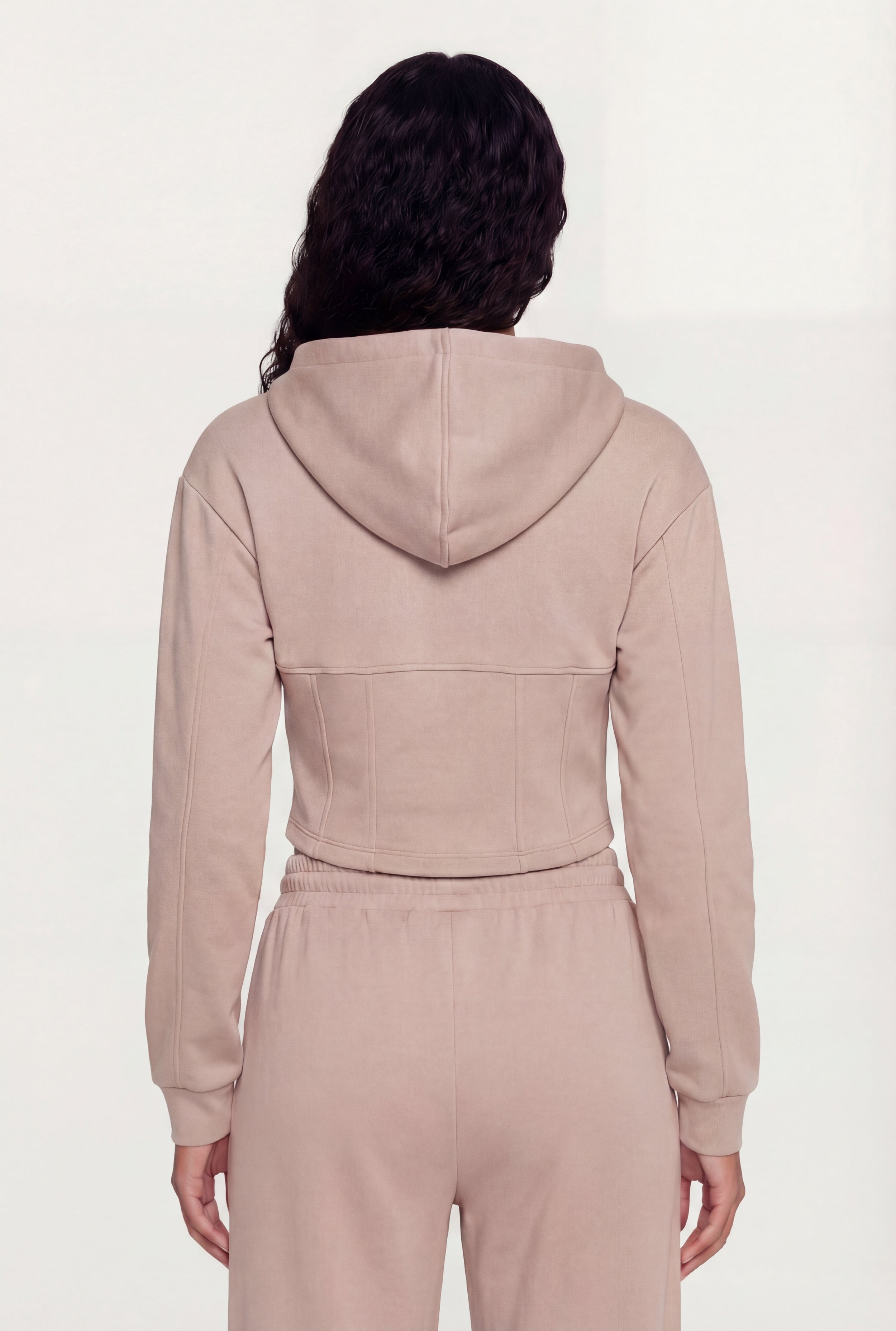 This cropped hoodie features a hooded neckline and a full zip front for easy layering. Its classic fit silhouette is enhanced with corset-style seam detailing for a modern edge. Crafted from scuba fabric, it offers a smooth, structured feel perfect for casual athleisure looks.