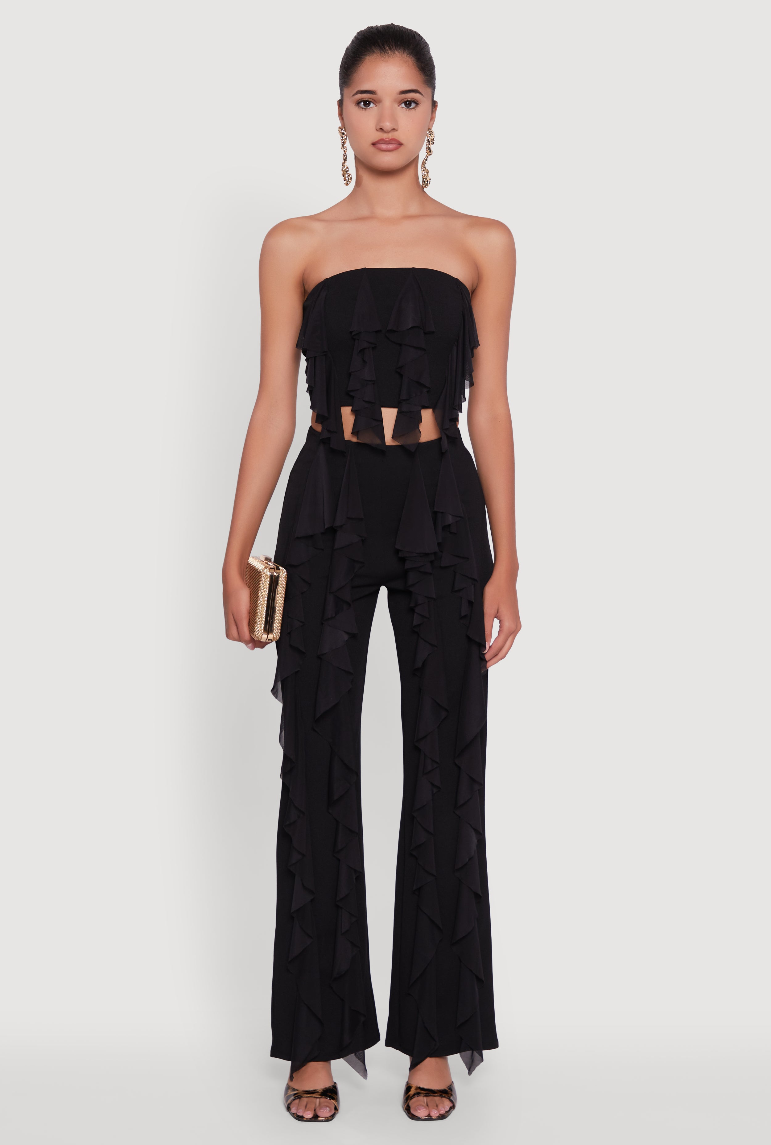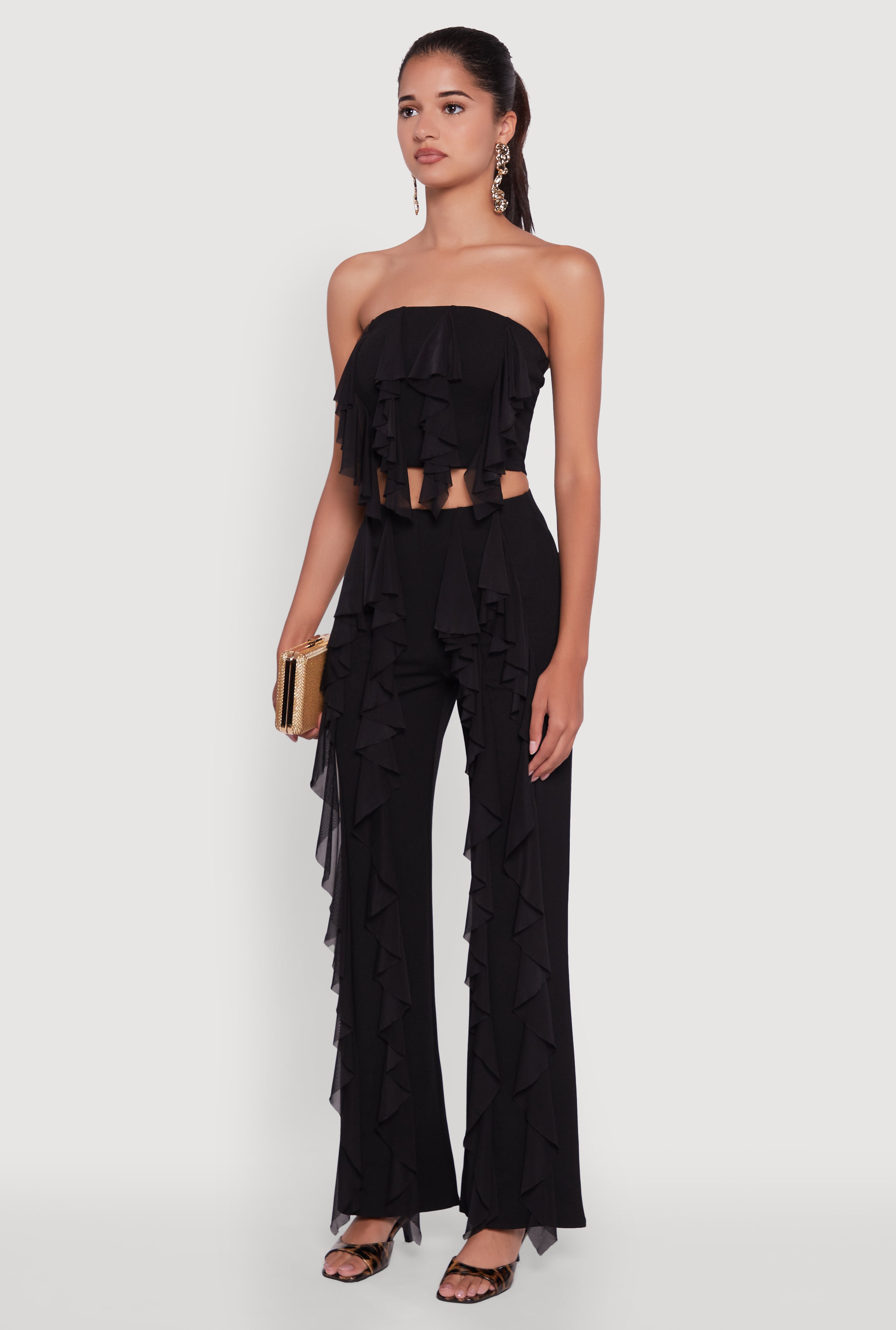 Turn heads with the effortlessly chic Ruffle Trim Crop Tube Top, your new go-to for casual days and nights out. This strapless classic fit top features playful ruffle detailing that adds a flirty touch to your look. Made from a comfy blend of crepe knit and mesh, it keeps things light and breathable while hugging your silhouette just right. Perfect for pairing with high-waisted jeans or skirts, this solid-colored crop top is designed to keep your style fresh and fun.