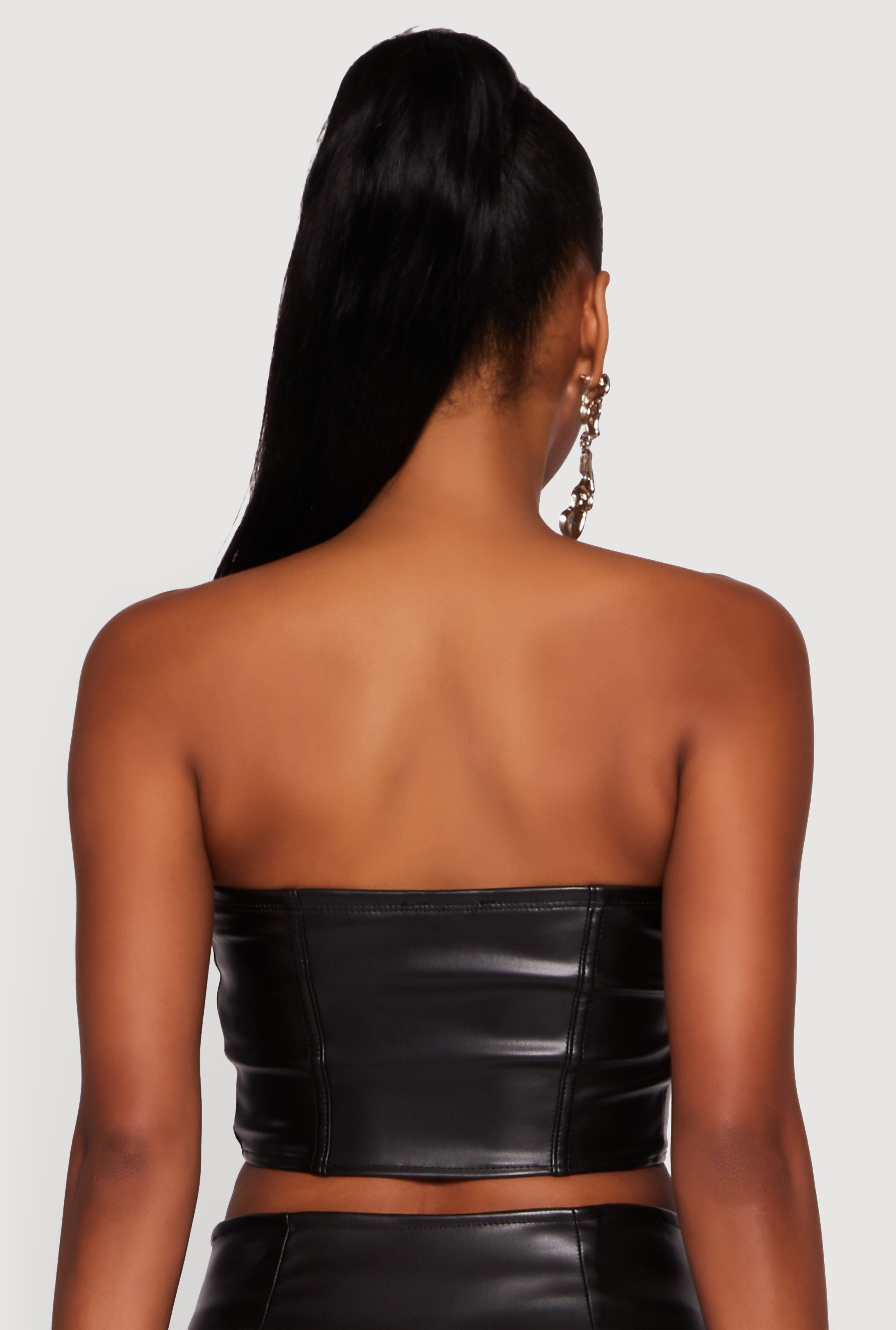 Turn heads and own the night with this Strapless Faux Leather Cropped Bustier Corset Top. Designed for those who love to mix edgy vibes with timeless style, this classic fit bustier hugs your silhouette perfectly while keeping things cool and confident. The smooth faux leather finish adds a bold touch, and the open back with zipper closure brings just the right amount of sass. Whether you're dressing up for a night out or adding a statement piece to your casual look, this crop top is your new go-to for effortless attitude and style.