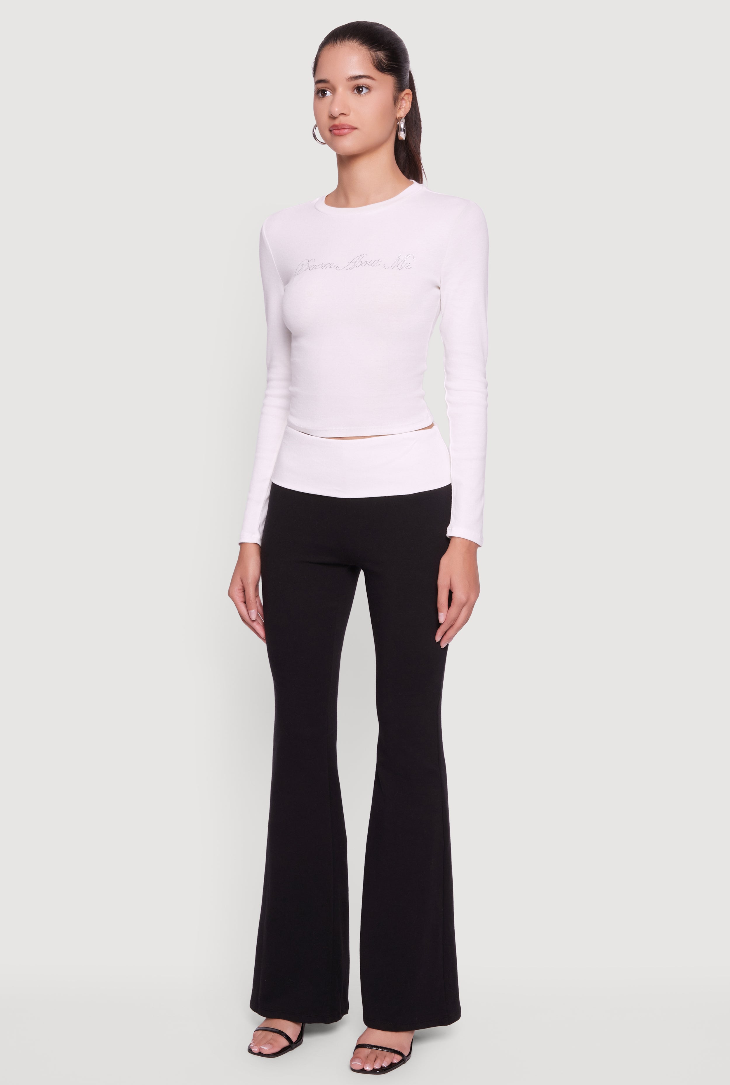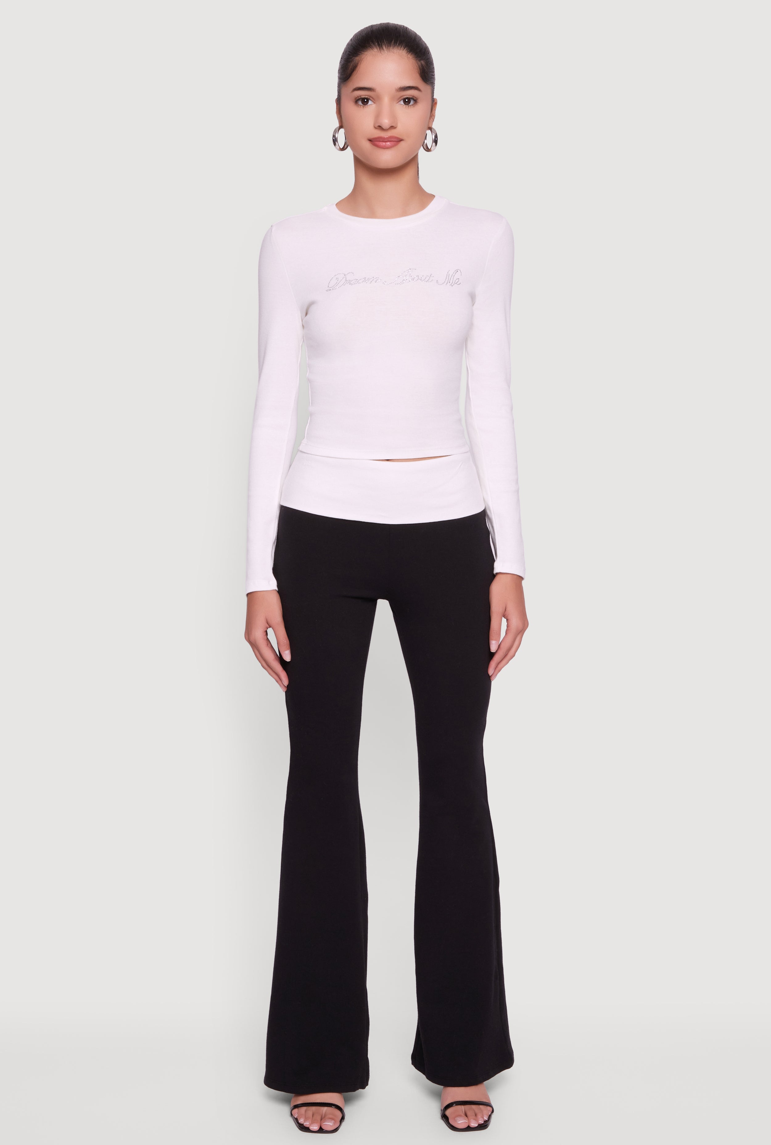 Step up your casual game with the Dream About Me Rhinestone Baby Tee. This classic fit long sleeve crop tee features a sparkling rhinestone graphic that says "Dream About Me," adding just the right amount of shine to your everyday look. With a comfy crew neck and a timeless silhouette, it’s the perfect piece to pair with your favorite jeans or skirts for effortless style that’s totally you.