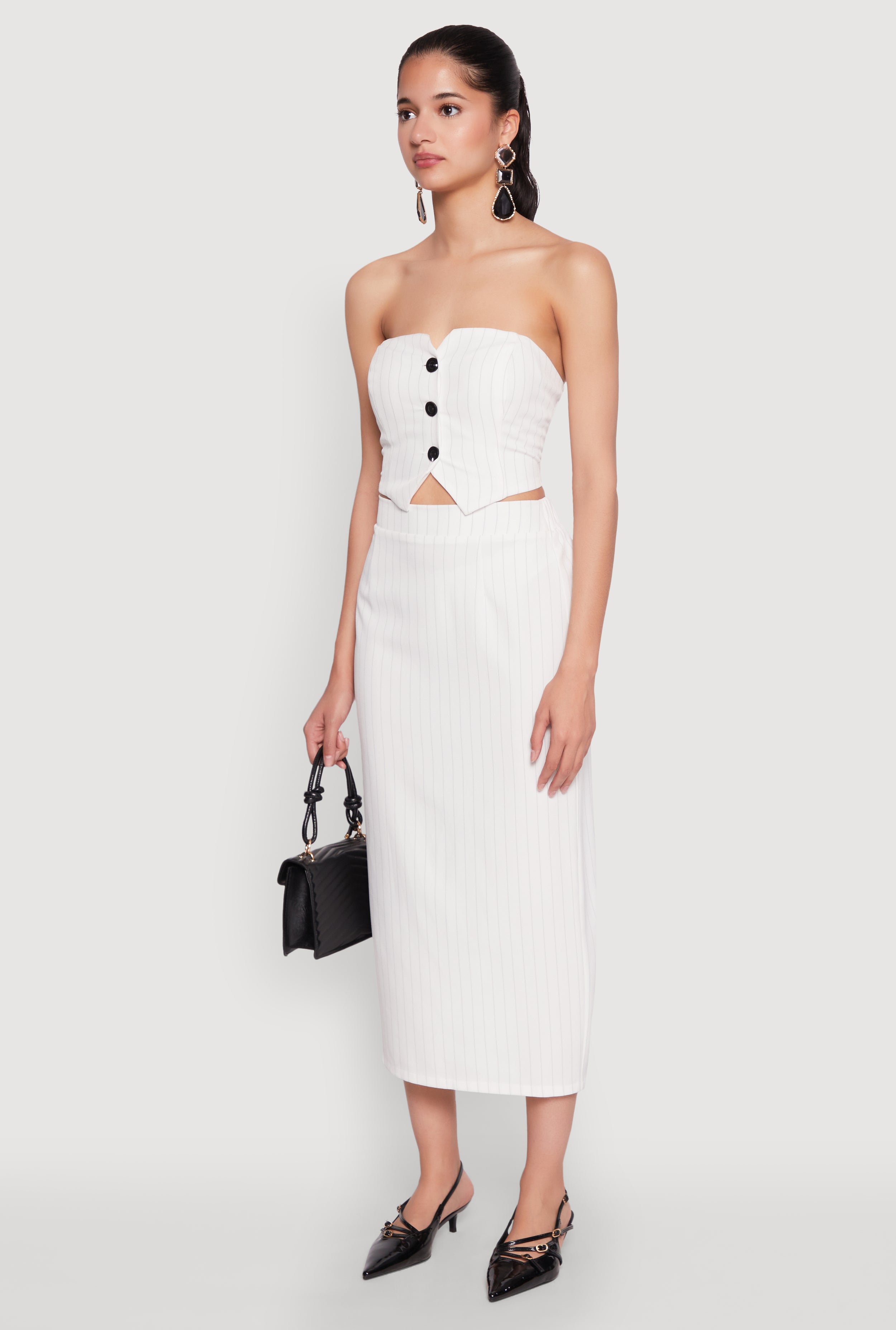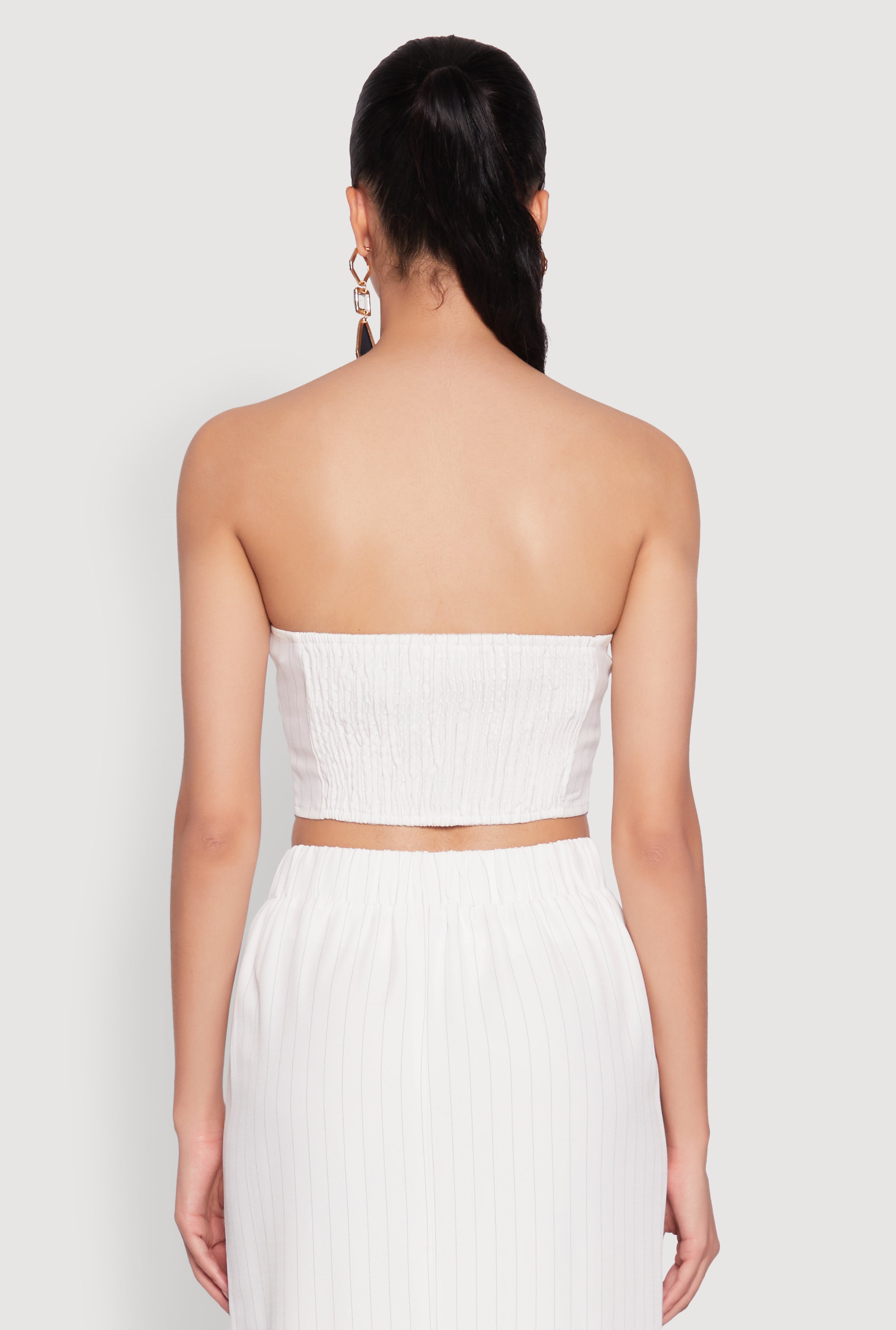 Get ready to turn heads with the Pinstripe Button Front Strapless Top, a perfect blend of flirty and chic. Its sweetheart neckline and cropped hem make it an instant favorite for sunny days or night outs. Designed with a classic fit and timeless silhouette, this tube top offers effortless style that keeps you feeling confident and cool. Whether you're dressing up for a set or just want to add a pop of pattern to your wardrobe, this top is your new go-to piece.