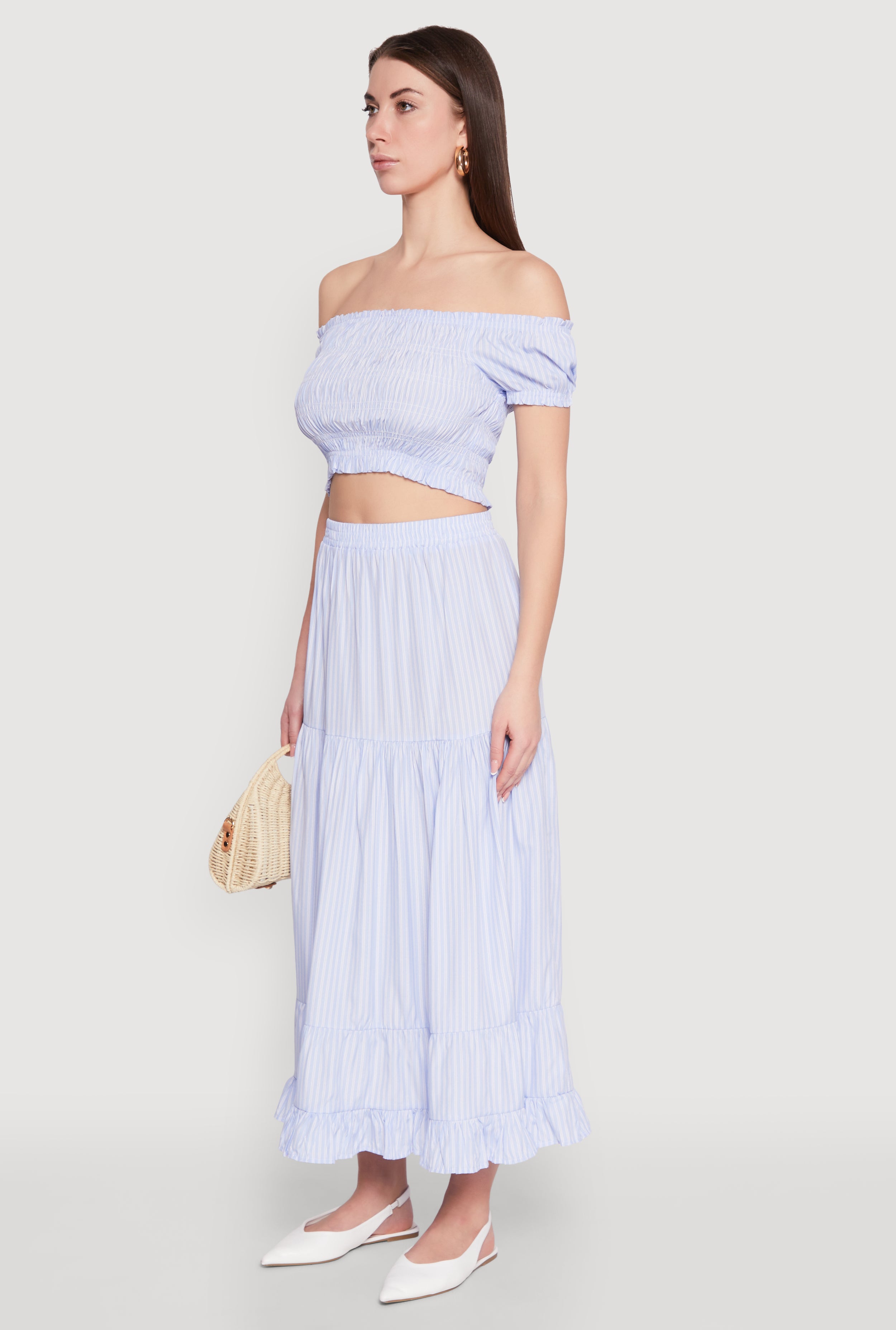Get ready to turn heads with the Almost Famous Pinstripe Smocked Crop Top. This effortlessly chic blouse combines a classic fit with a timeless silhouette, making it your go-to piece for any casual or dressy occasion. The off-the-shoulder neckline adds a flirty touch, while the puff short sleeves bring a playful vibe. Perfect for pairing with high-waisted jeans or skirts, this cropped hem top is all about showing off your style and confidence. Whether you're hanging out with friends or heading to a fun event, this top is designed to keep you looking fresh and feeling fabulous.