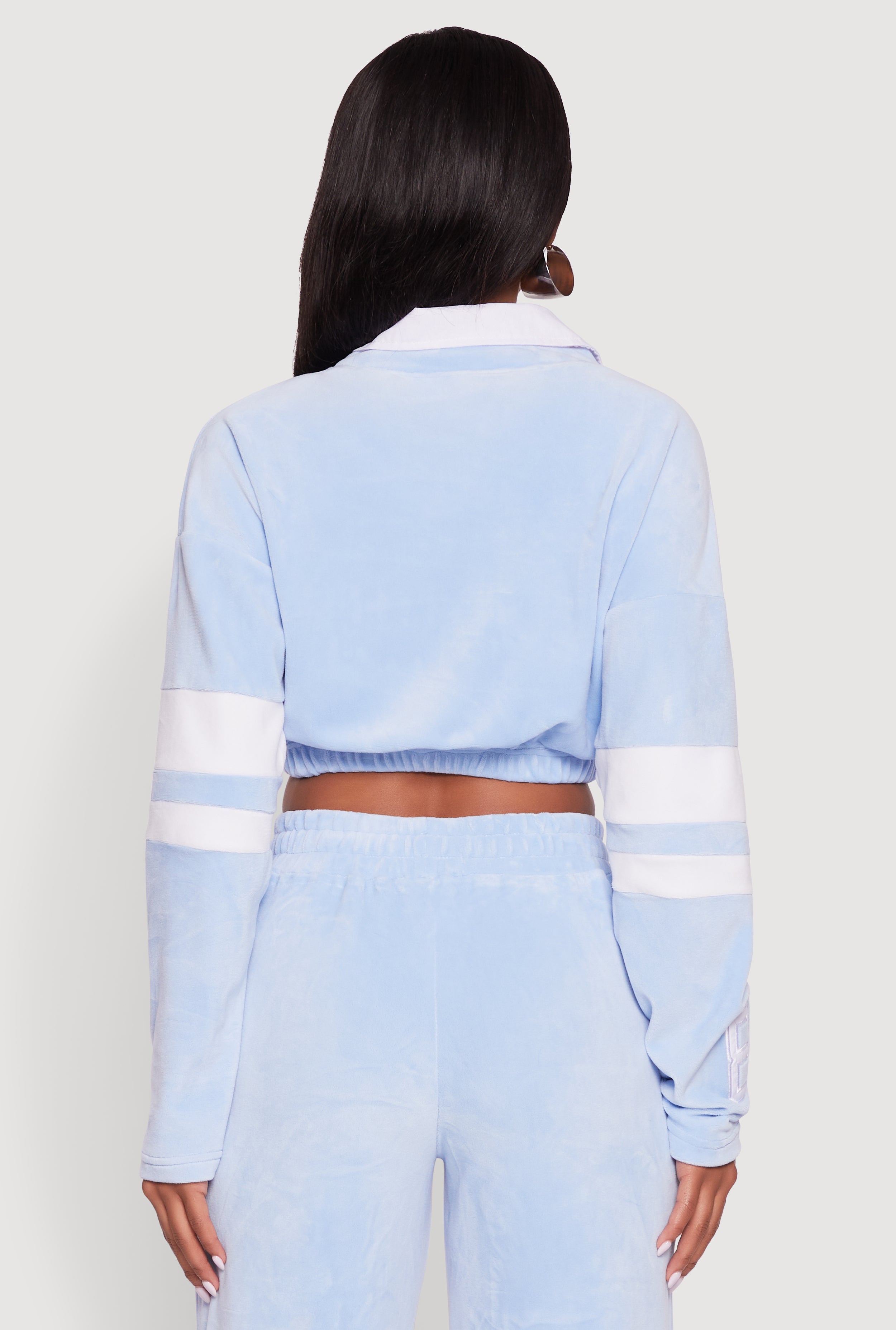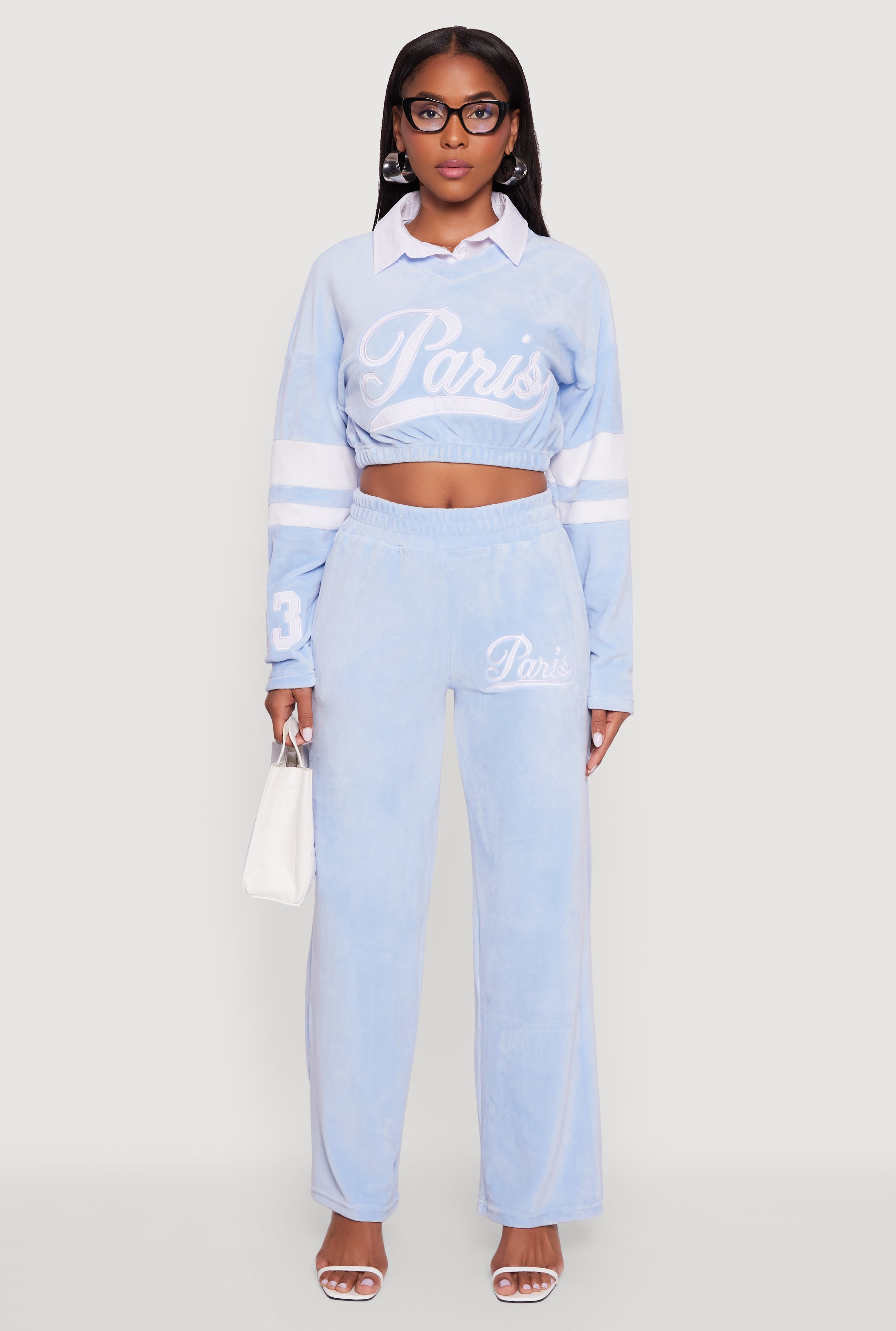Step up your casual game with the Velour Paris Embroidered Graphic Cropped Sweatshirt. This cozy yet chic piece blends soft velour fabric with a classic fit and a trendy cropped length that flatters every shape. Featuring eye-catching embroidered graphics and varsity stripe details, it gives your everyday look a stylish edge. Perfect for lounging or hitting the streets, this sweatshirt brings effortless athleisure vibes with a touch of Parisian flair.